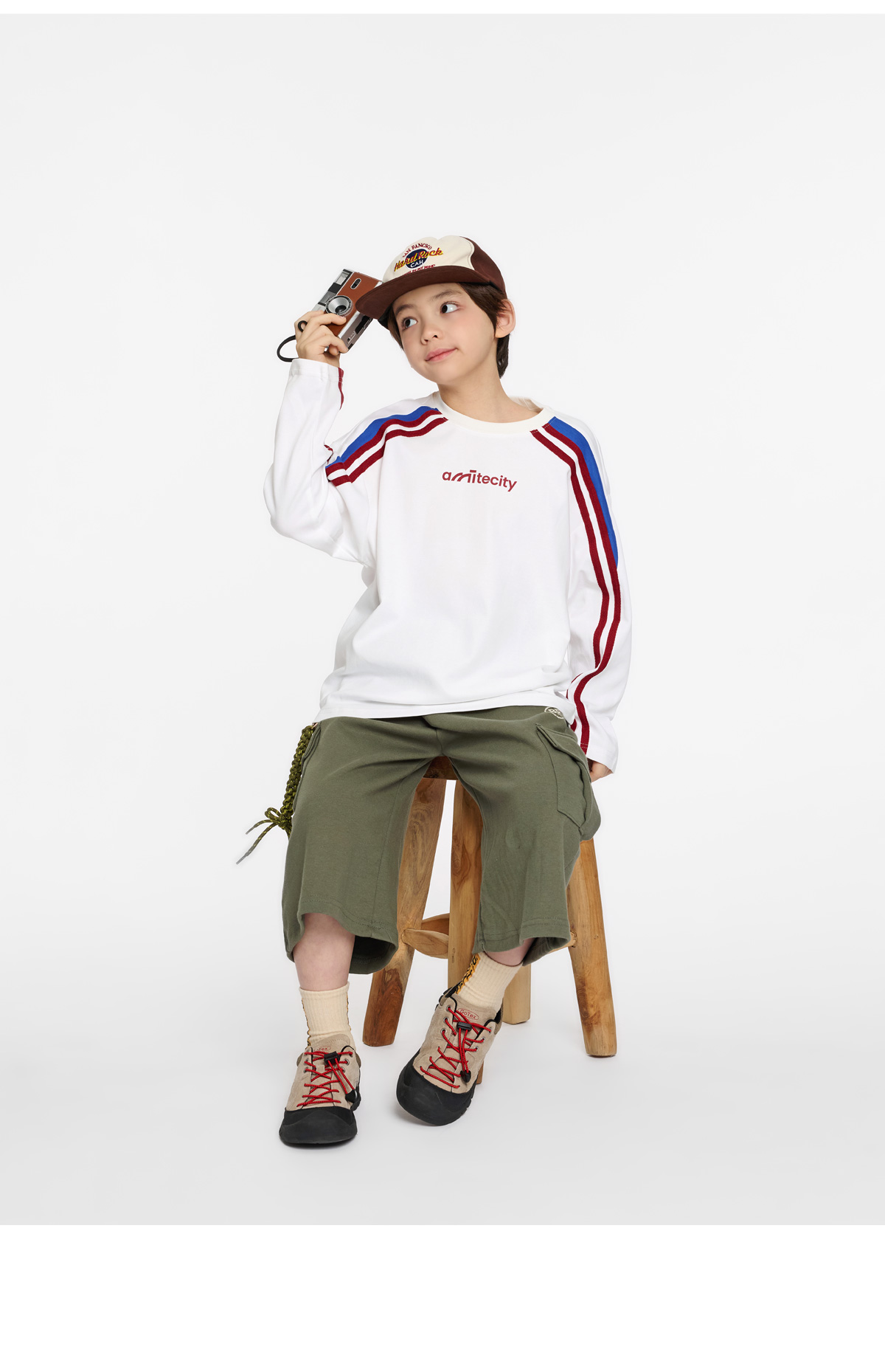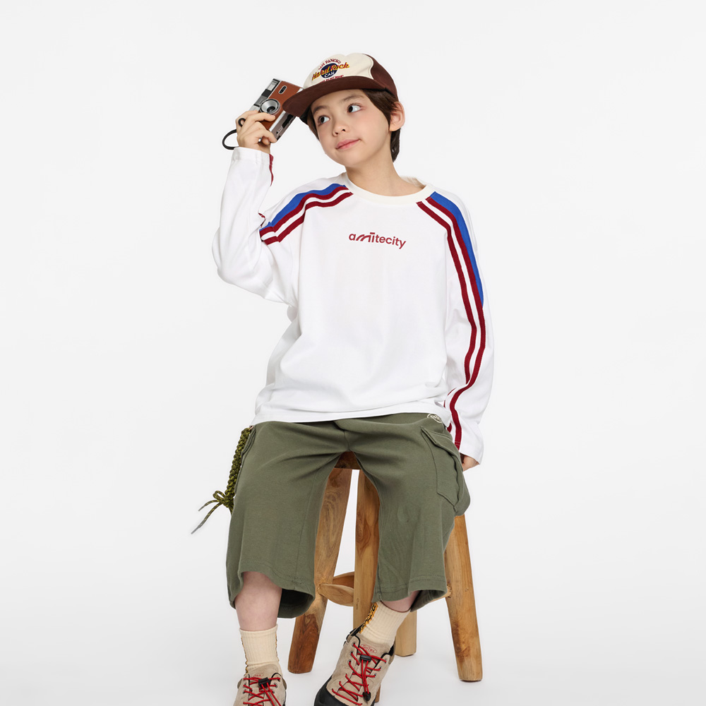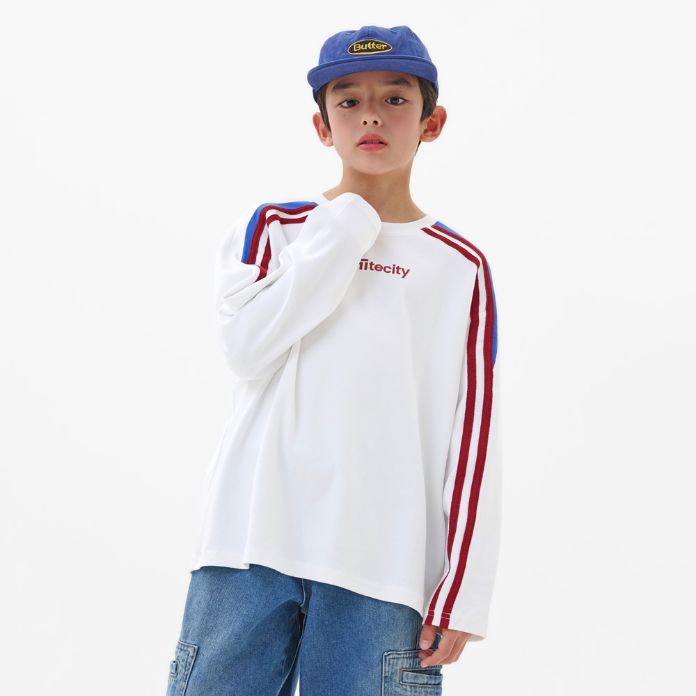 깔끔한 아이보리 바탕에 소매 라인 배색이 포인트가 되는 티셔츠예요.