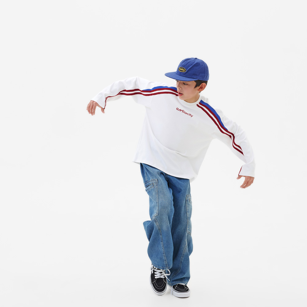 어깨부터 소매까지 이어지는 컬러 스트라이프가 전체 룩에 경쾌한 리듬을 더해줘요.