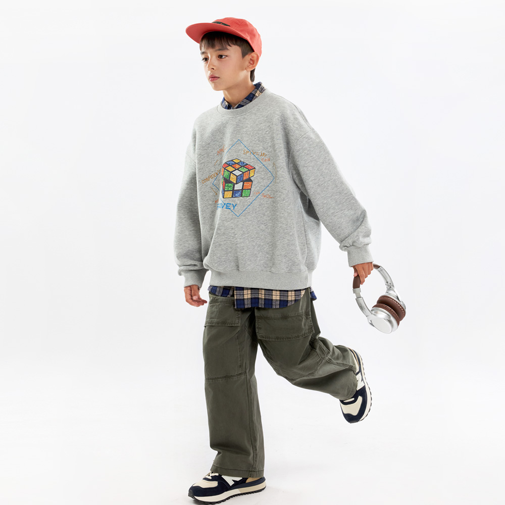 클래식한 멜란지 바탕에 컬러풀 나염으로 포인트를 준 맨투맨이에요