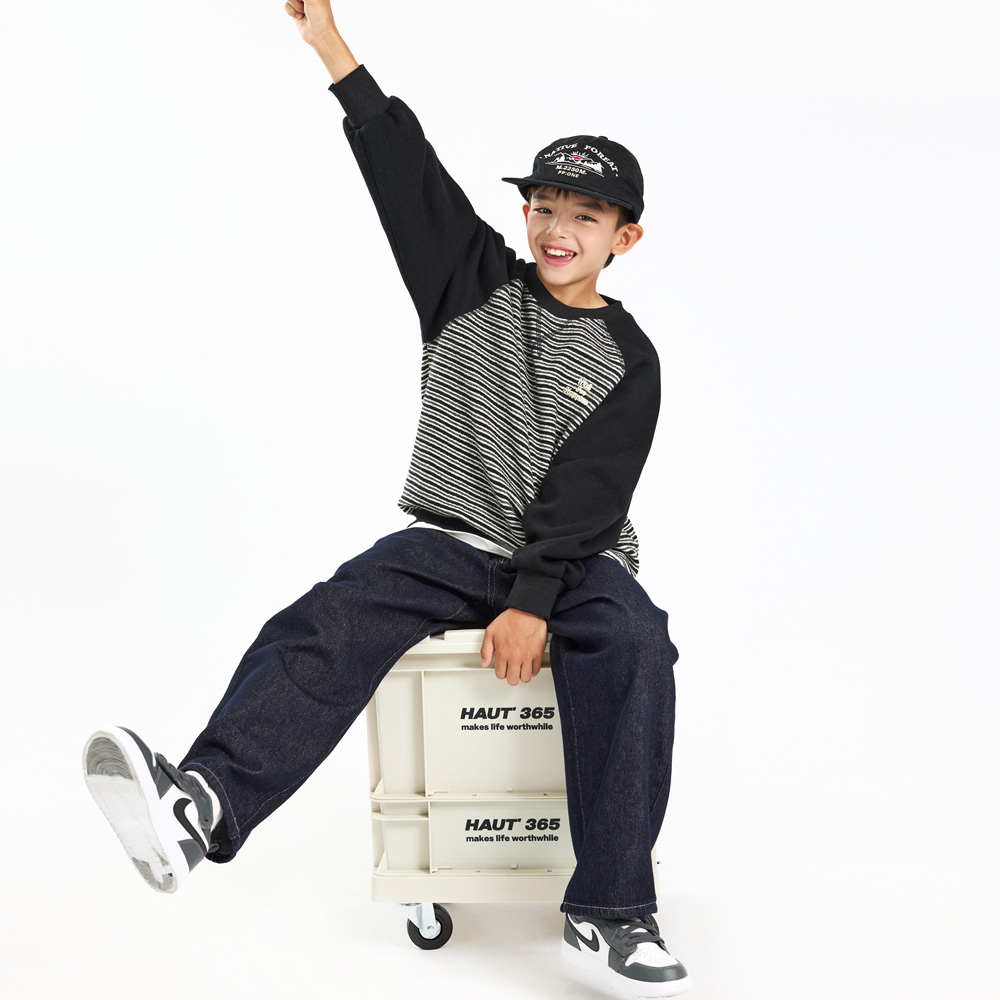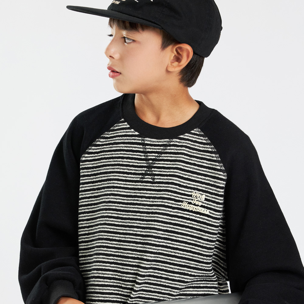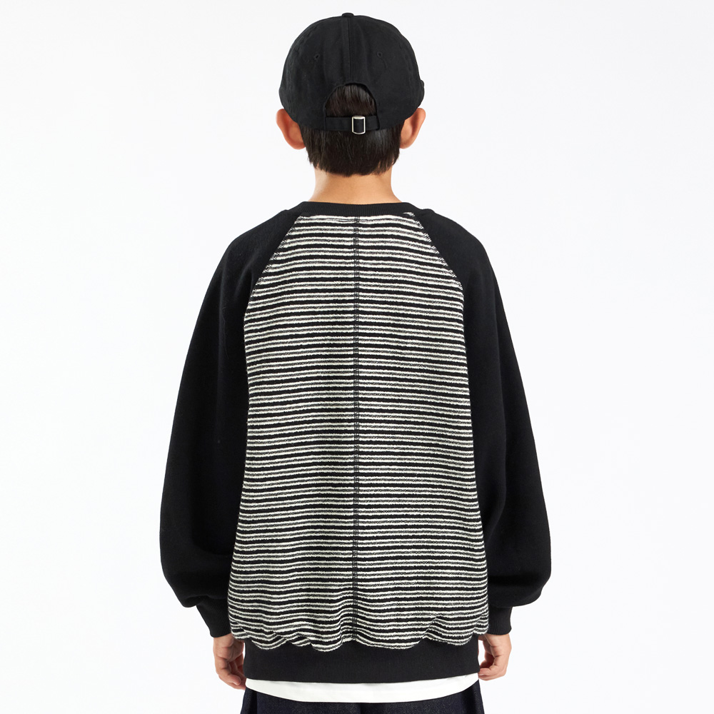 스트라이프 원단과 배색 소매가 조화를 이루는 맨투맨이에요.