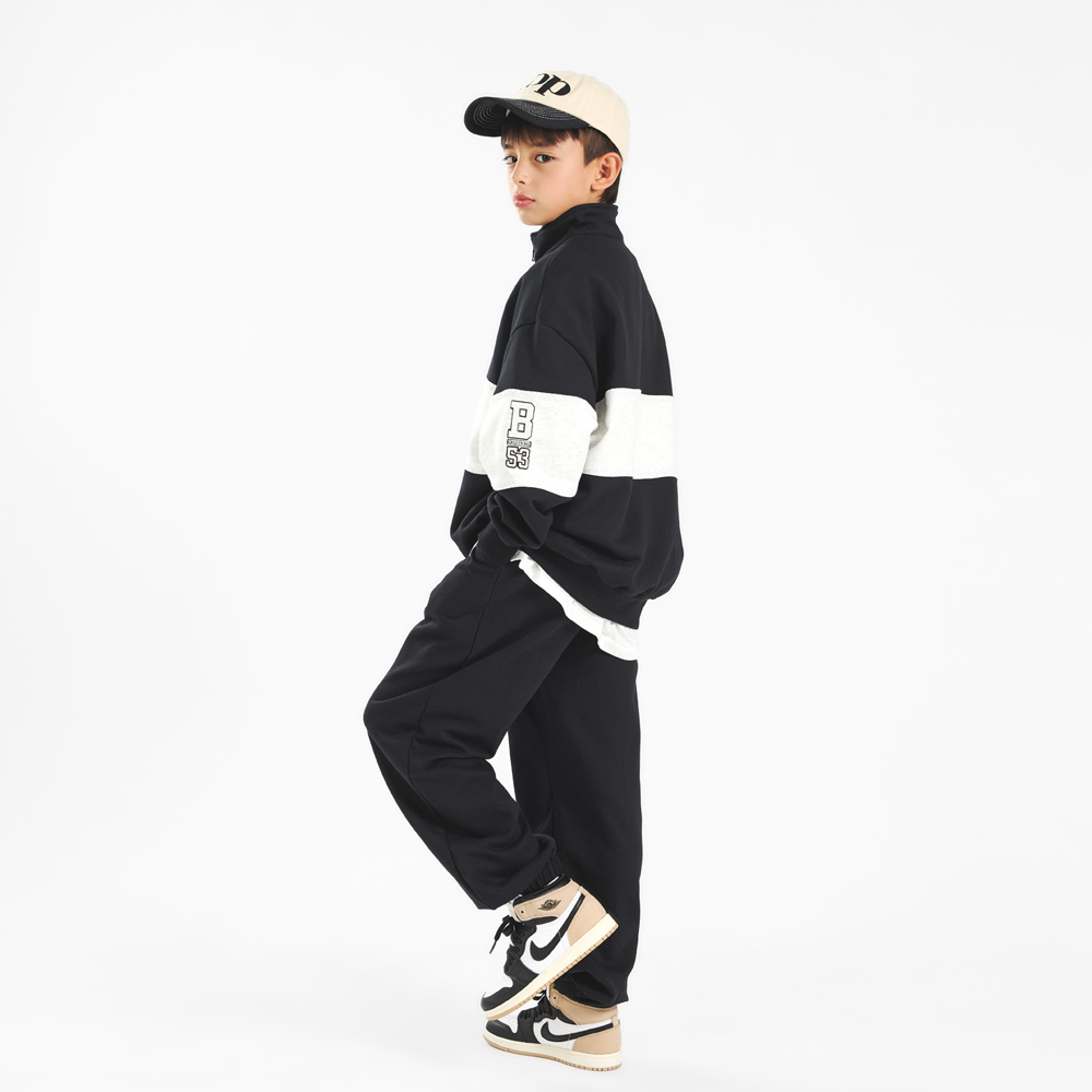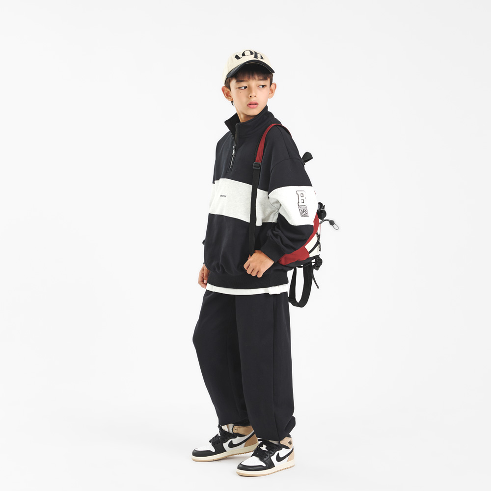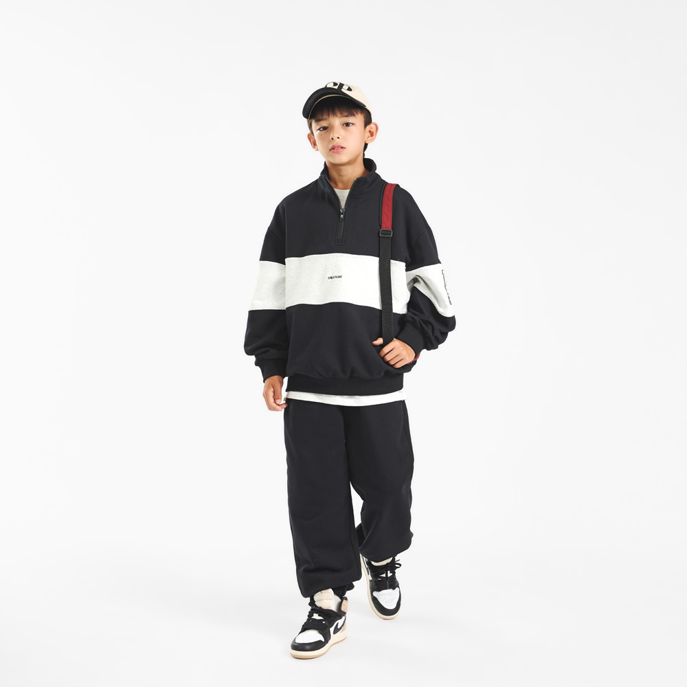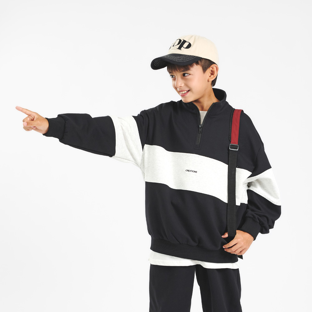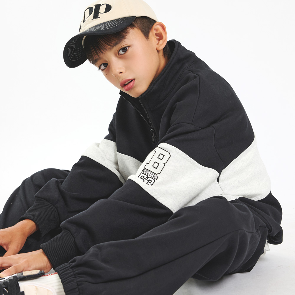 배색 포인트가 돋보이는 반집업 상하세트예요.