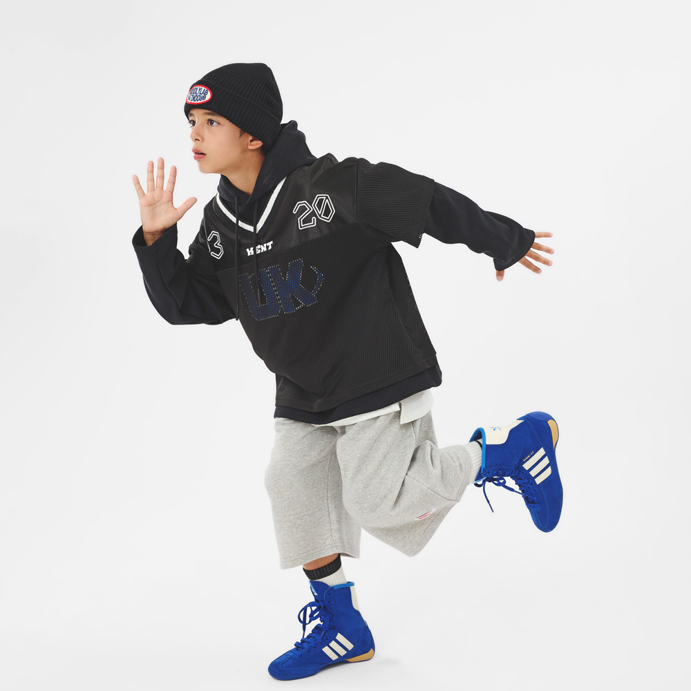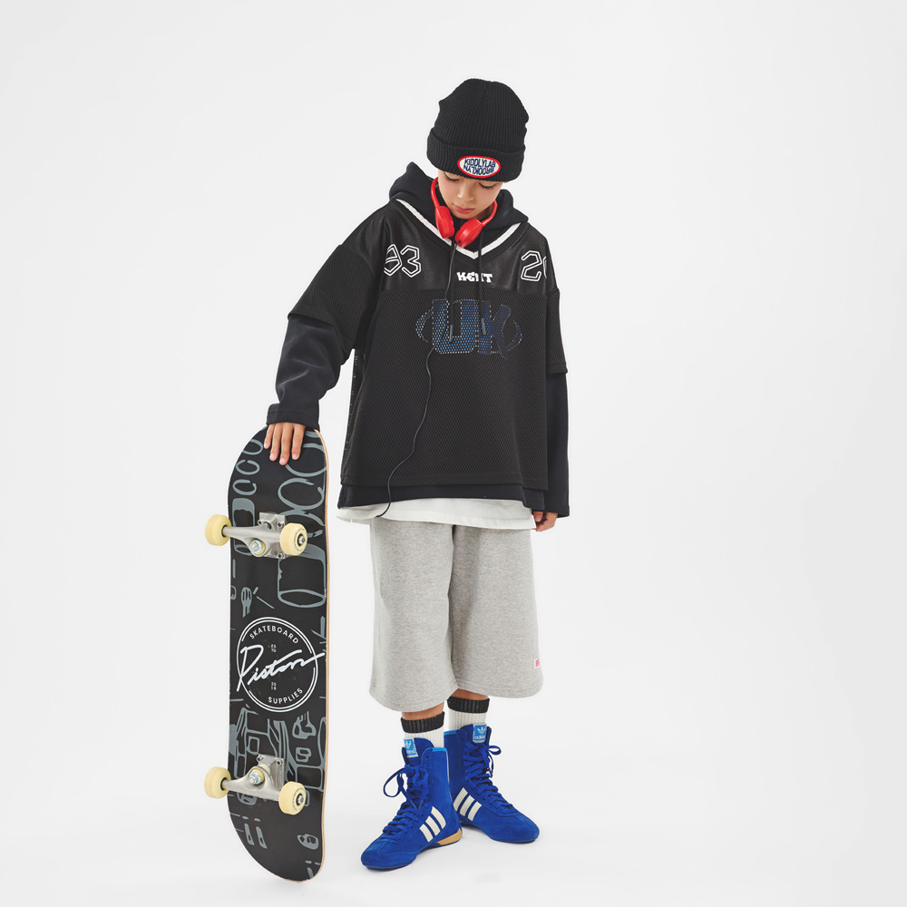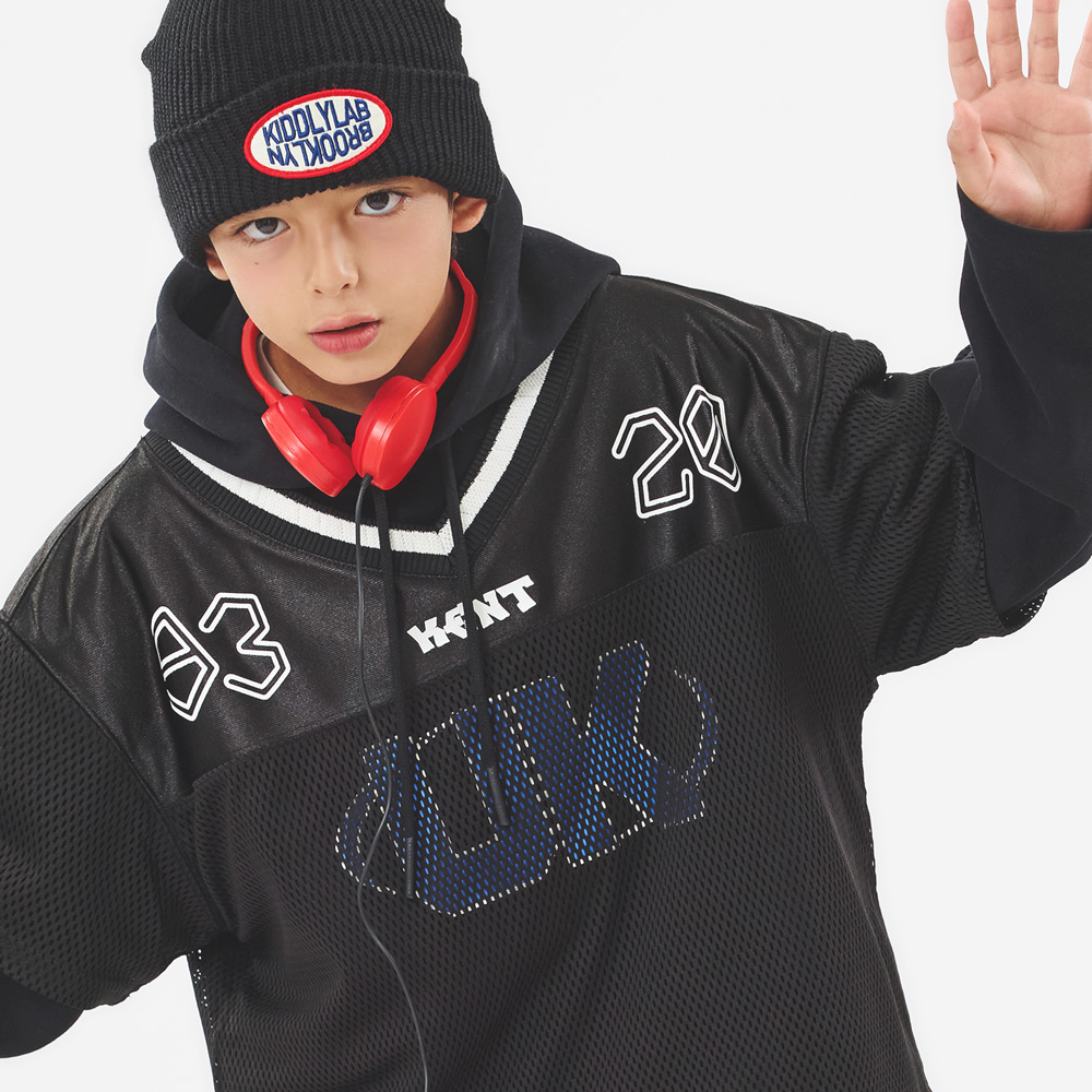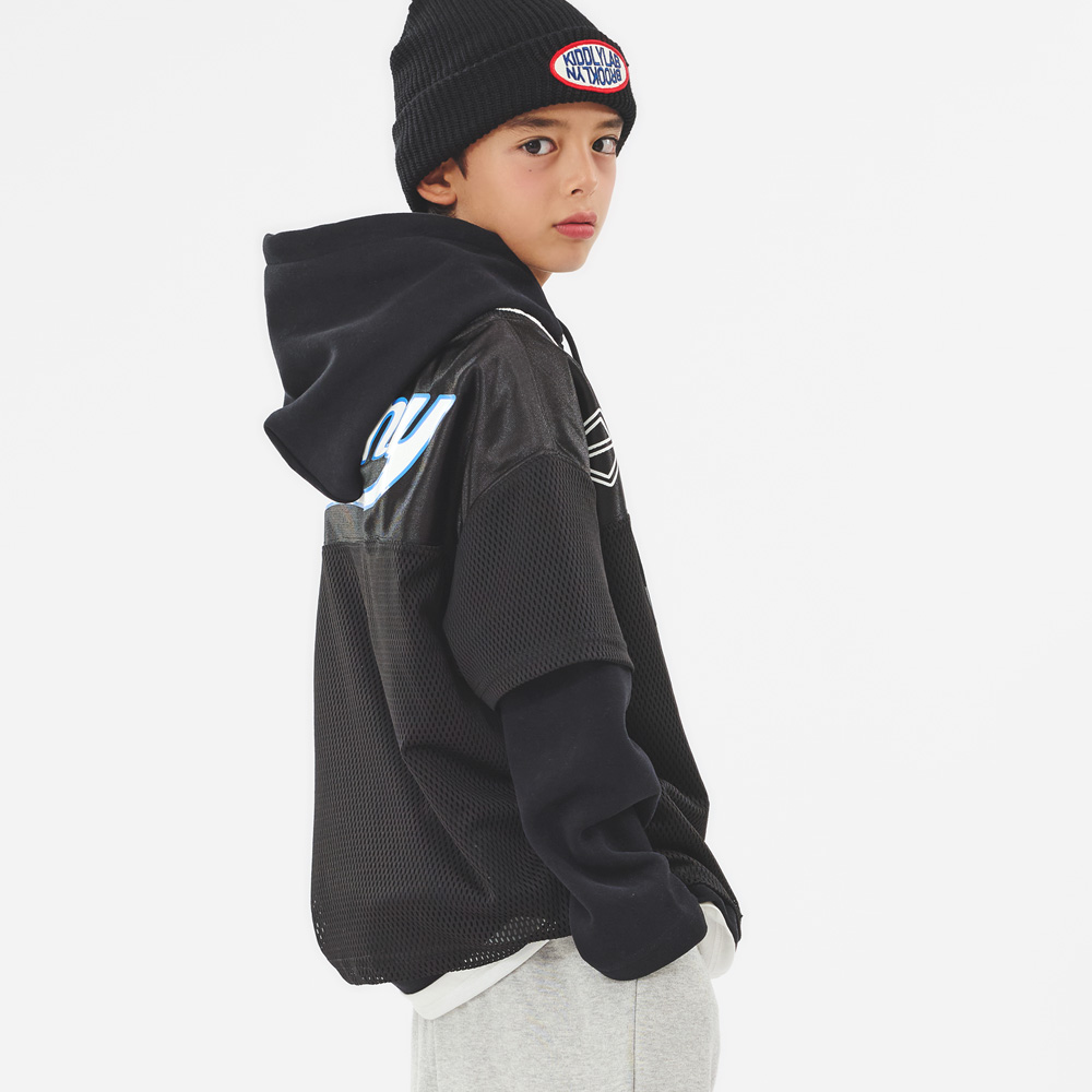 스포티한 메시 티셔츠 위로 후디를 더한 유니크한 레이어드 디자인이에요.
