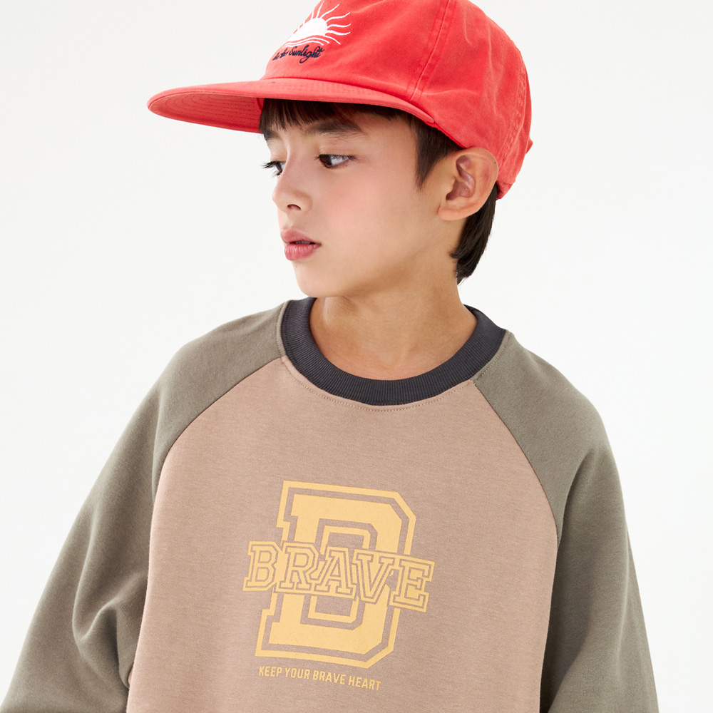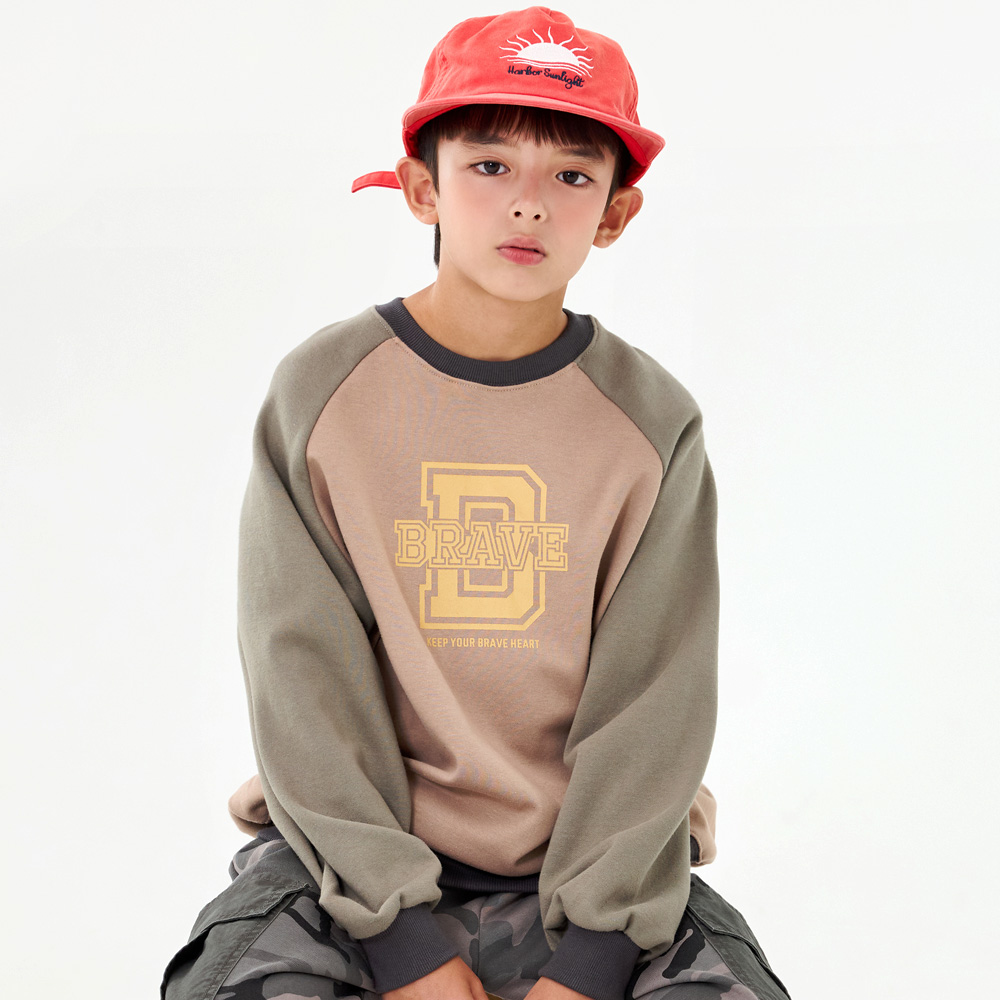 전면 영문 나염과 소매 배색이 돋보이는 레글런 타입의 맨투맨이에요