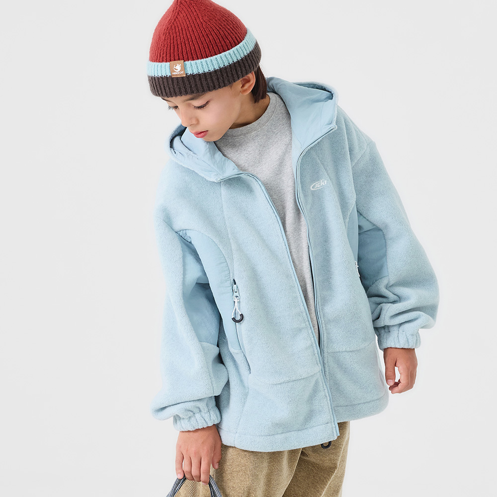 은은한 스카이 컬러가 산뜻하게 어울리는 플리스 후드 점퍼예요.