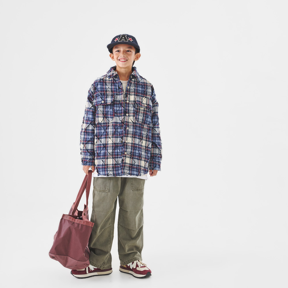 네이비 톤의 체크 패턴 위에 퀼팅 디테일이 더해져.