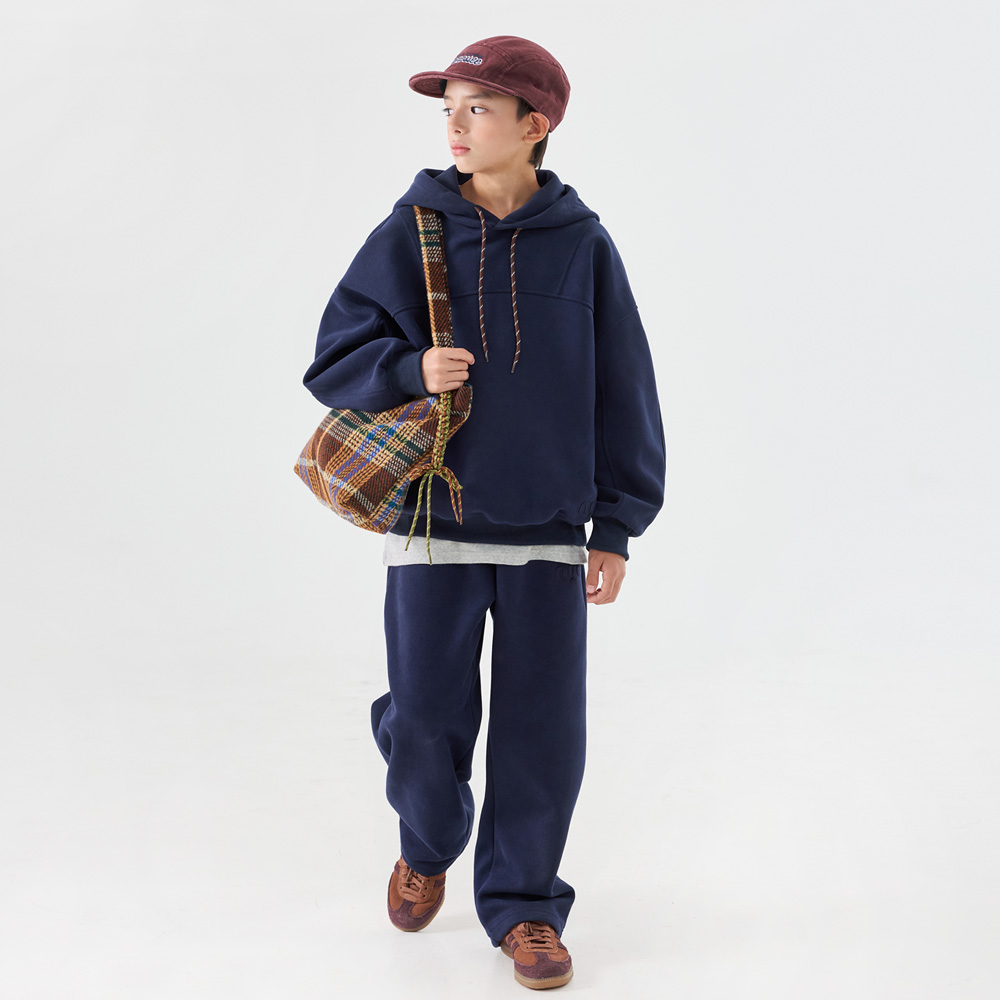 절개 디테일이 돋보이는 후드맨투맨과 트레이닝 팬츠 구성의 상하셋업이에요