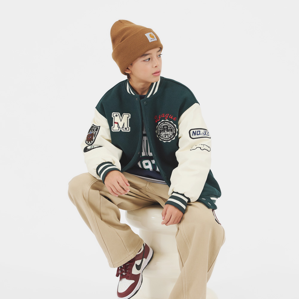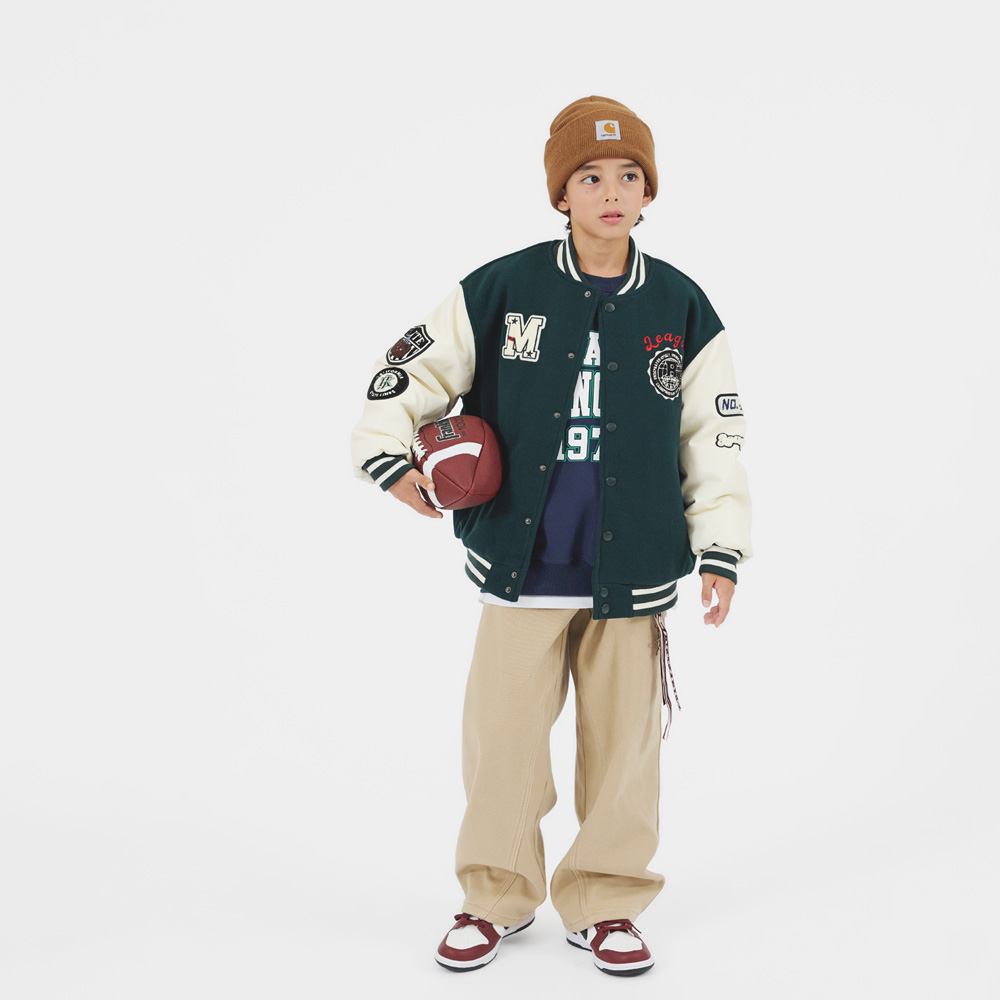 딥그린 바디와 아이보리 소매 배색이 멋스러운 퀼팅 점퍼예요.