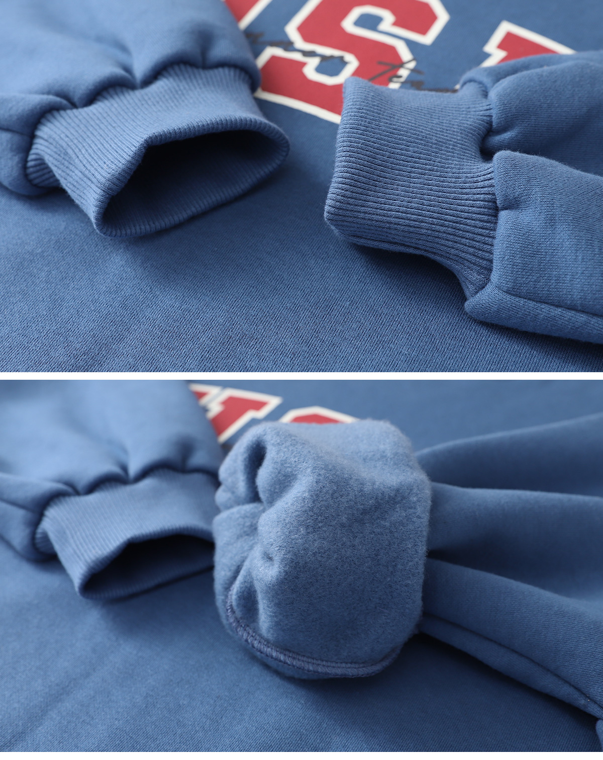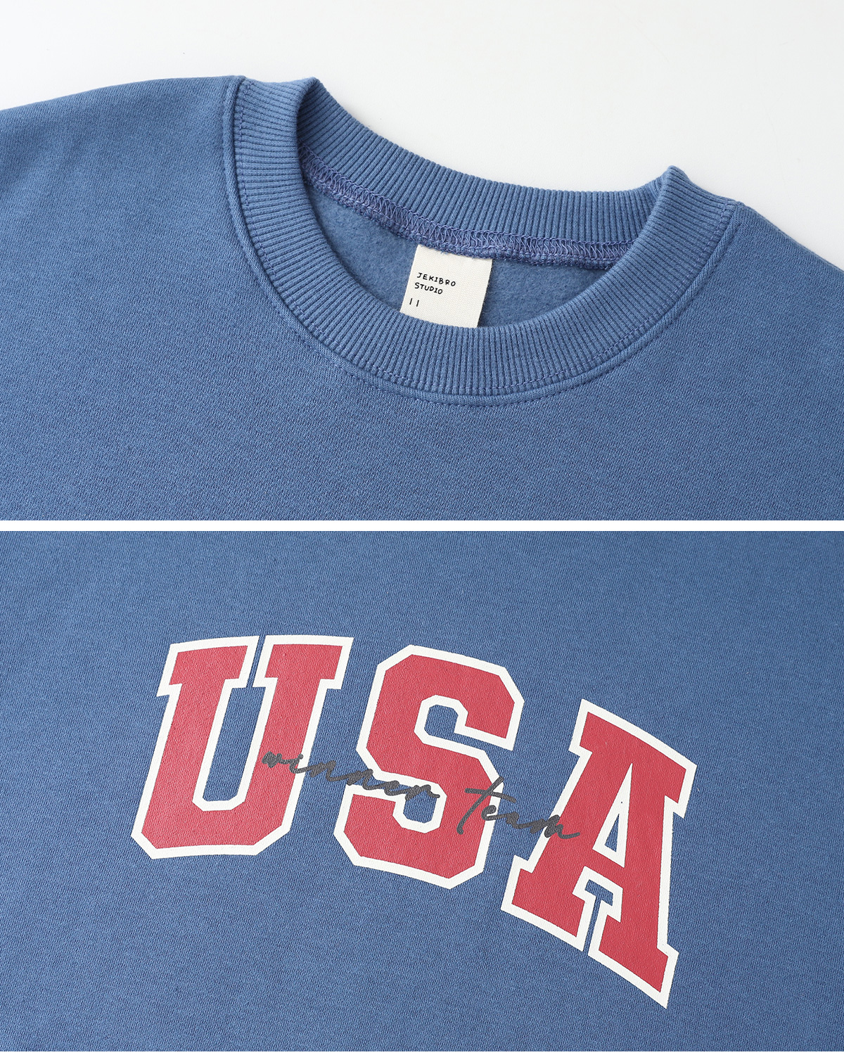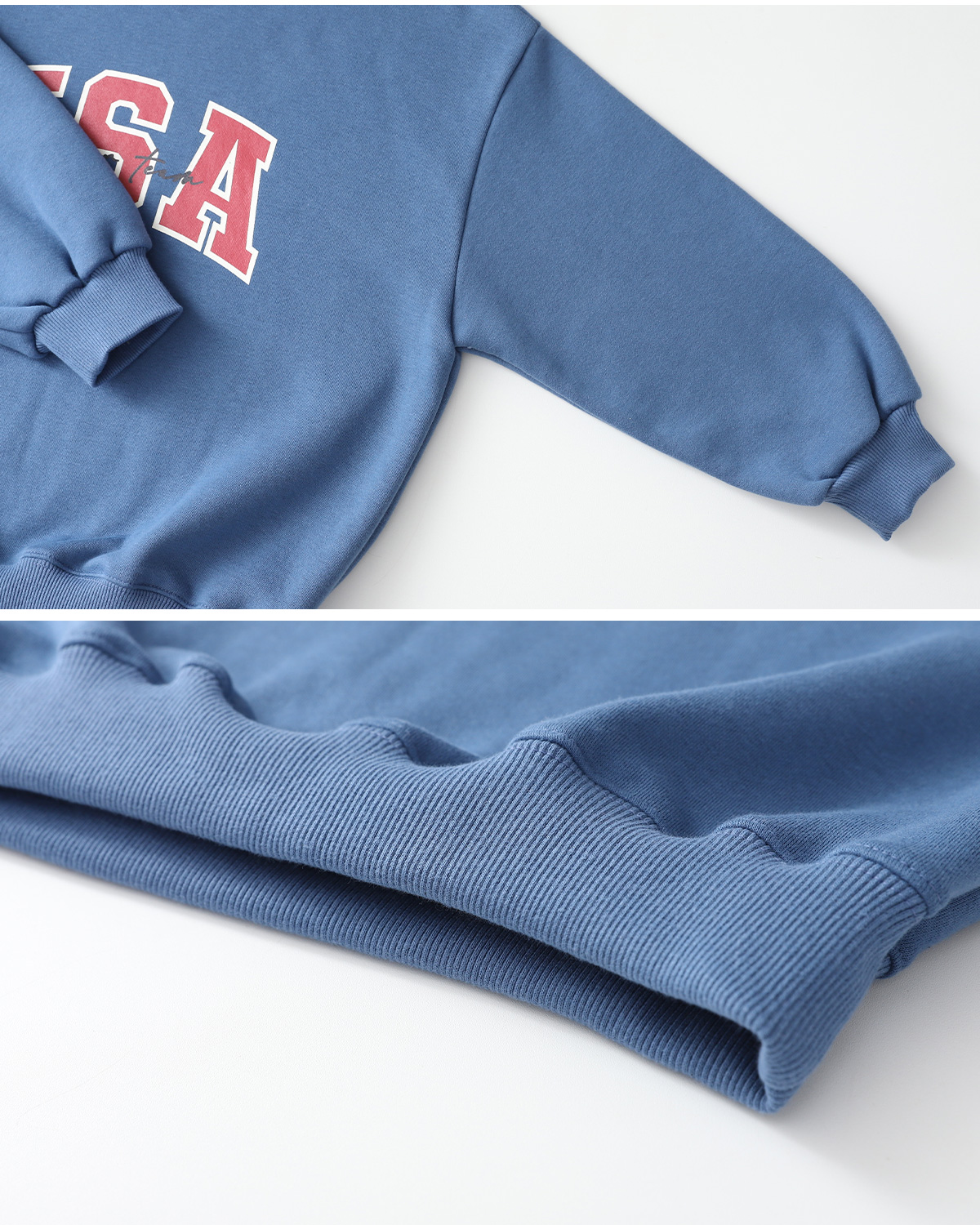 선명한 블루 컬러가 돋보이는 기모 맨투맨이에요.