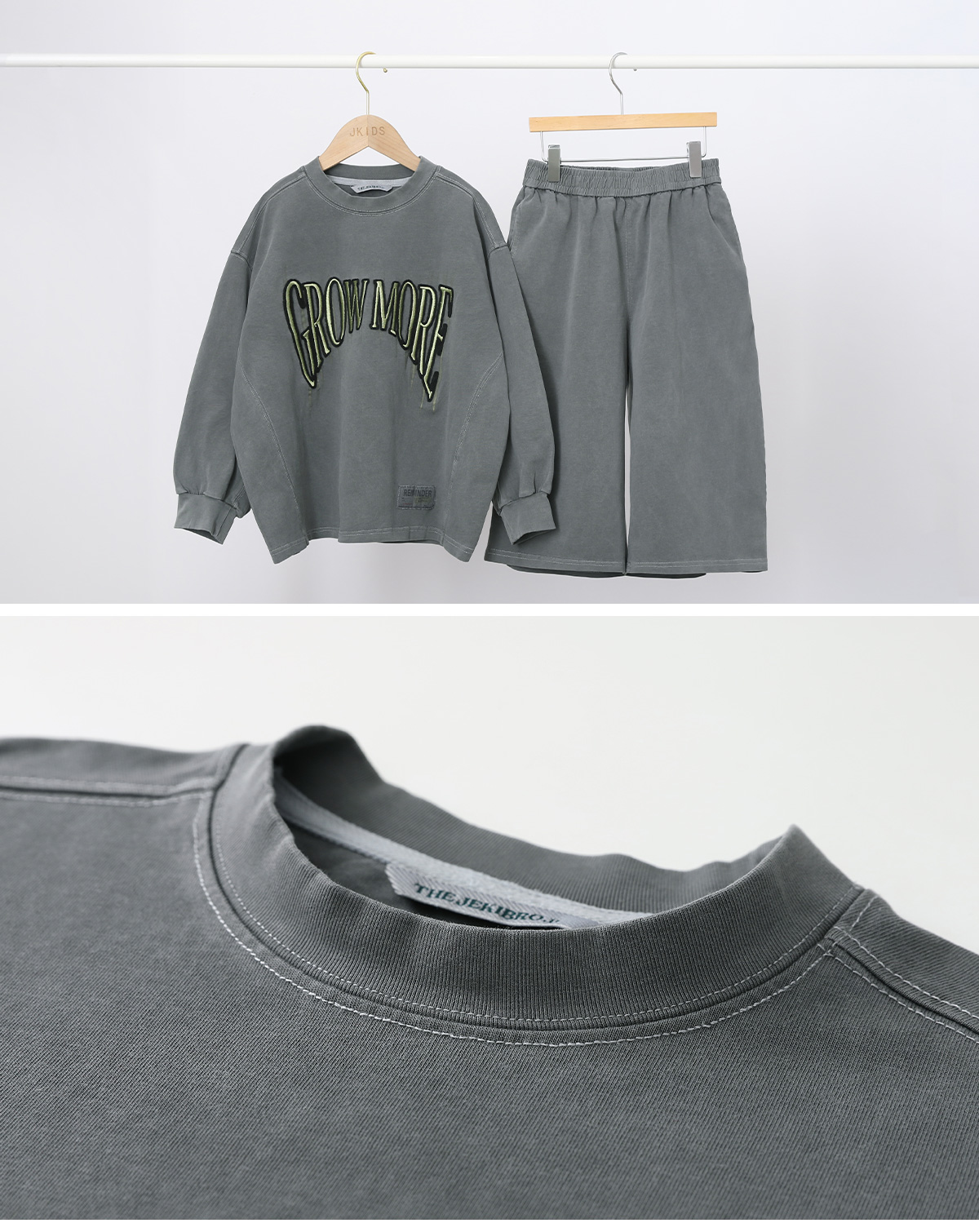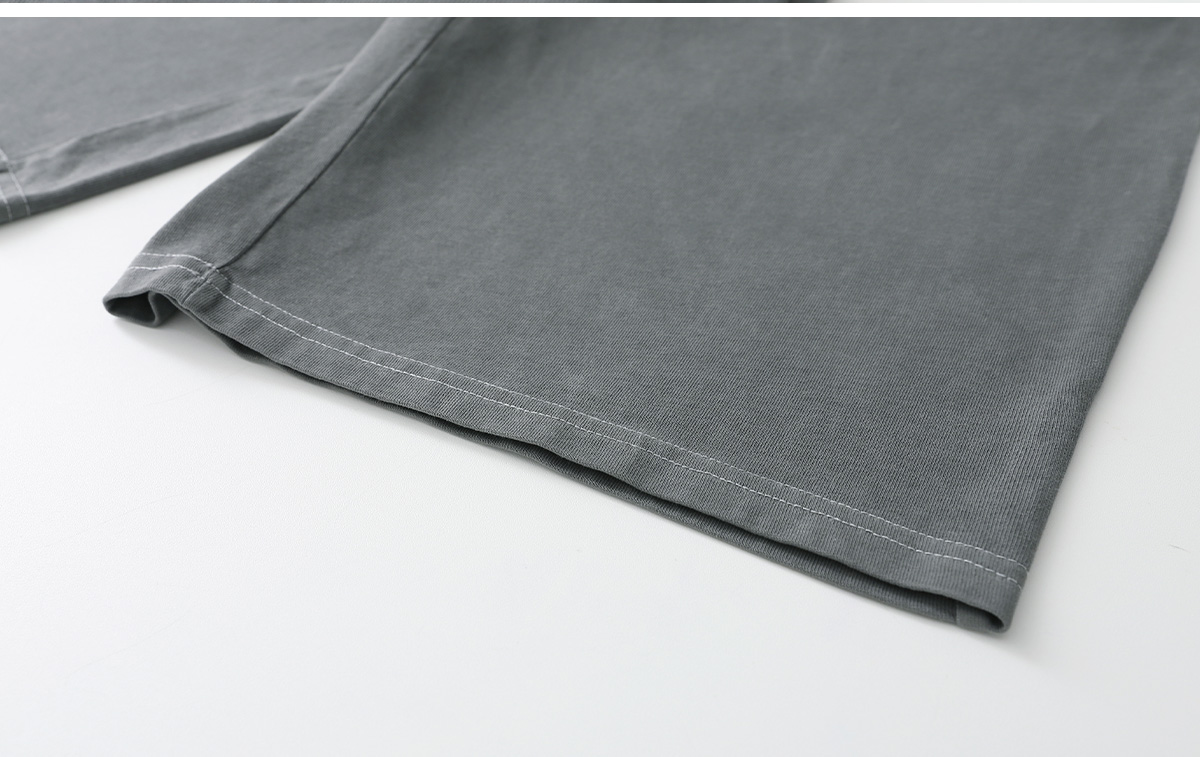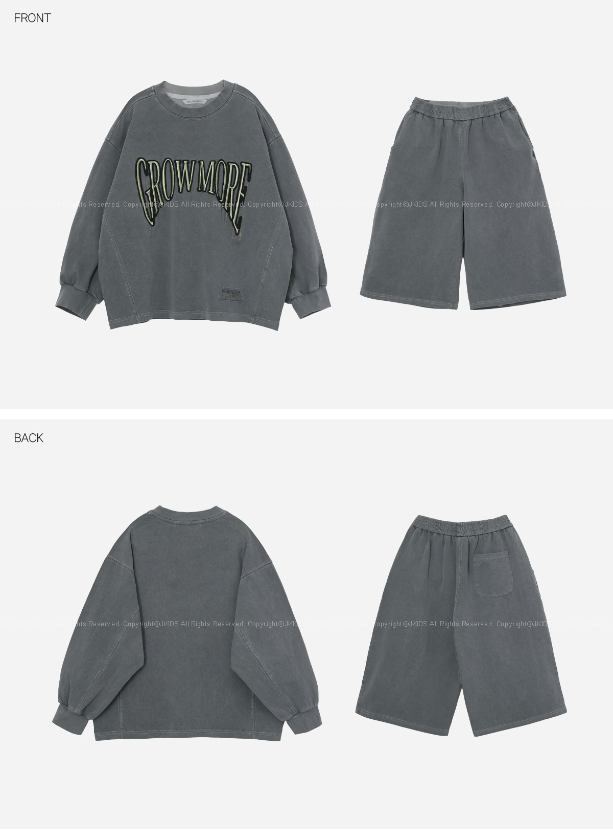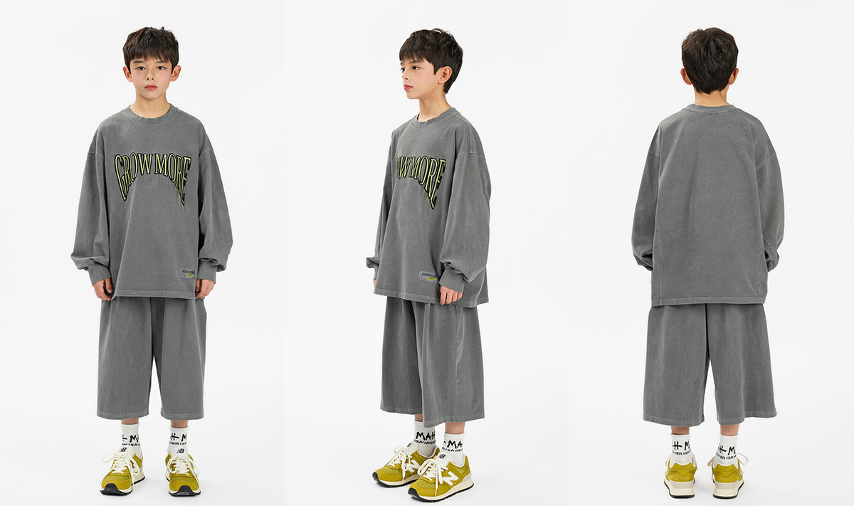 빈티지한 피그먼트 워싱이 매력적인 긴소매 티셔츠와 버뮤다팬츠 구성의 상하 셋업이에요.