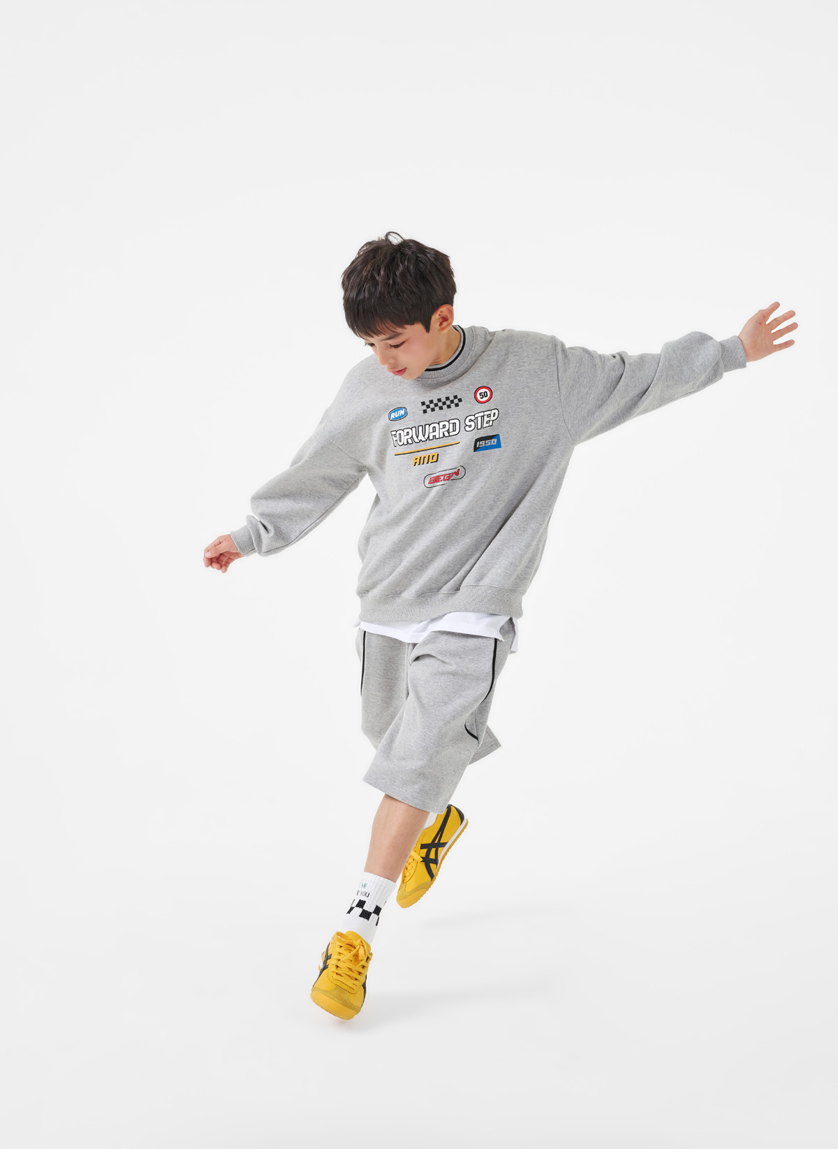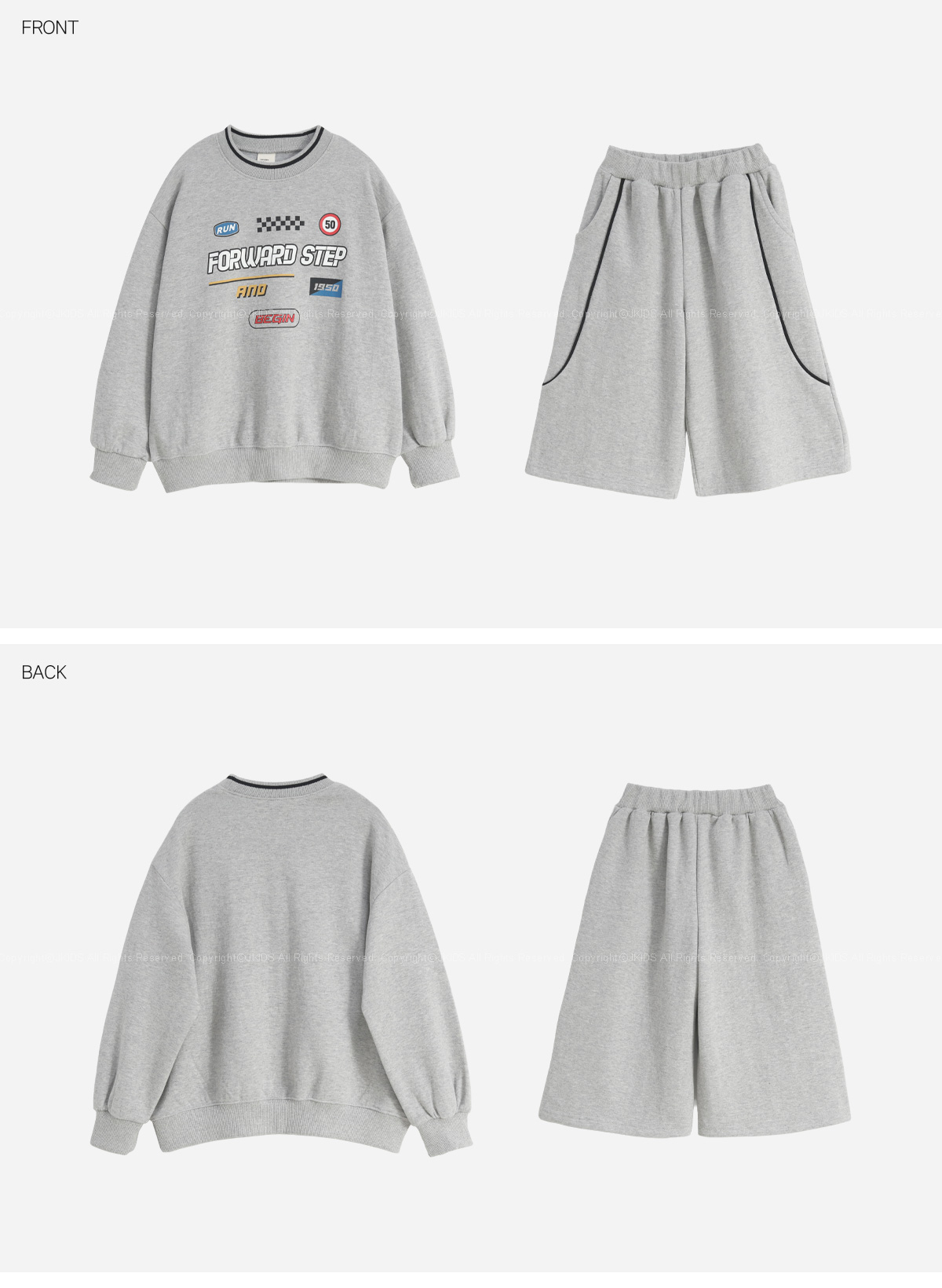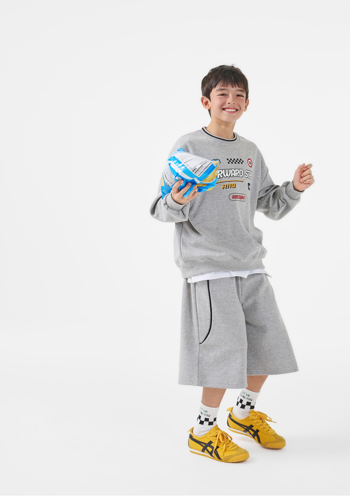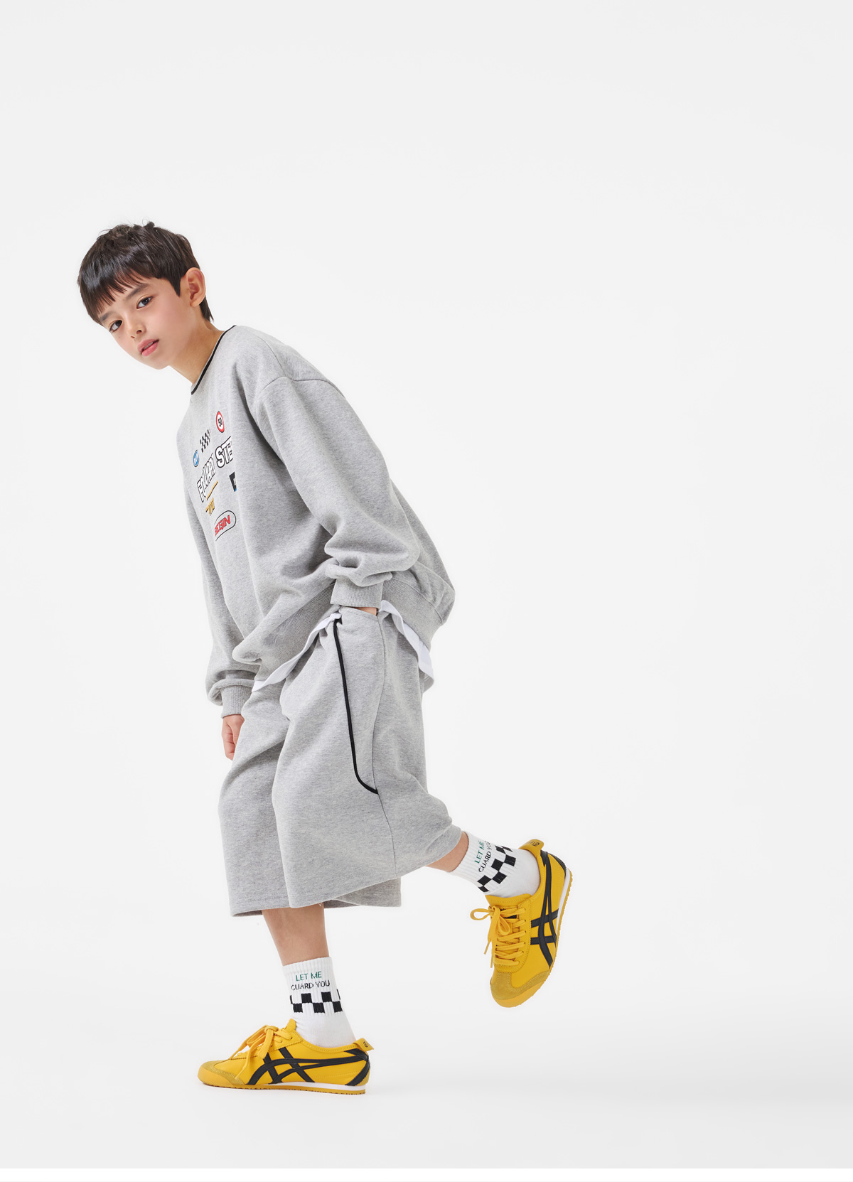 그래픽 포인트가 살아 있는 상의와 버뮤다 팬츠를 함께 구성한 상하 세트예요.
