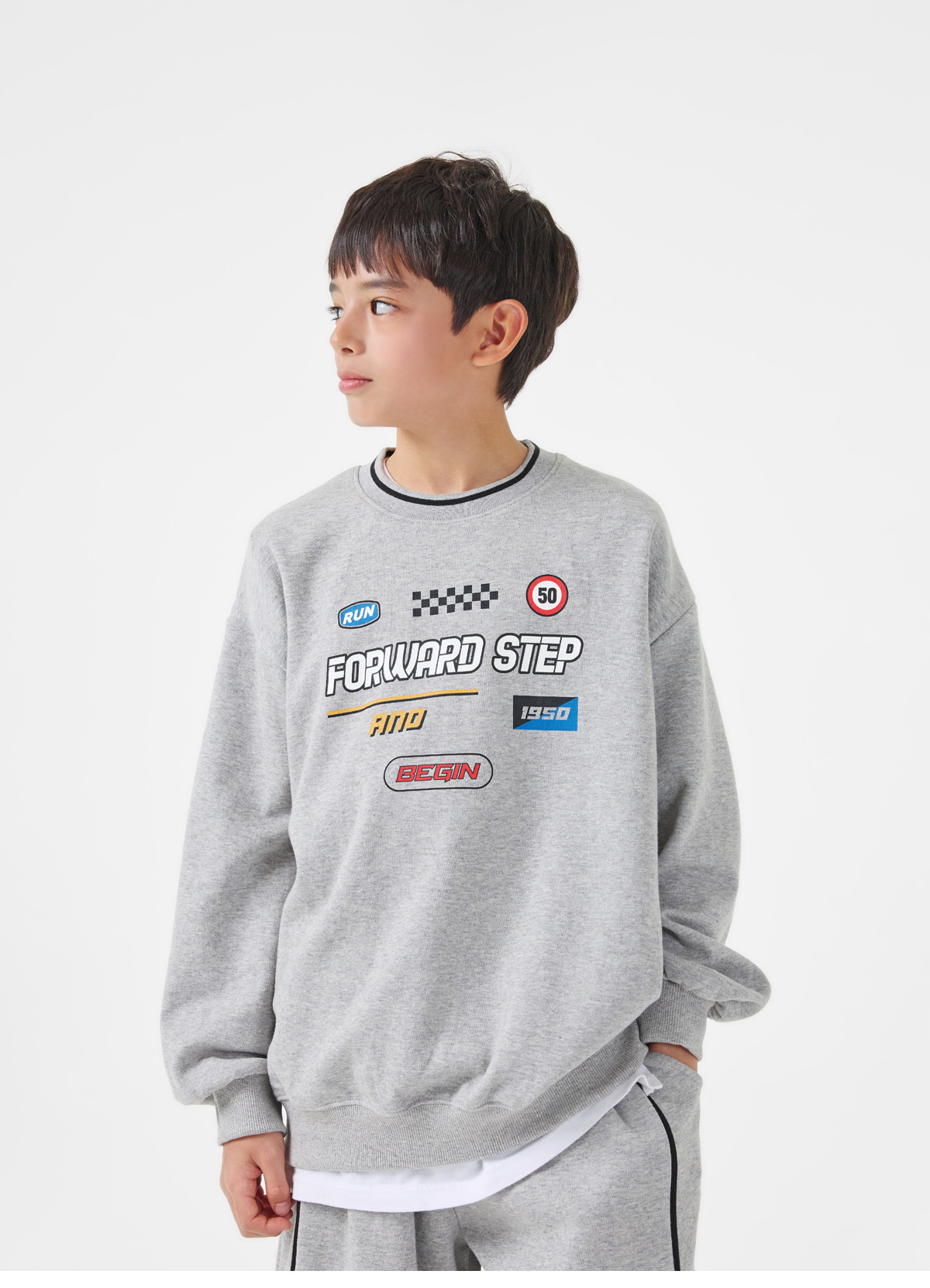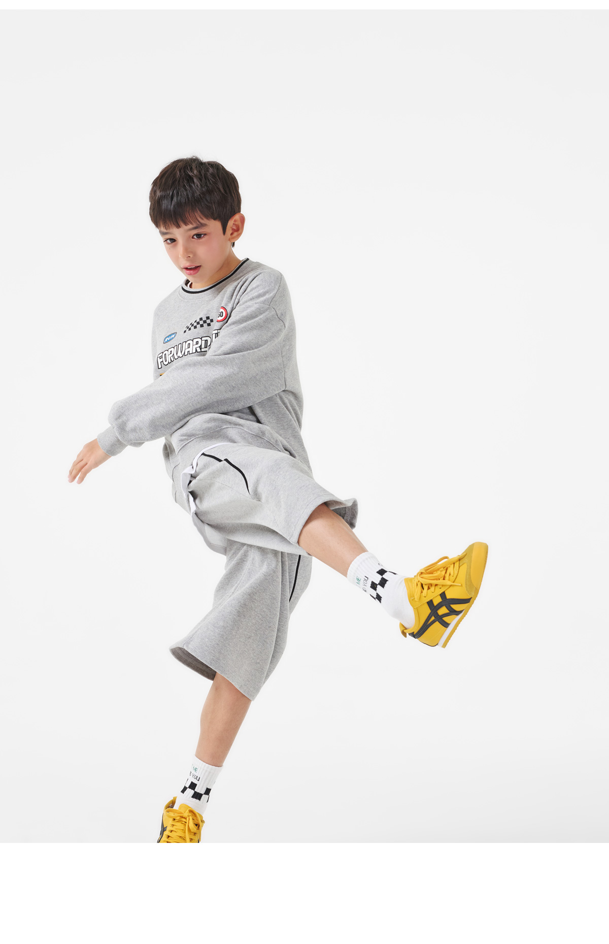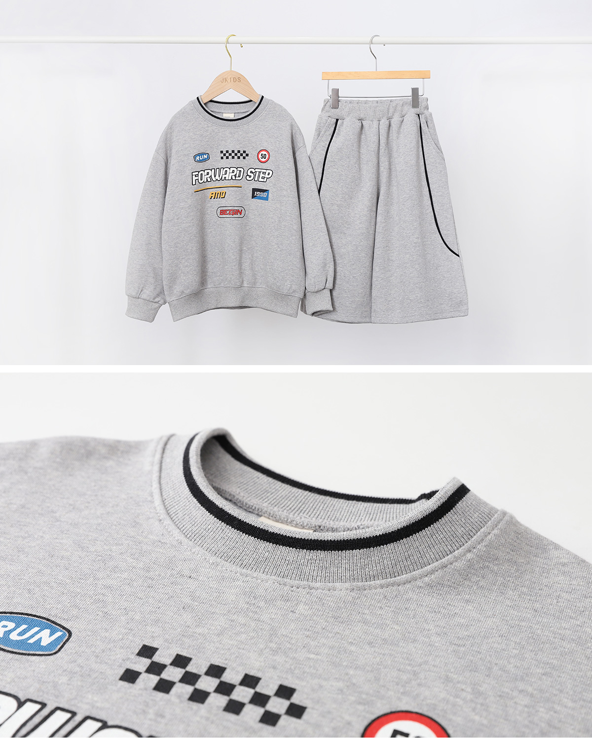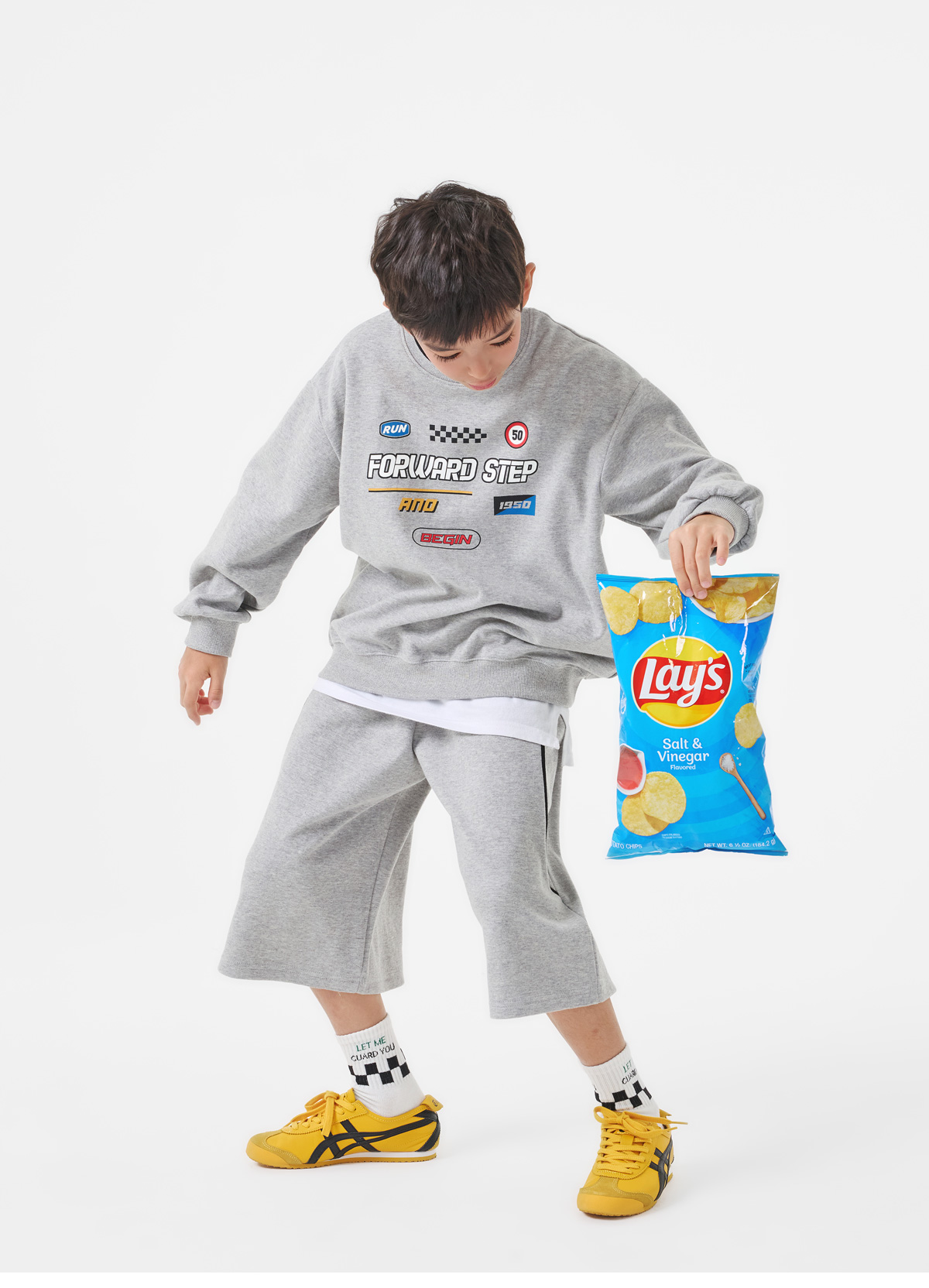 그래픽 포인트가 살아 있는 상의와 버뮤다 팬츠를 함께 구성한 상하 세트예요.
