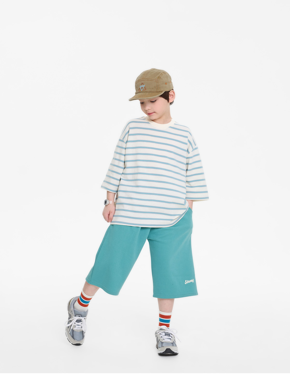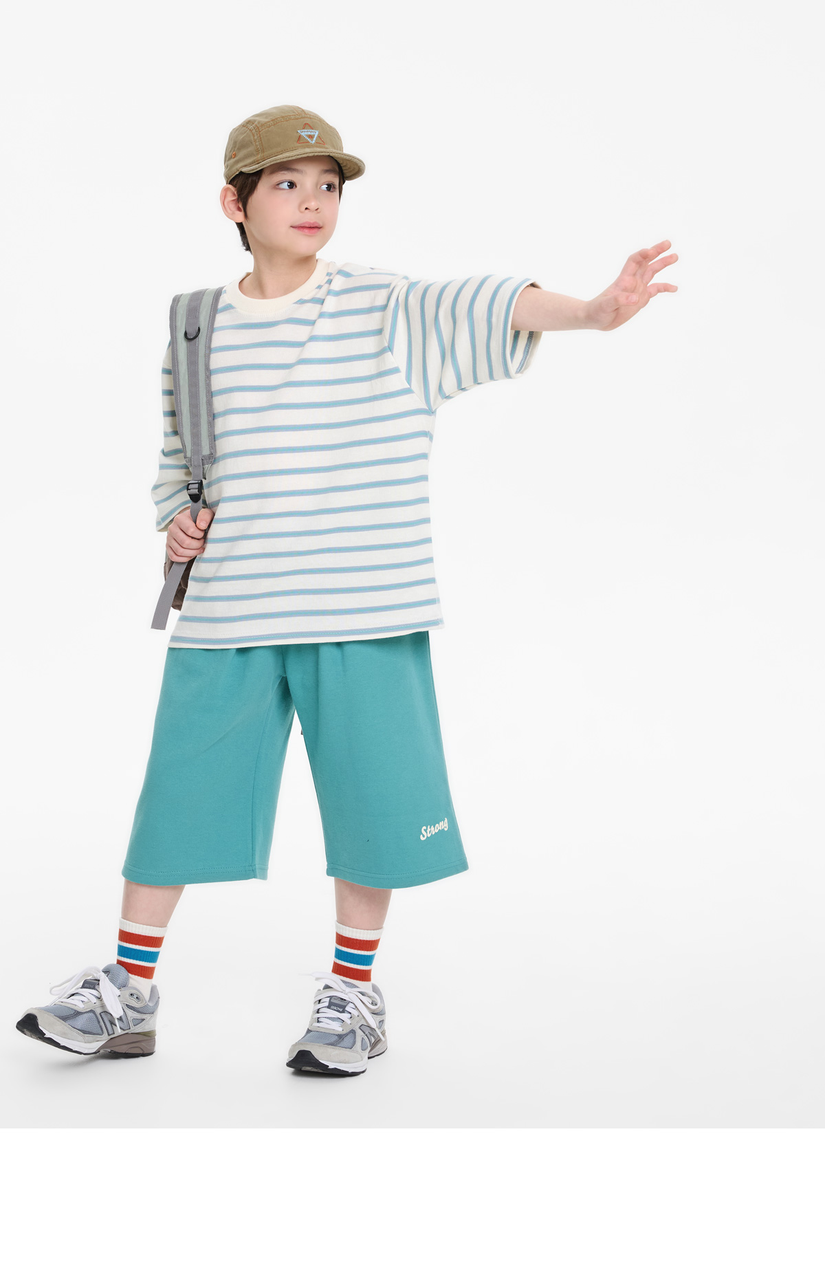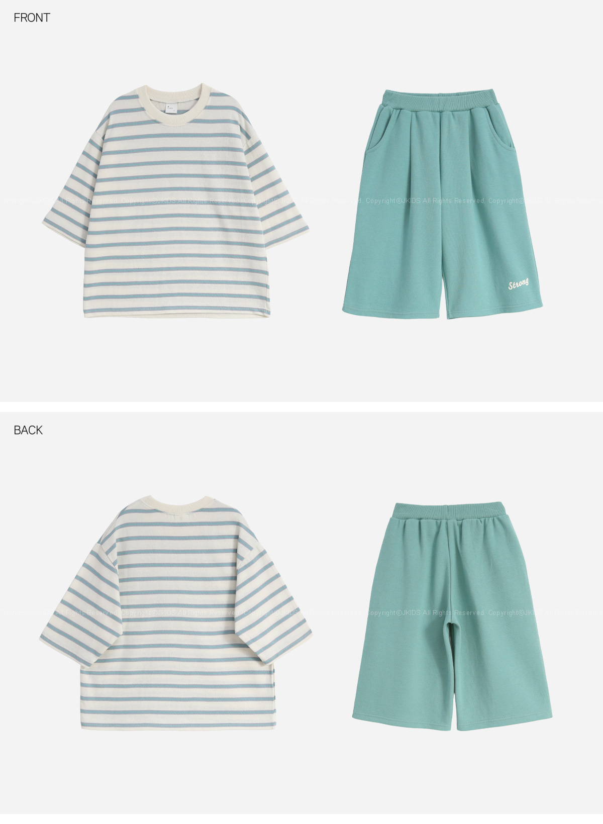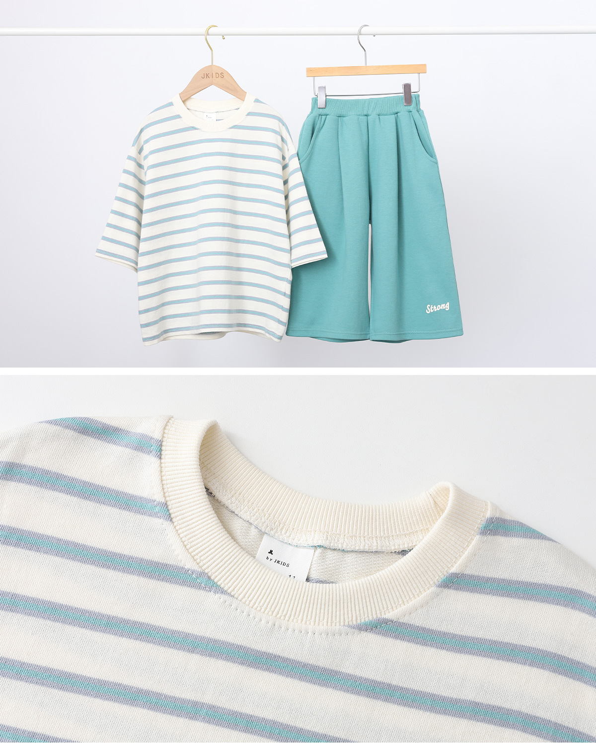 잔잔한 스트라이프 패턴이 돋보이는 반팔 티셔츠와 버뮤다팬츠 상하세트예요.
