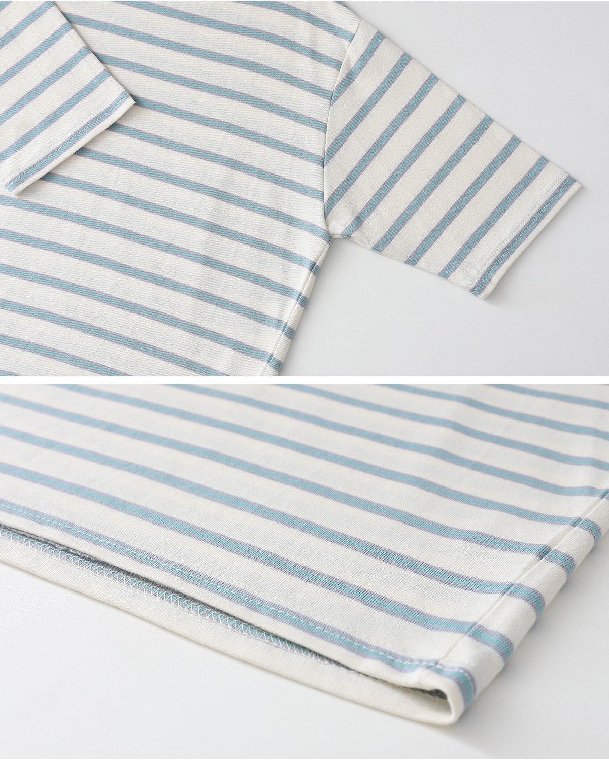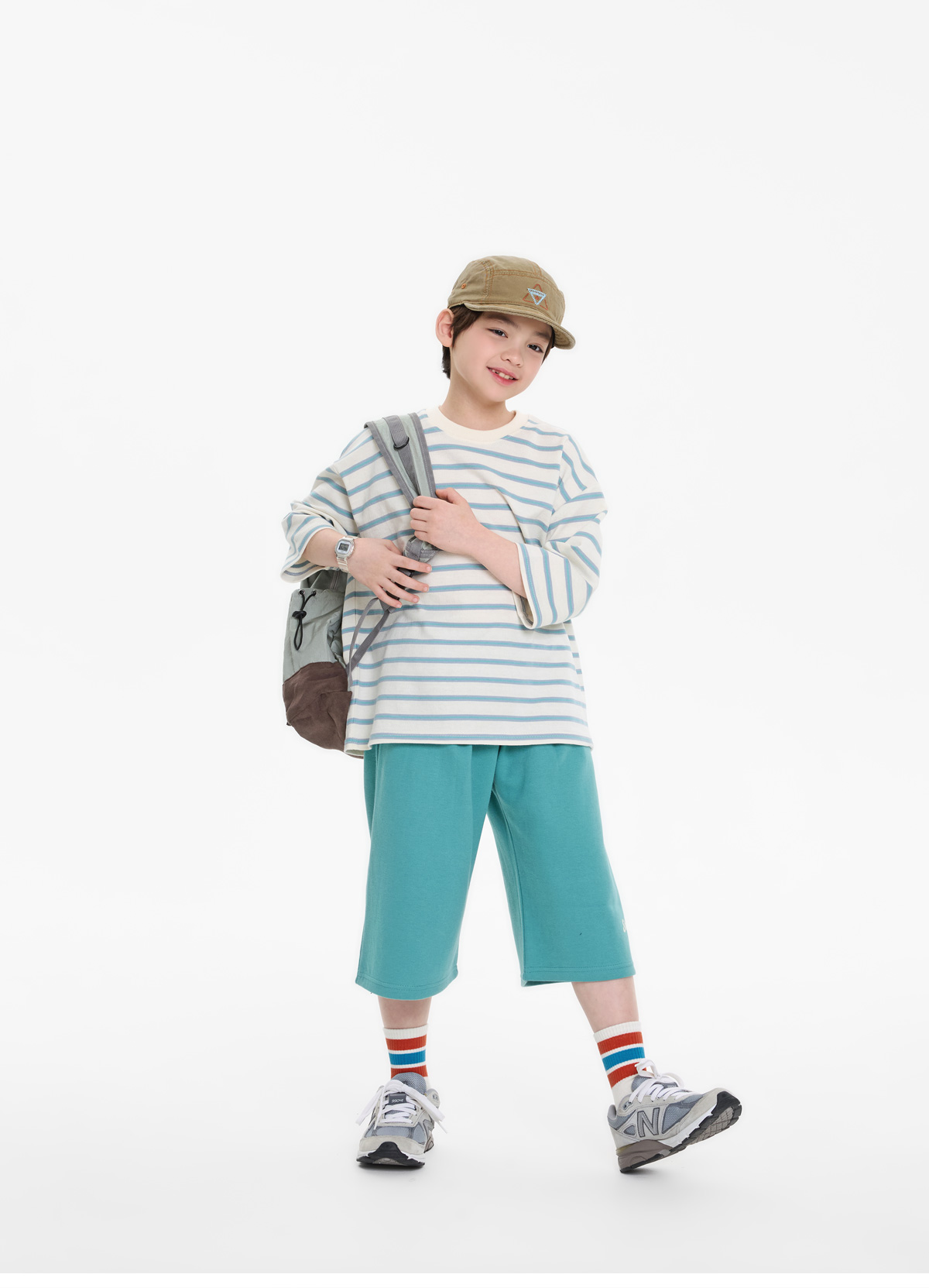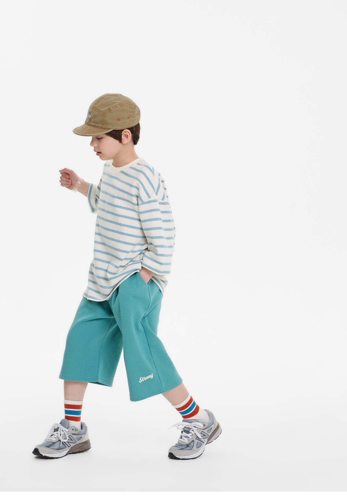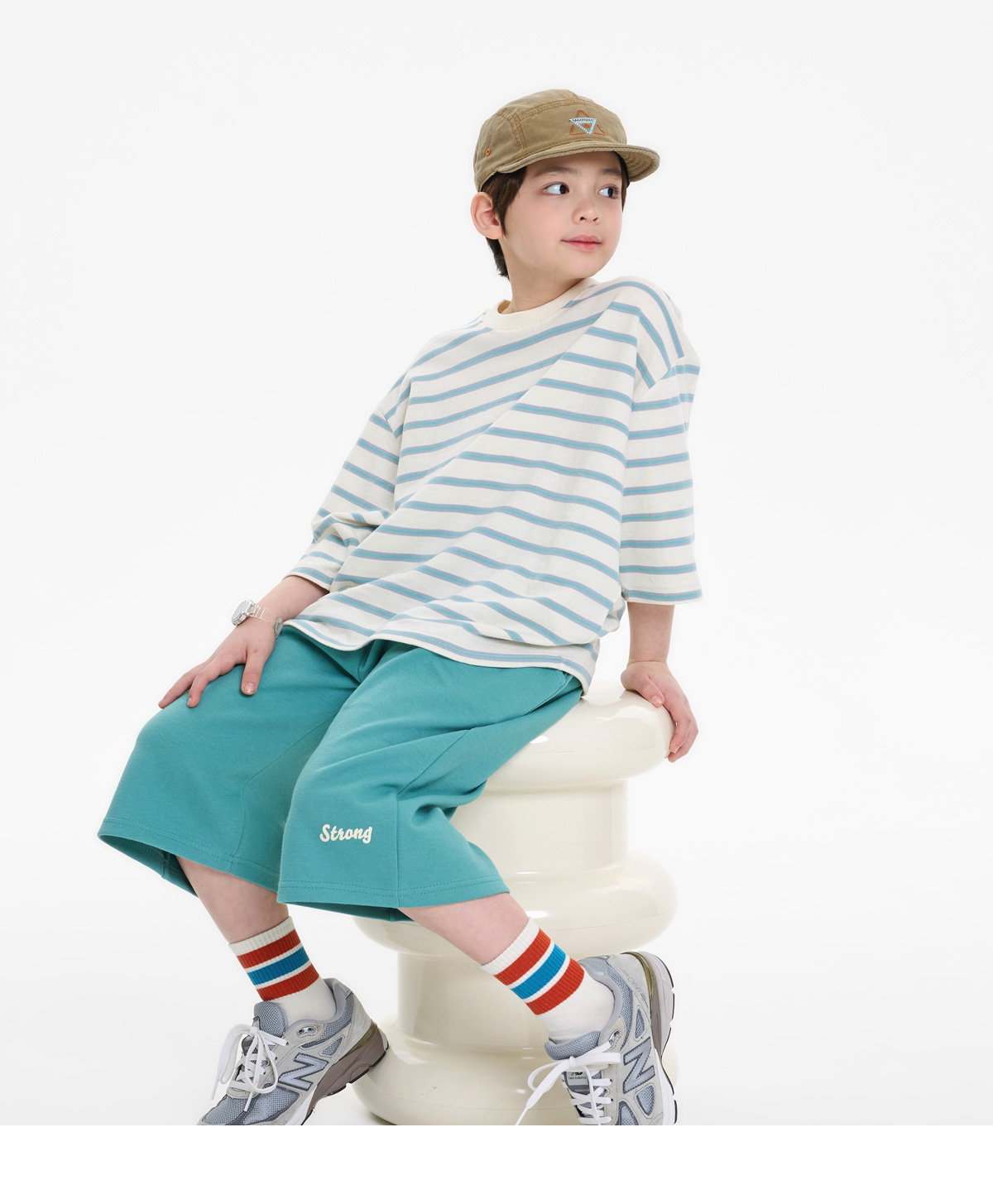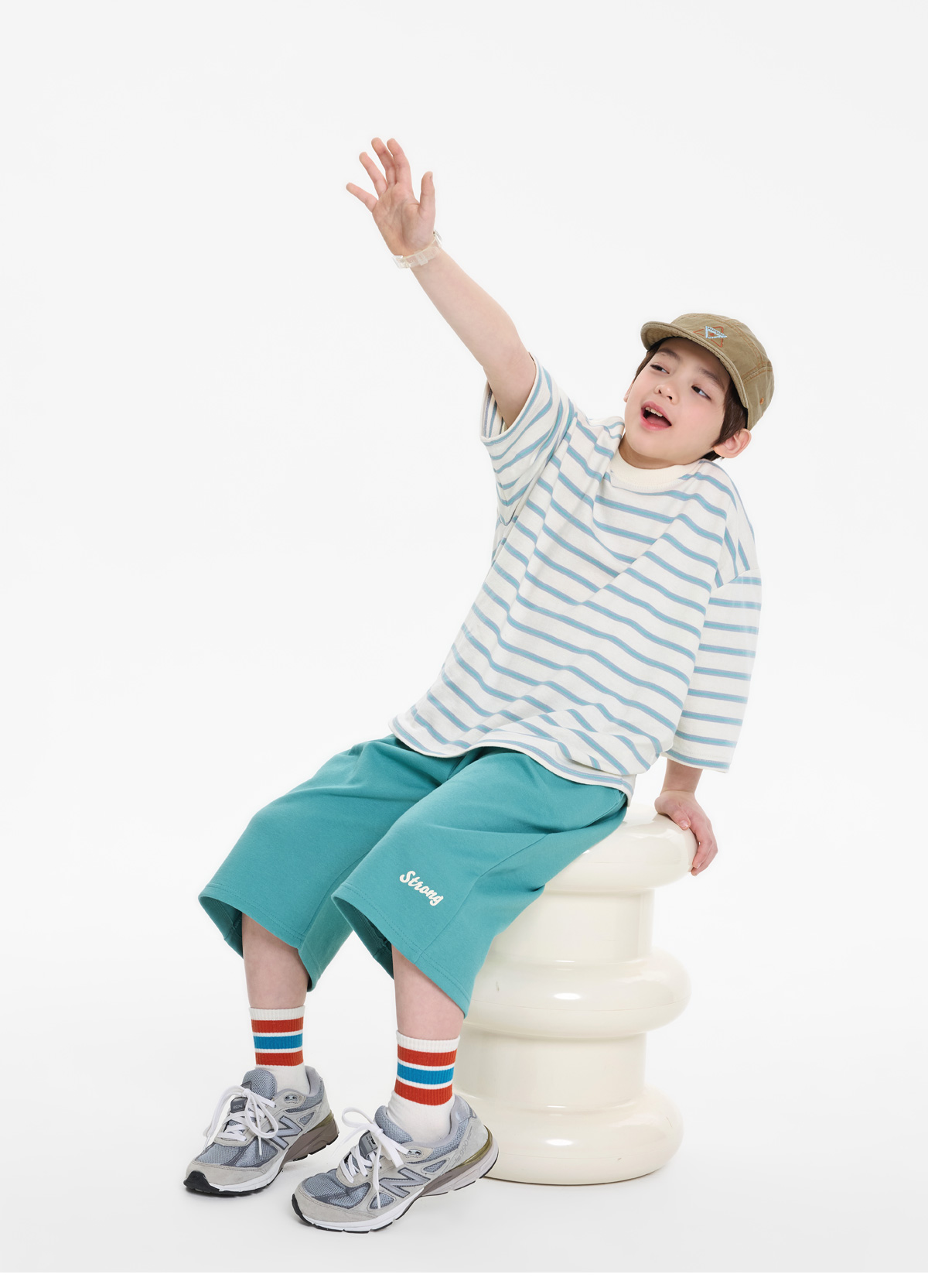 잔잔한 스트라이프 패턴이 돋보이는 반팔 티셔츠와 버뮤다팬츠 상하세트예요.