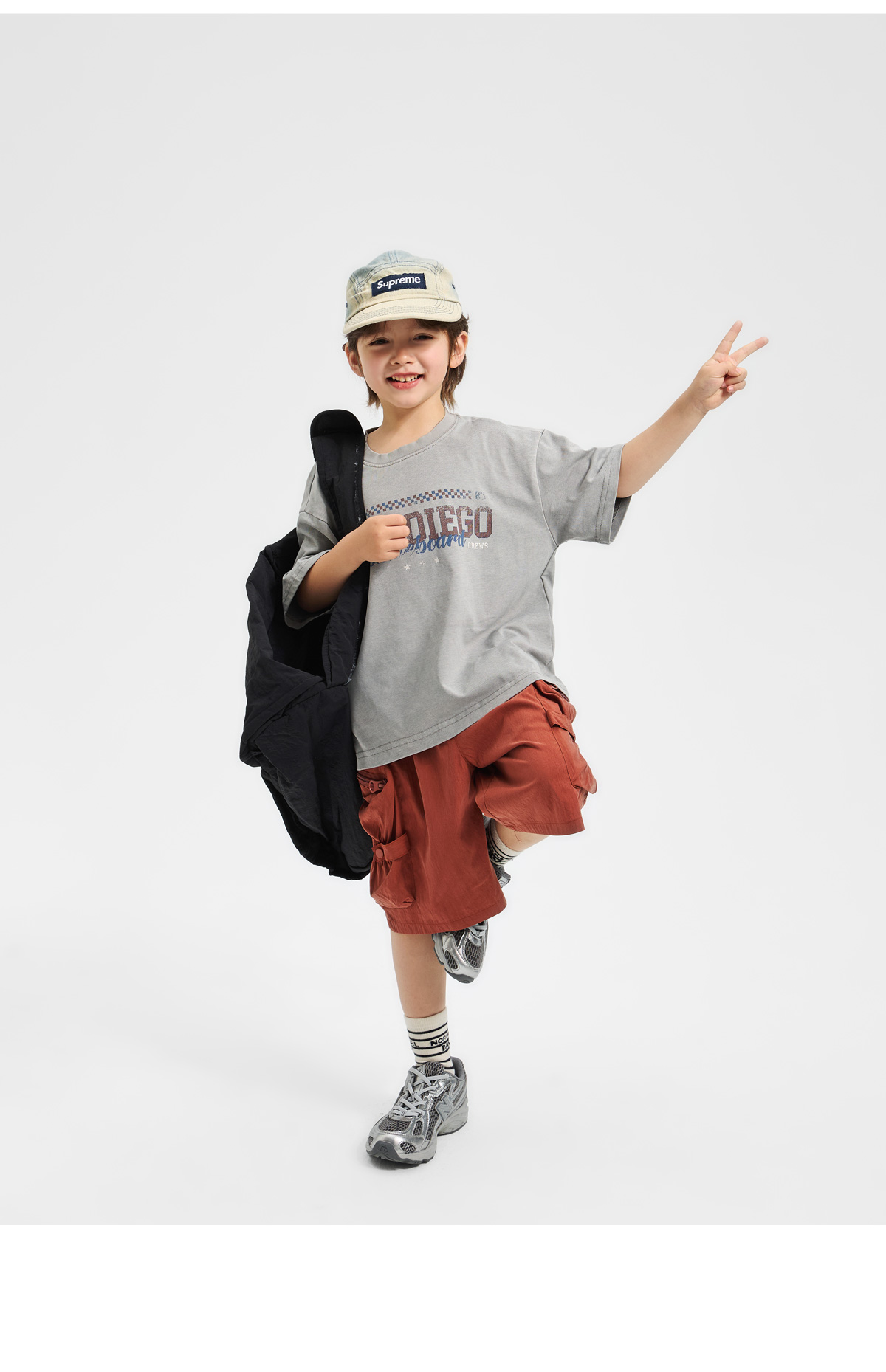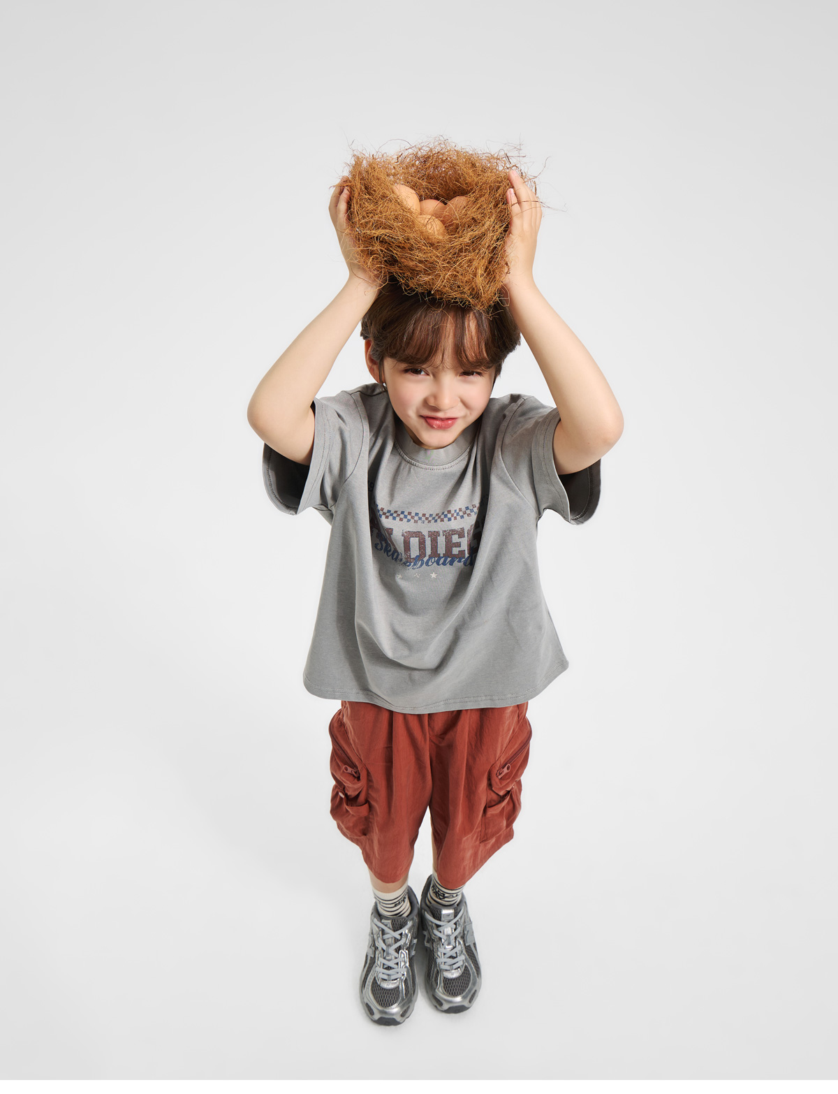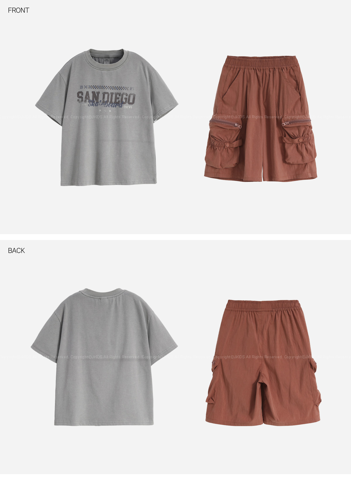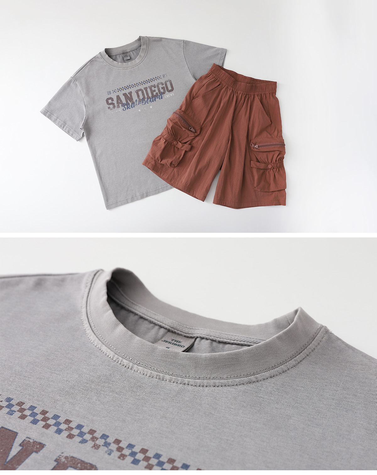프론트 프린팅이 더해진 반팔 티셔츠와 카고 팬츠로 구성된 상하세트예요.