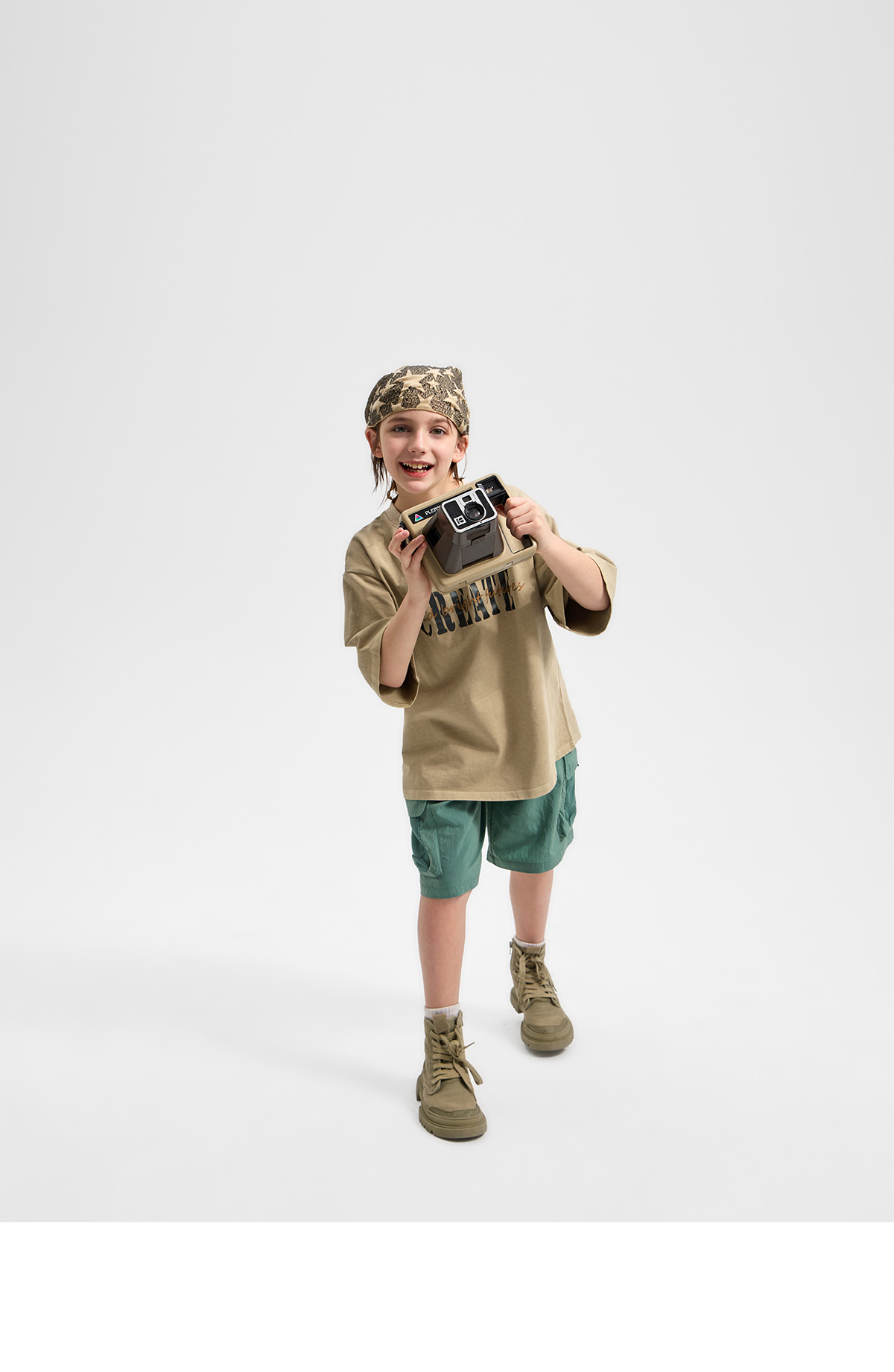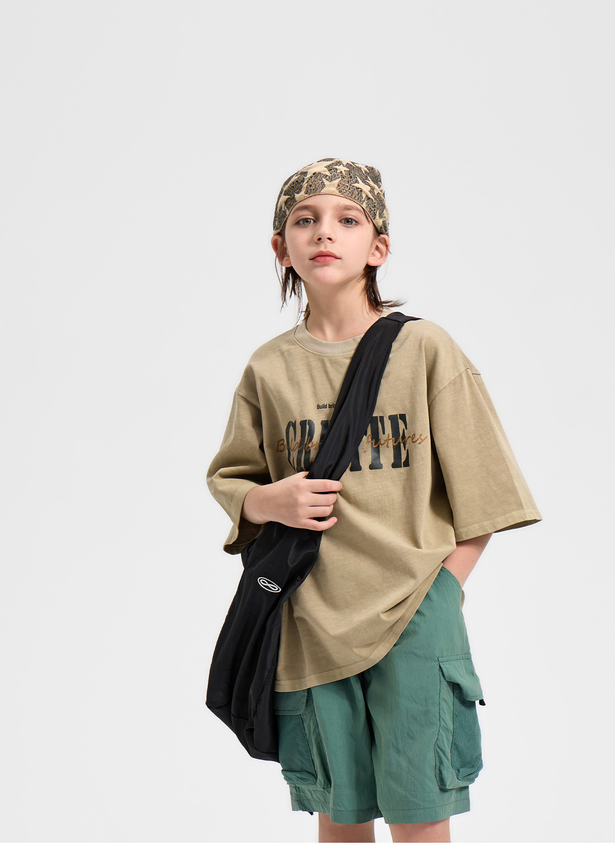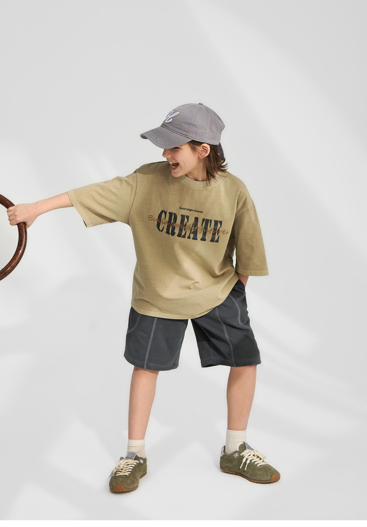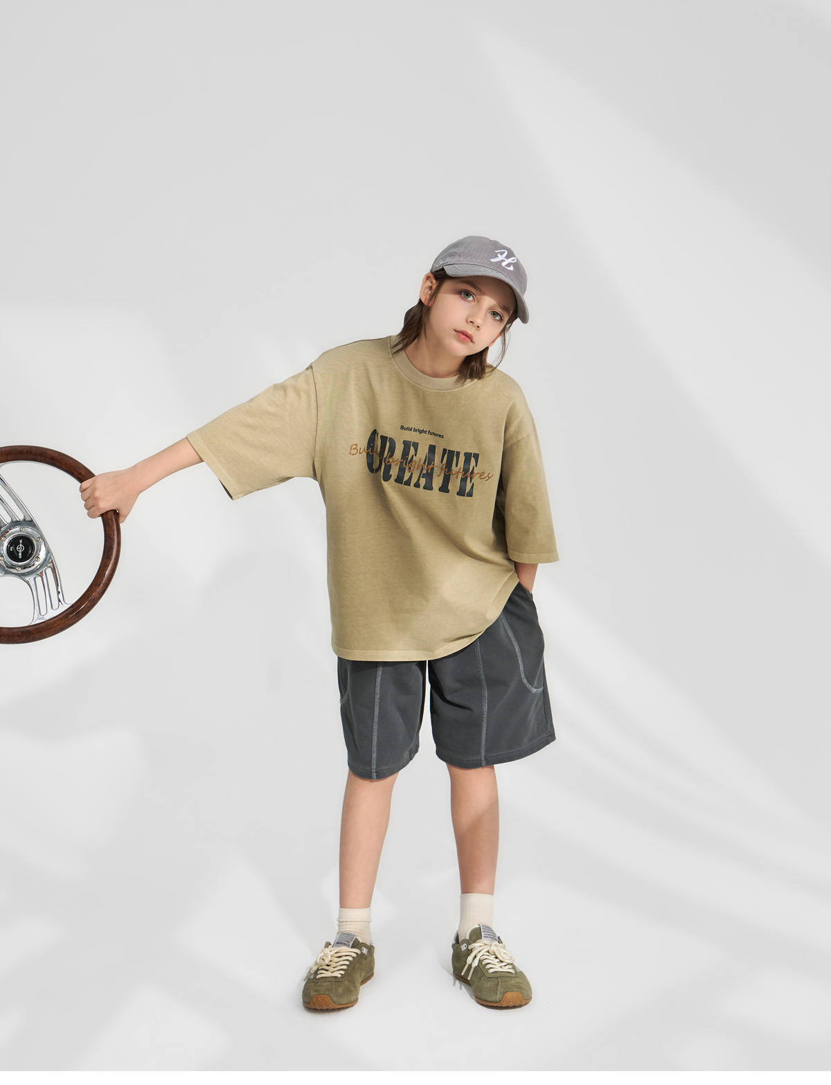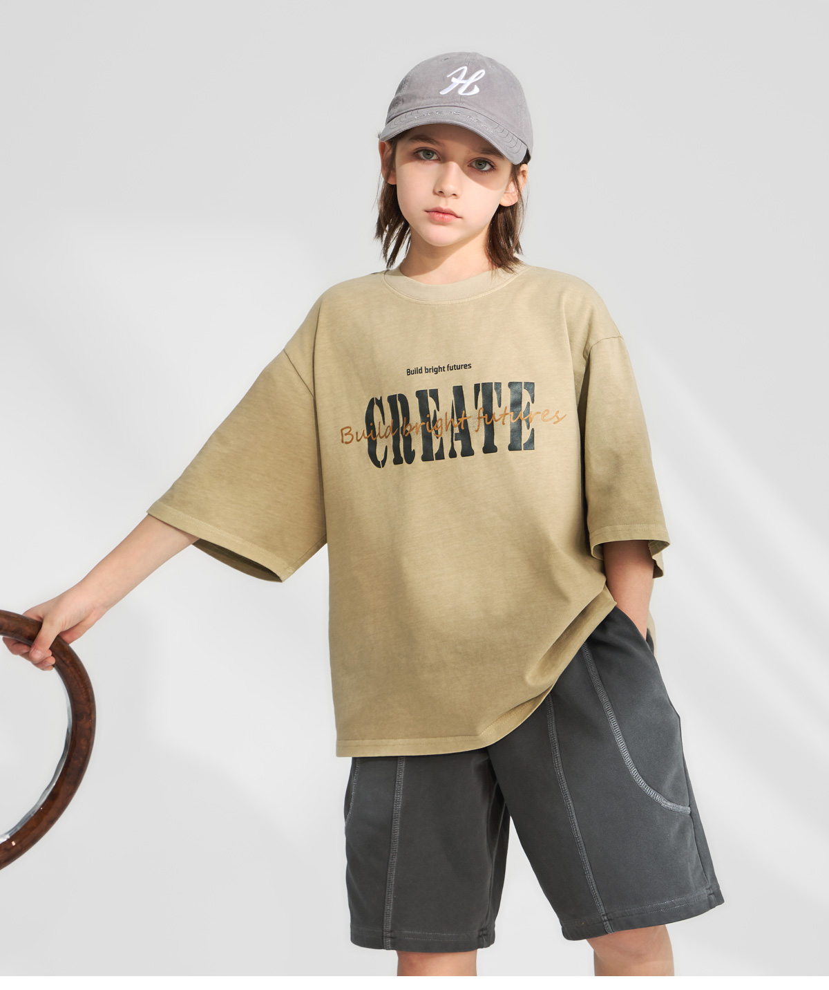 부드러운 베이지 컬러에 빈티지한 레터링 프린팅이 더해진 반소매 티셔츠예요.