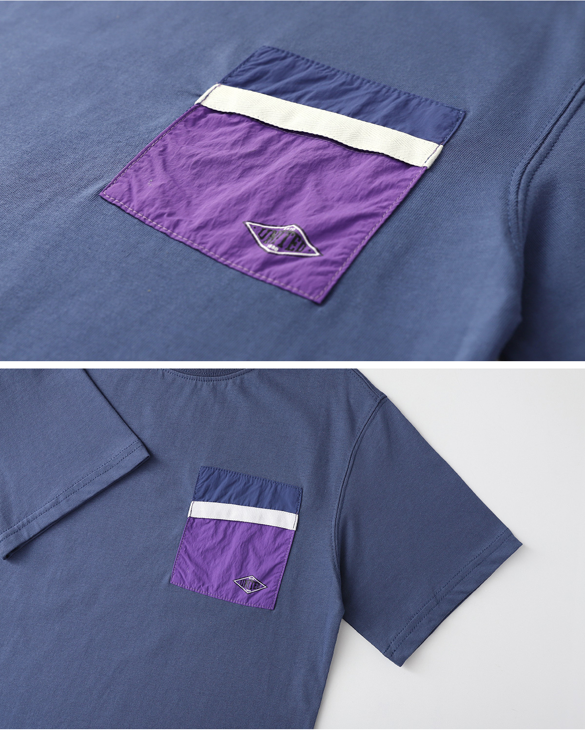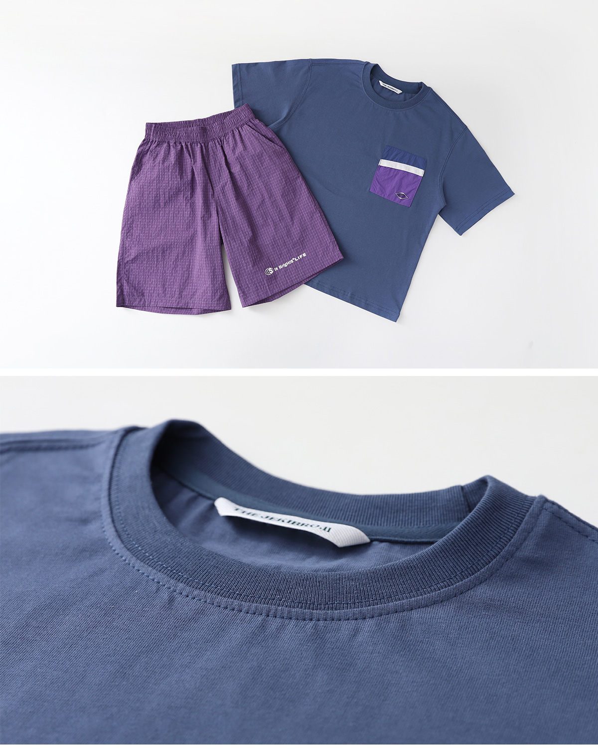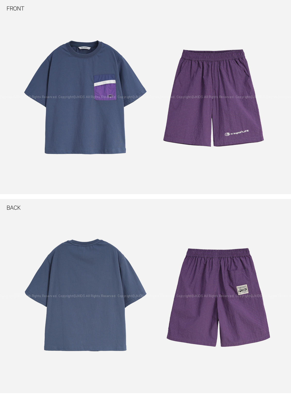 배색 포켓이 포인트가 되는 블루 컬러 상하세트예요.