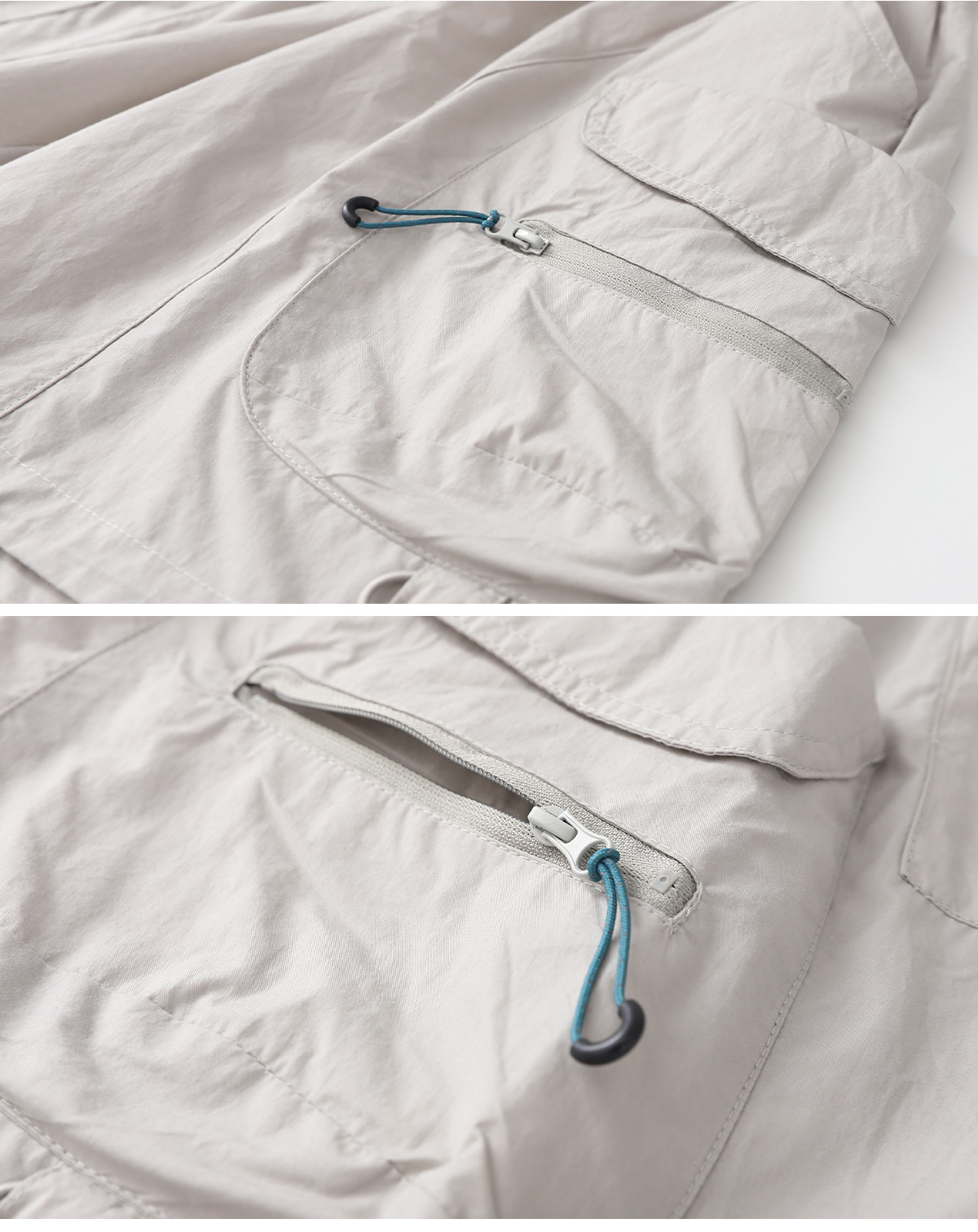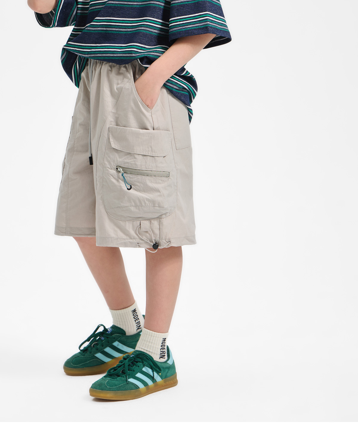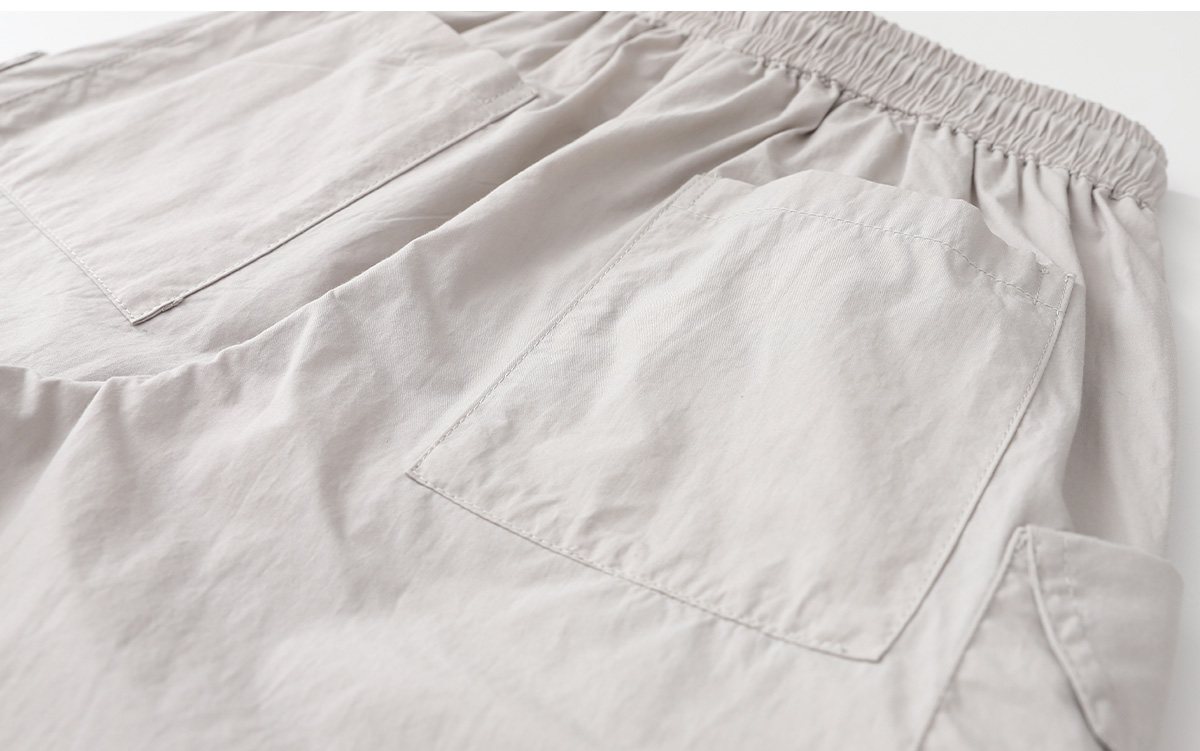사이드 포켓과 지퍼 디테일이 포인트인 하프팬츠예요.