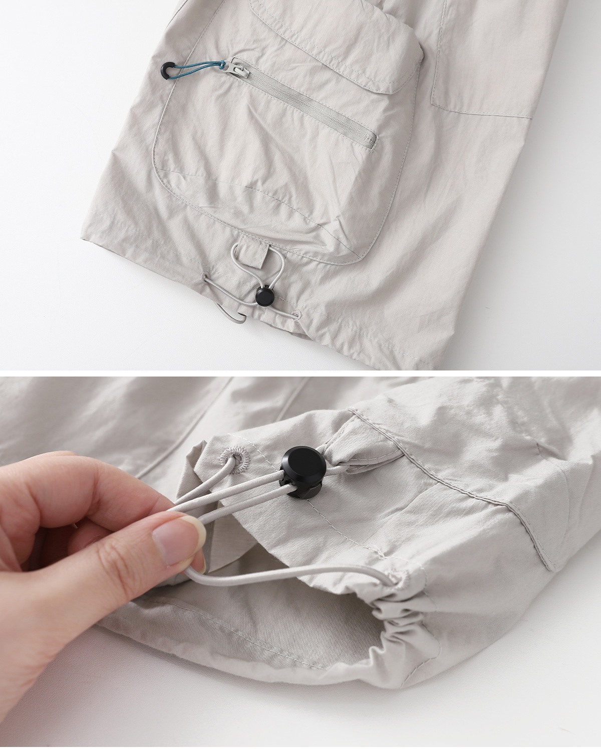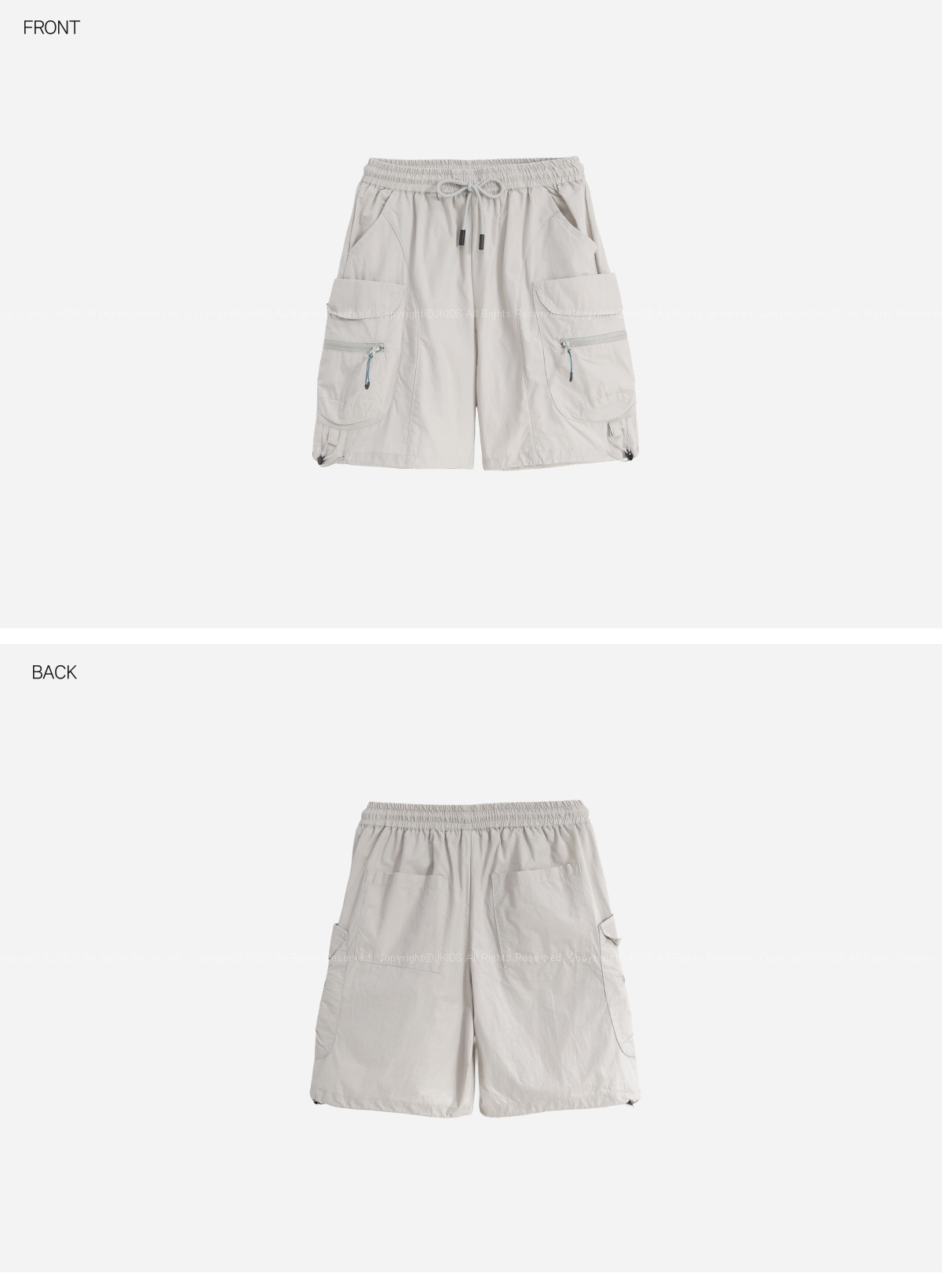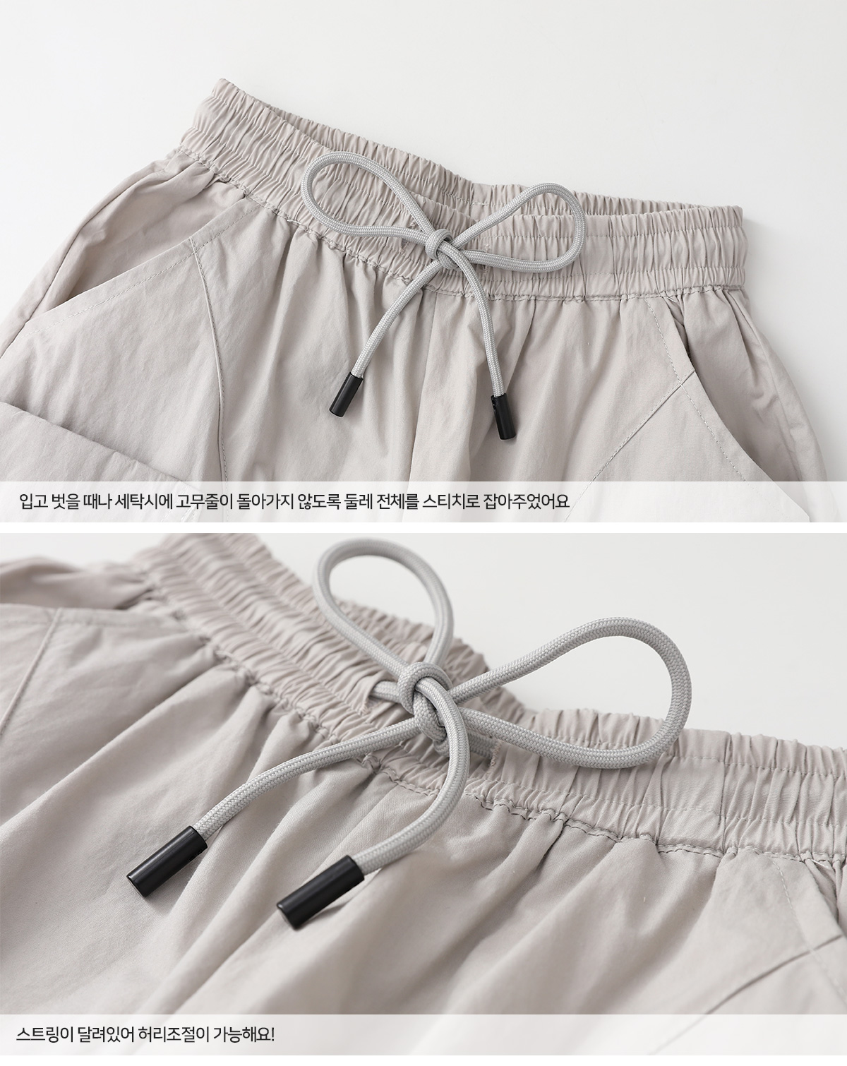 사이드 포켓과 지퍼 디테일이 포인트인 하프팬츠예요.