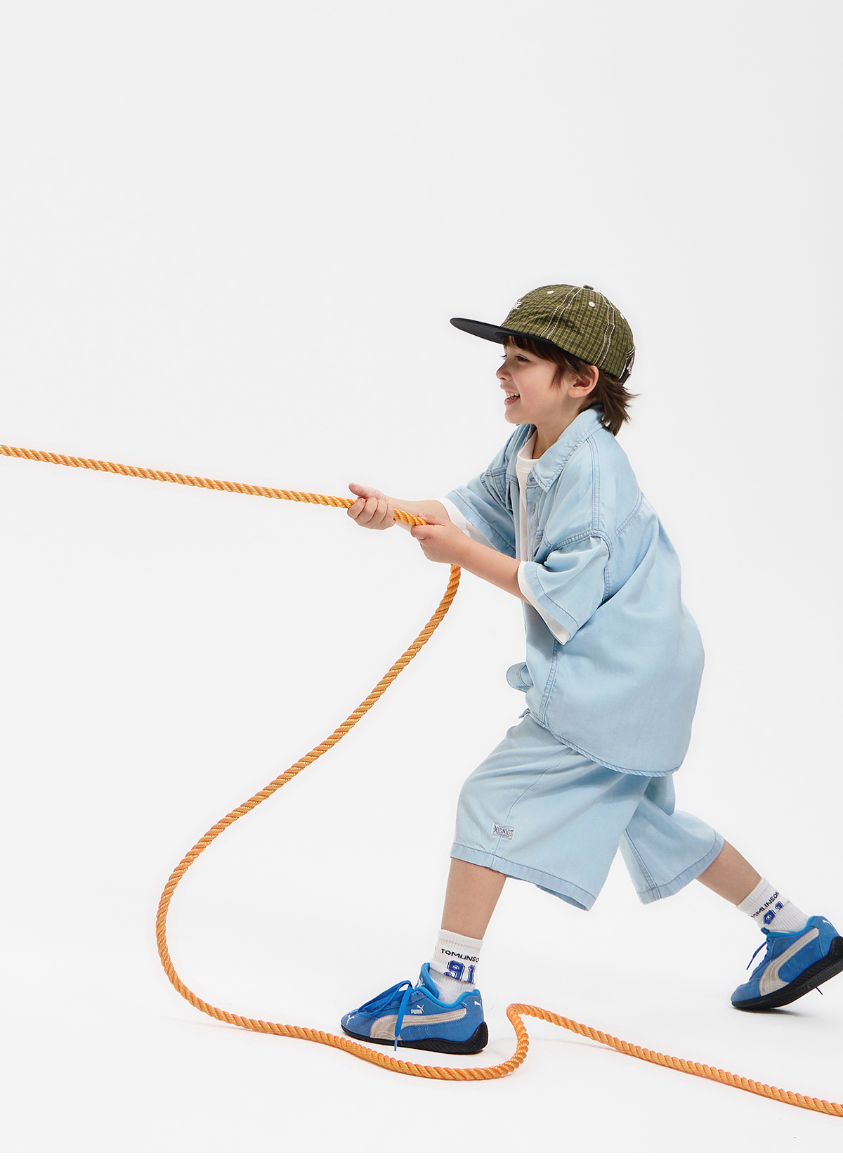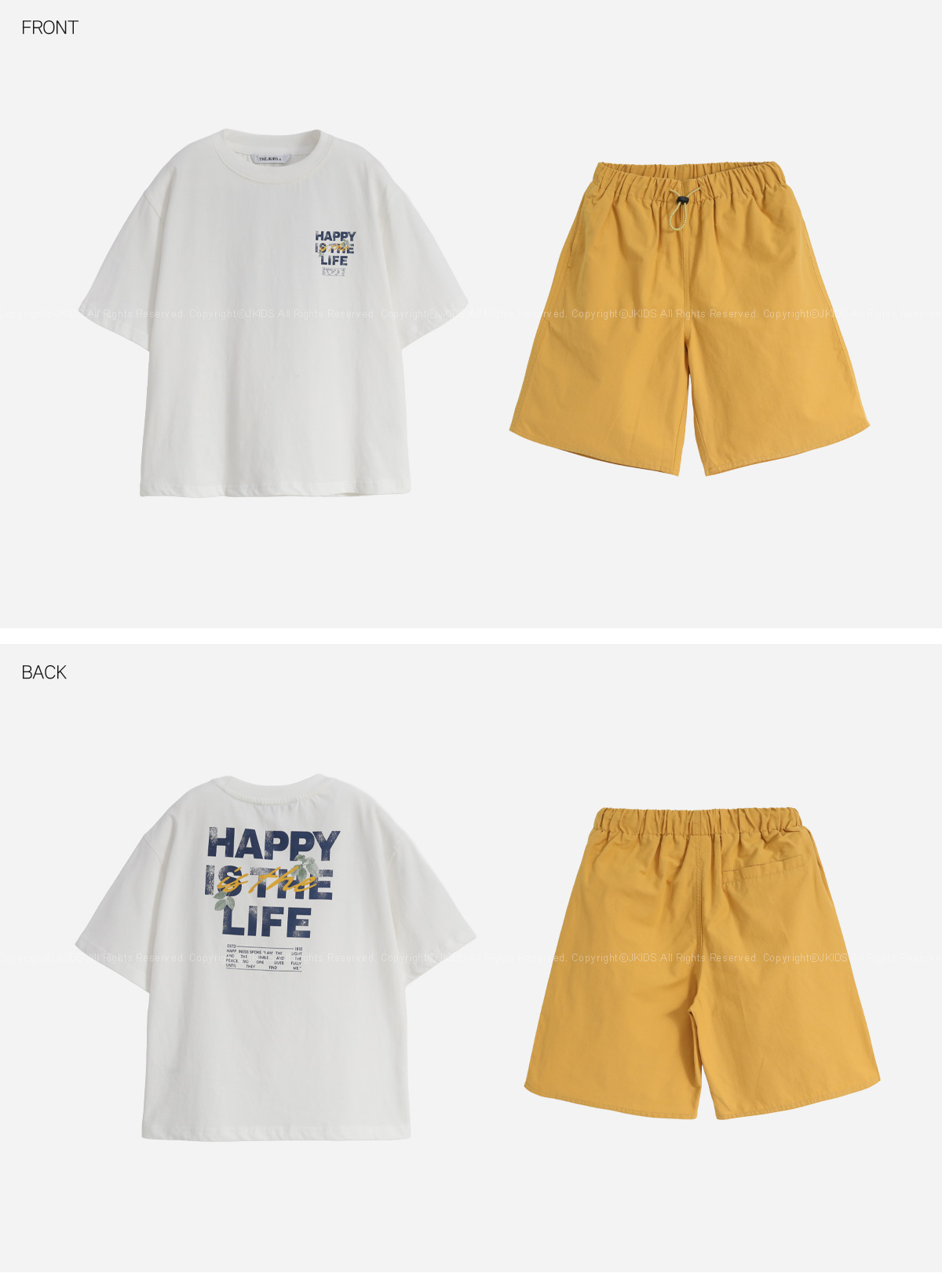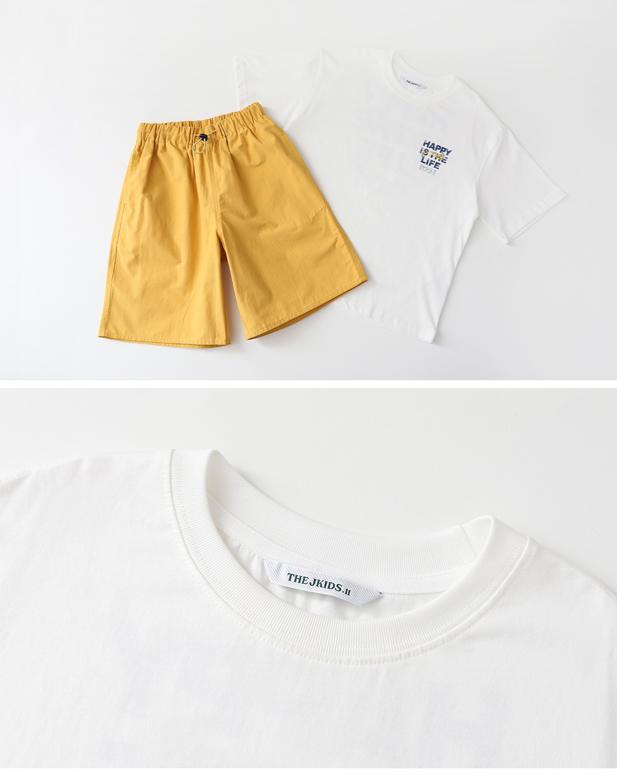 깔끔한 레터링 포인트가 돋보이는 반소매 티셔츠와 컬러감 있는 하프팬츠 셋업이에요