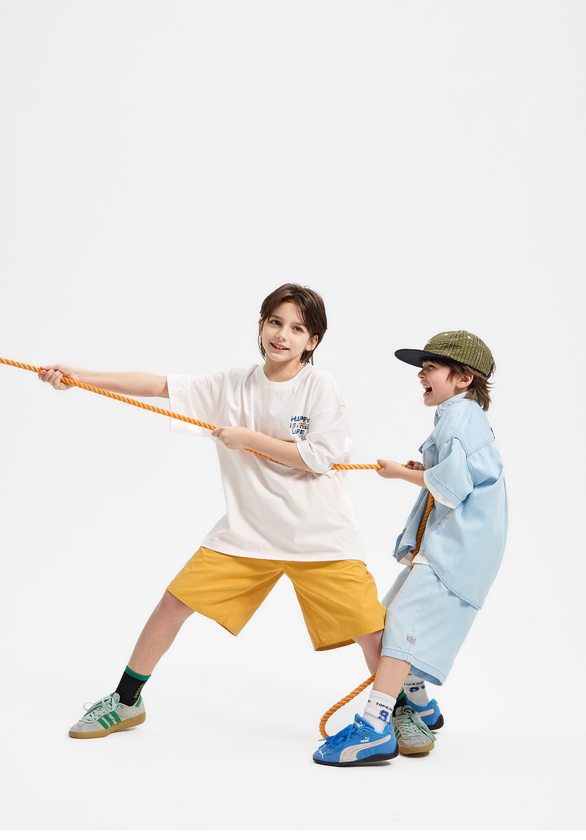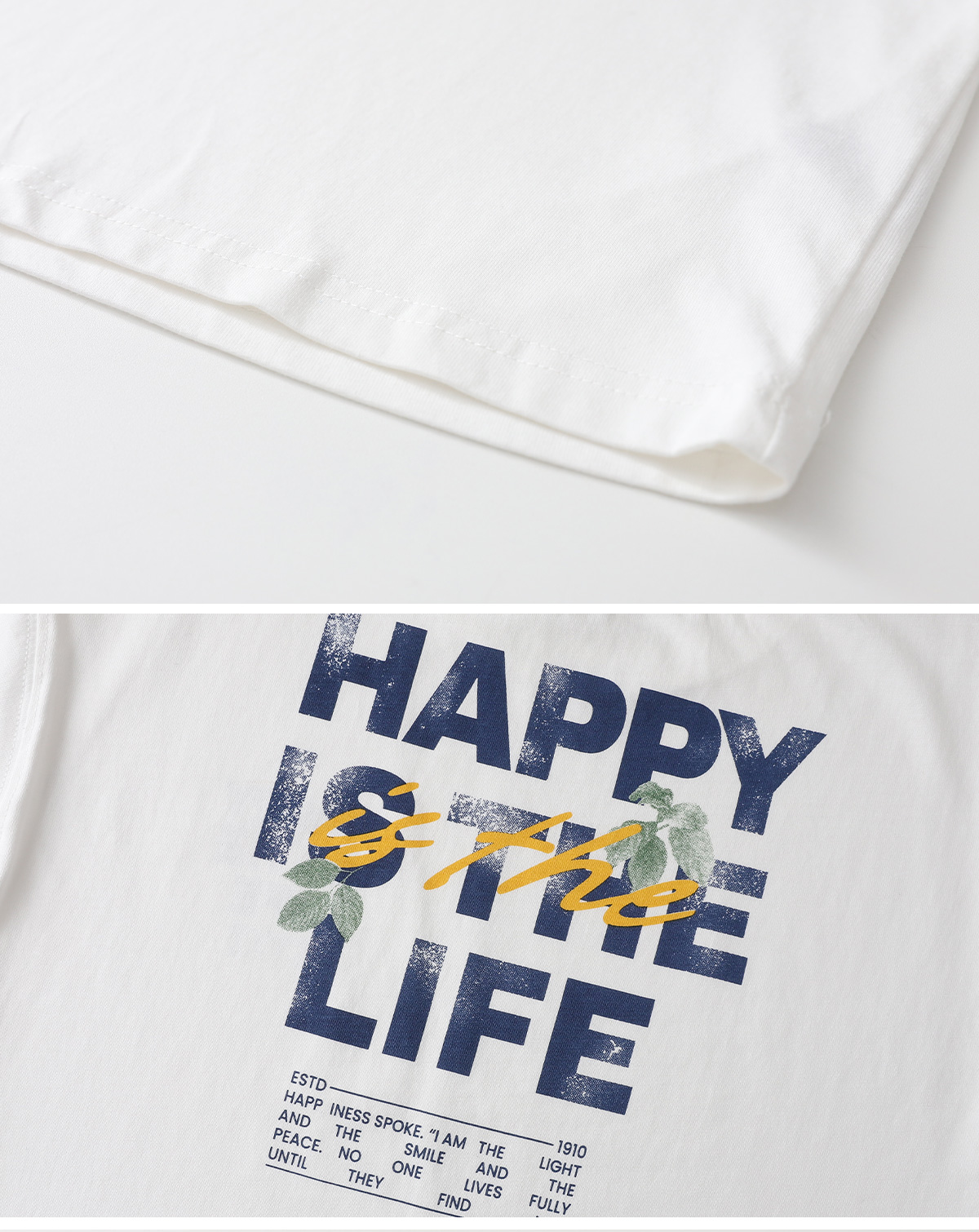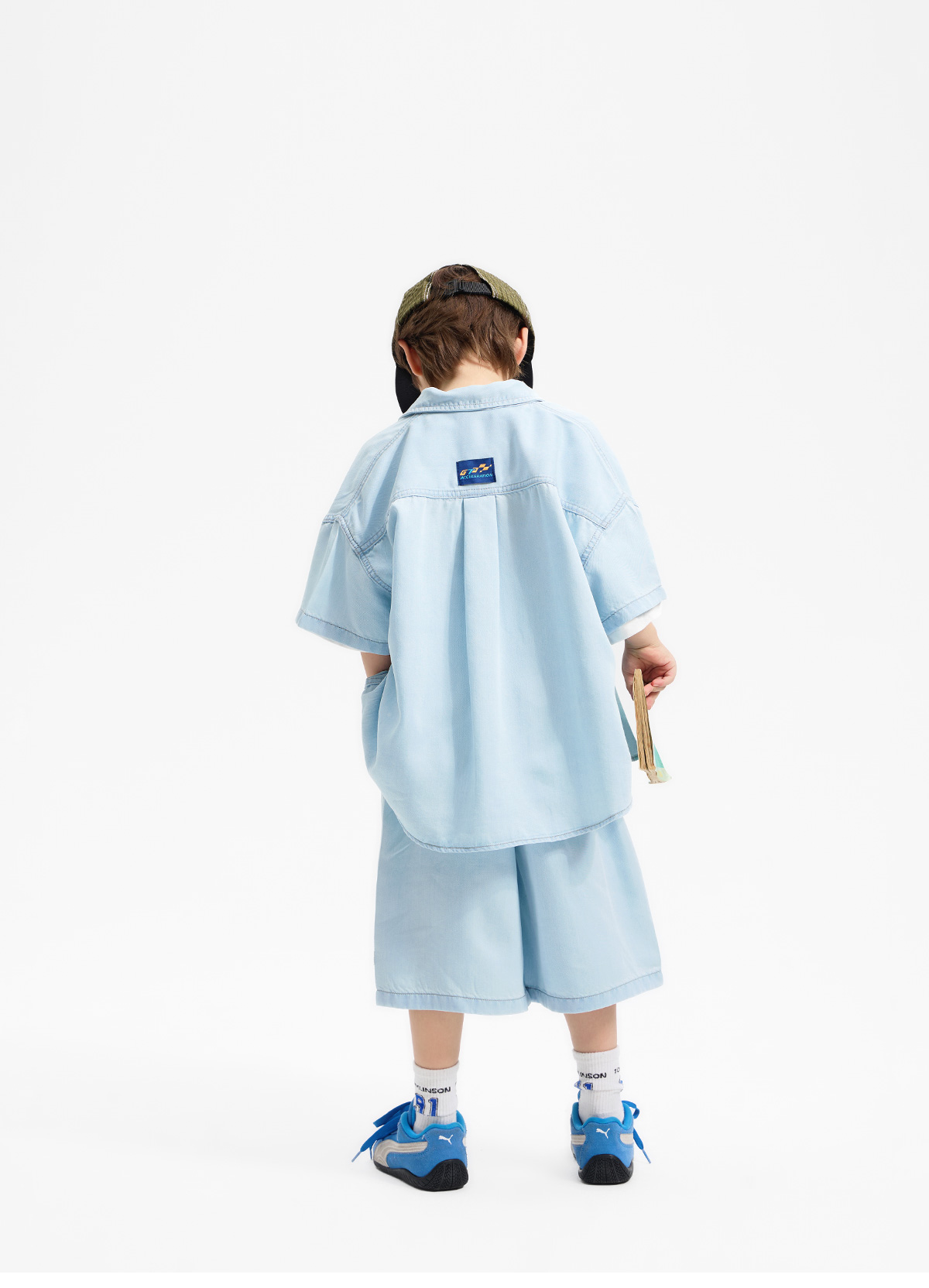 깔끔한 레터링 포인트가 돋보이는 반소매 티셔츠와 컬러감 있는 하프팬츠 셋업이에요