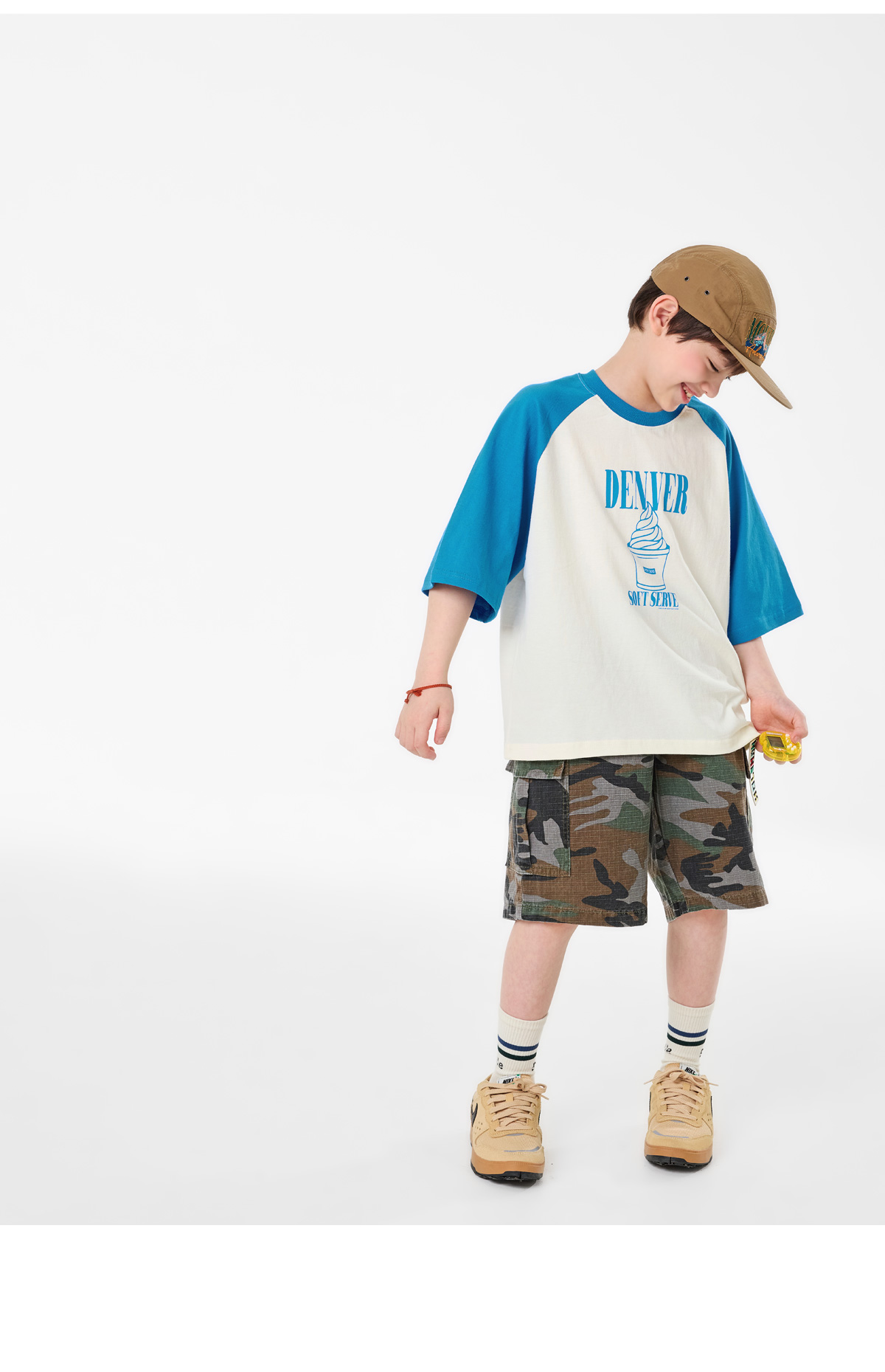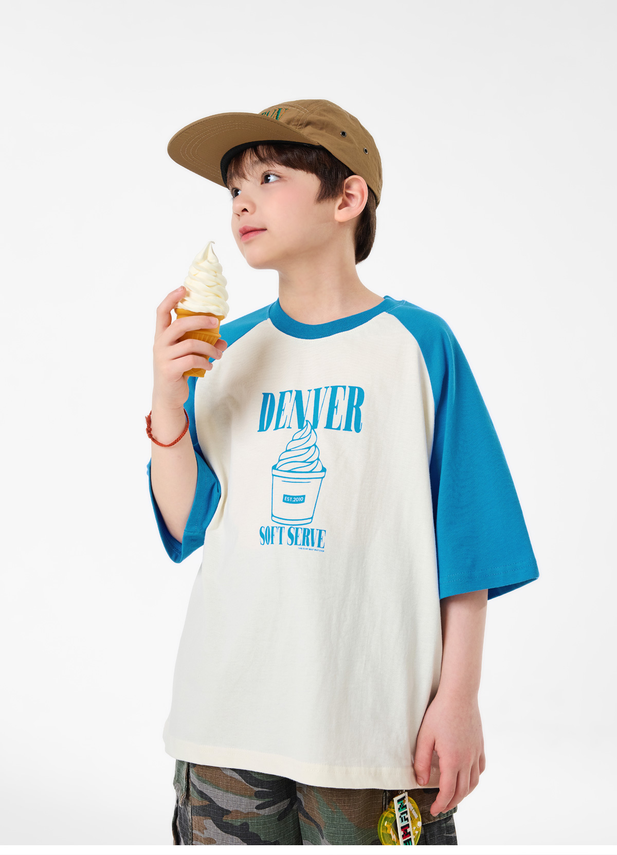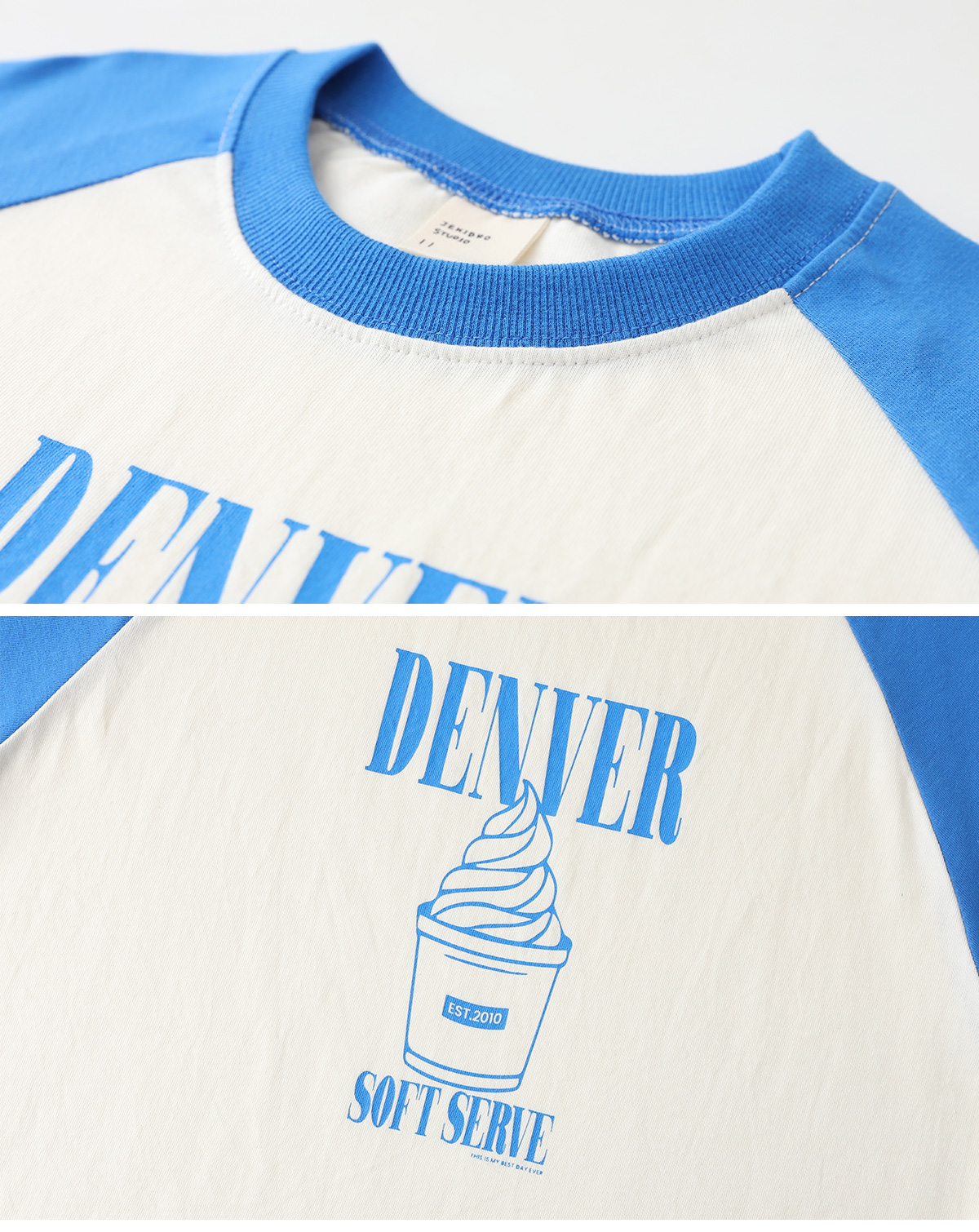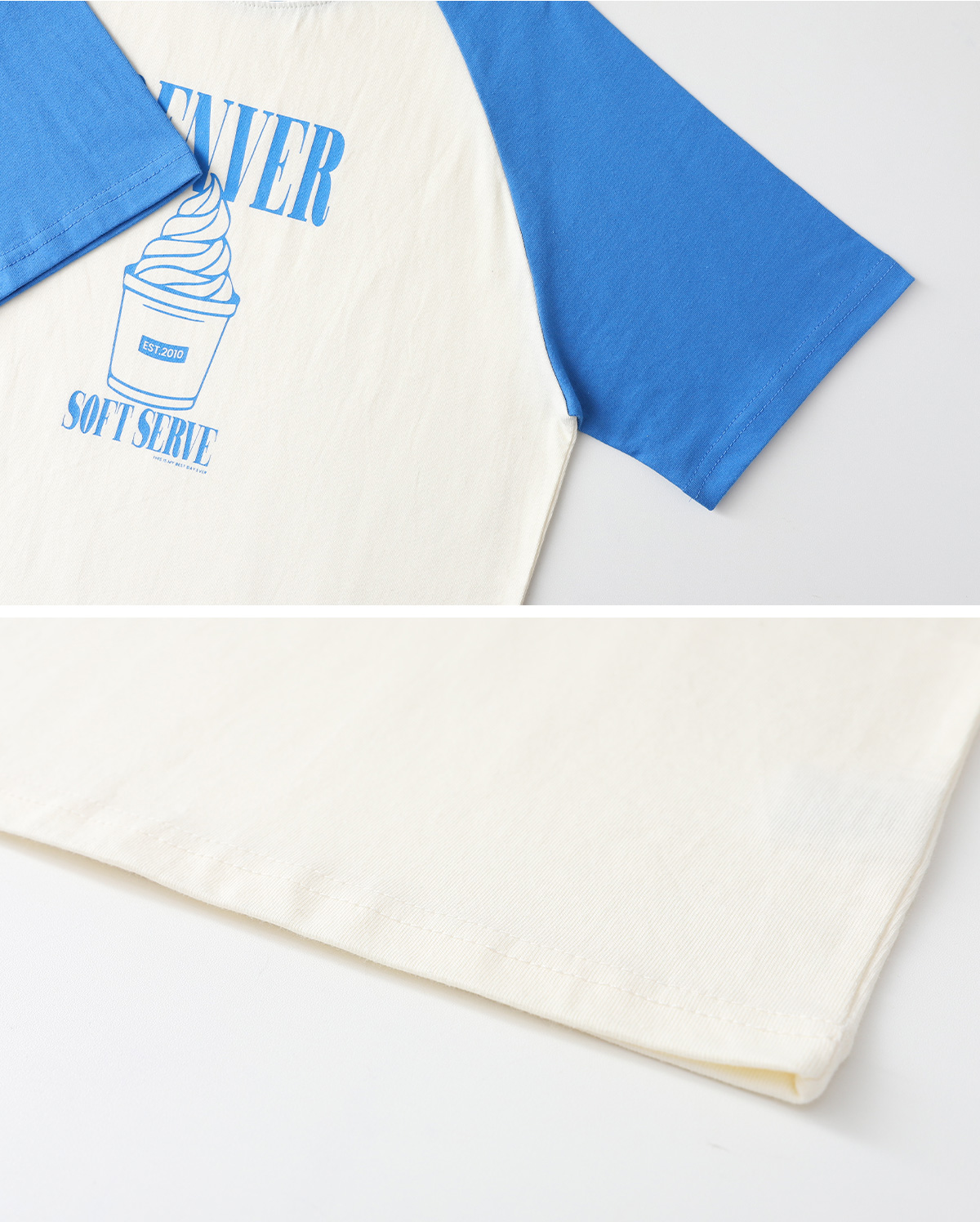 배색 소매가 포인트인 크림 컬러 티셔츠예요.