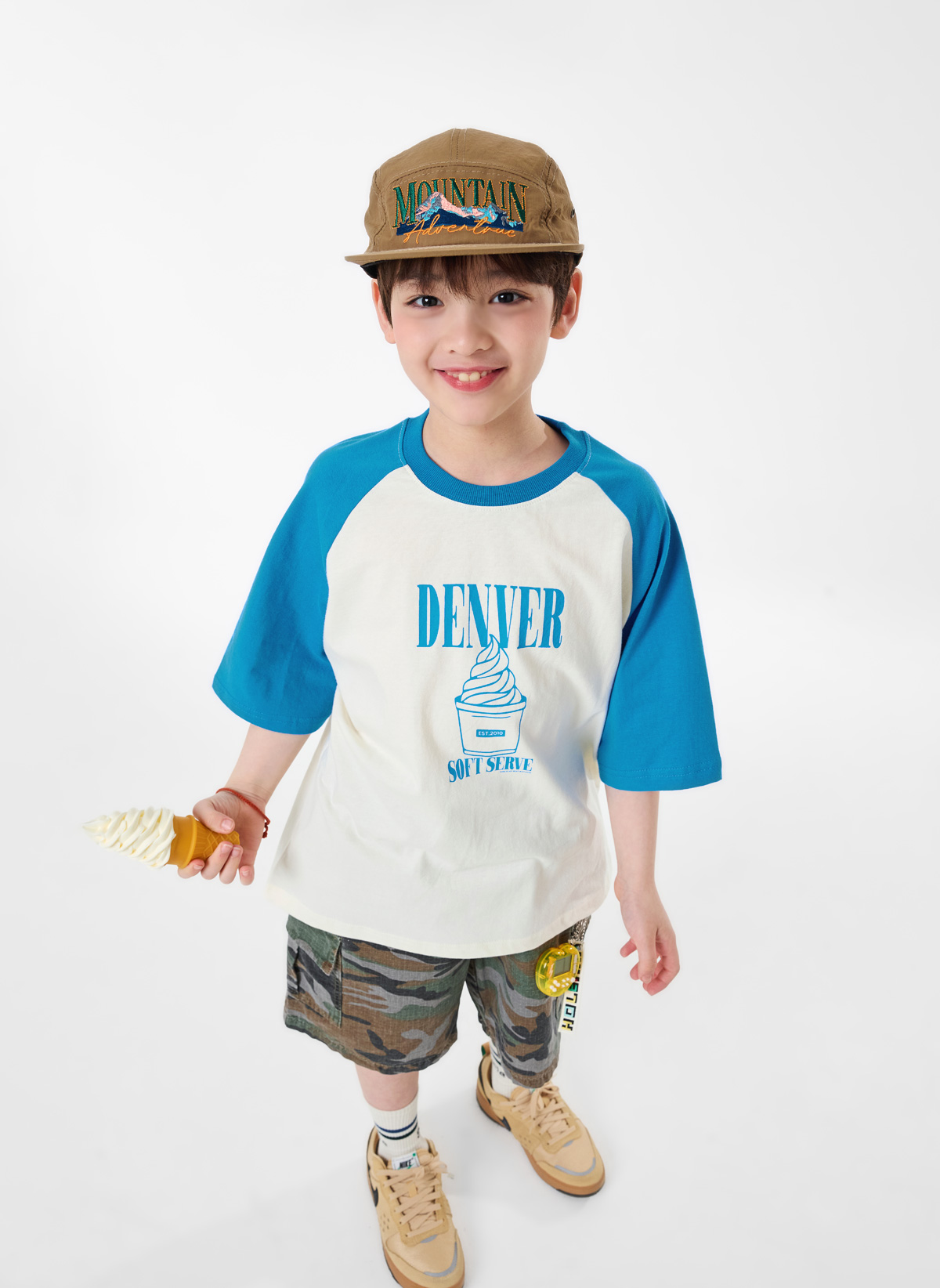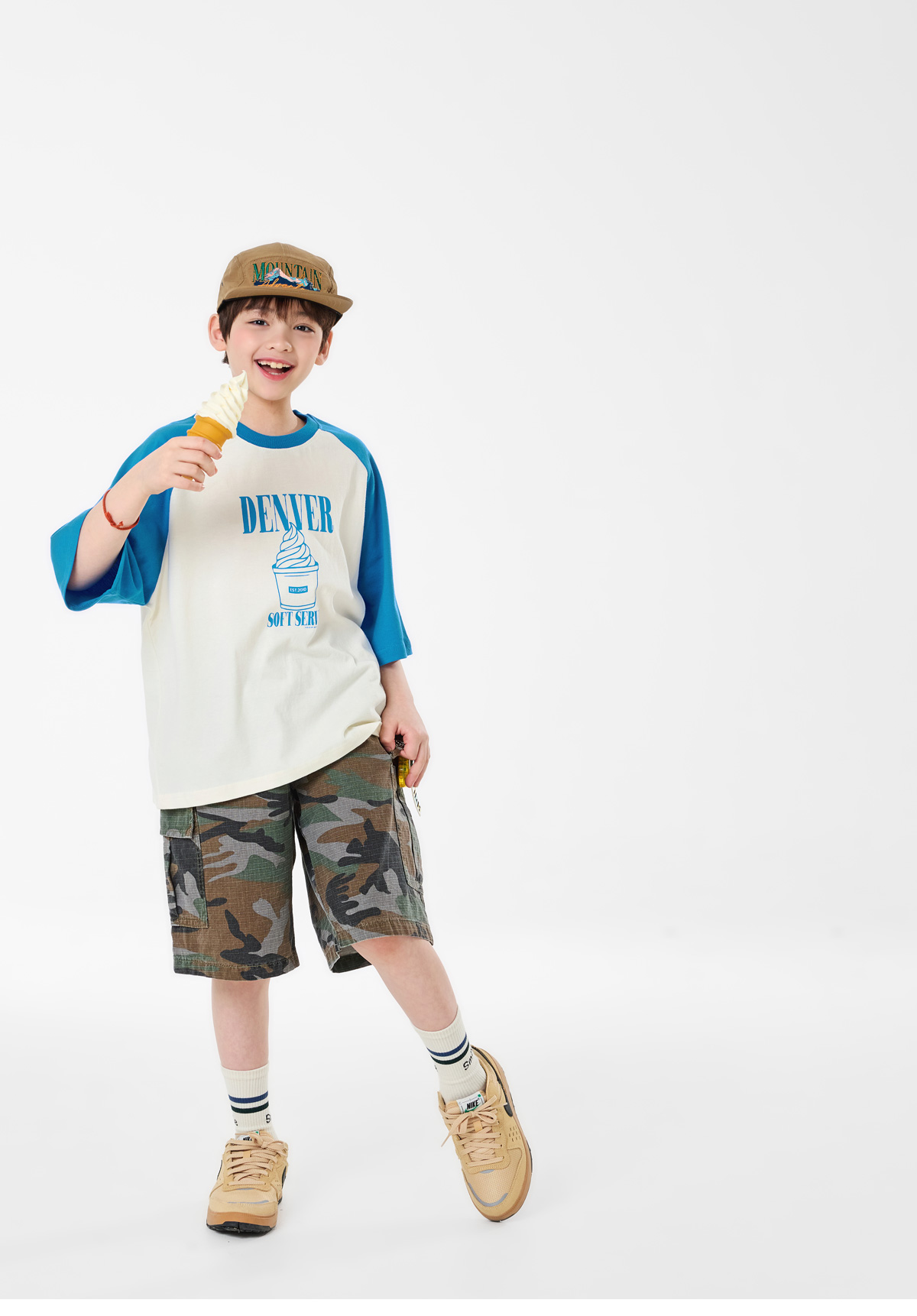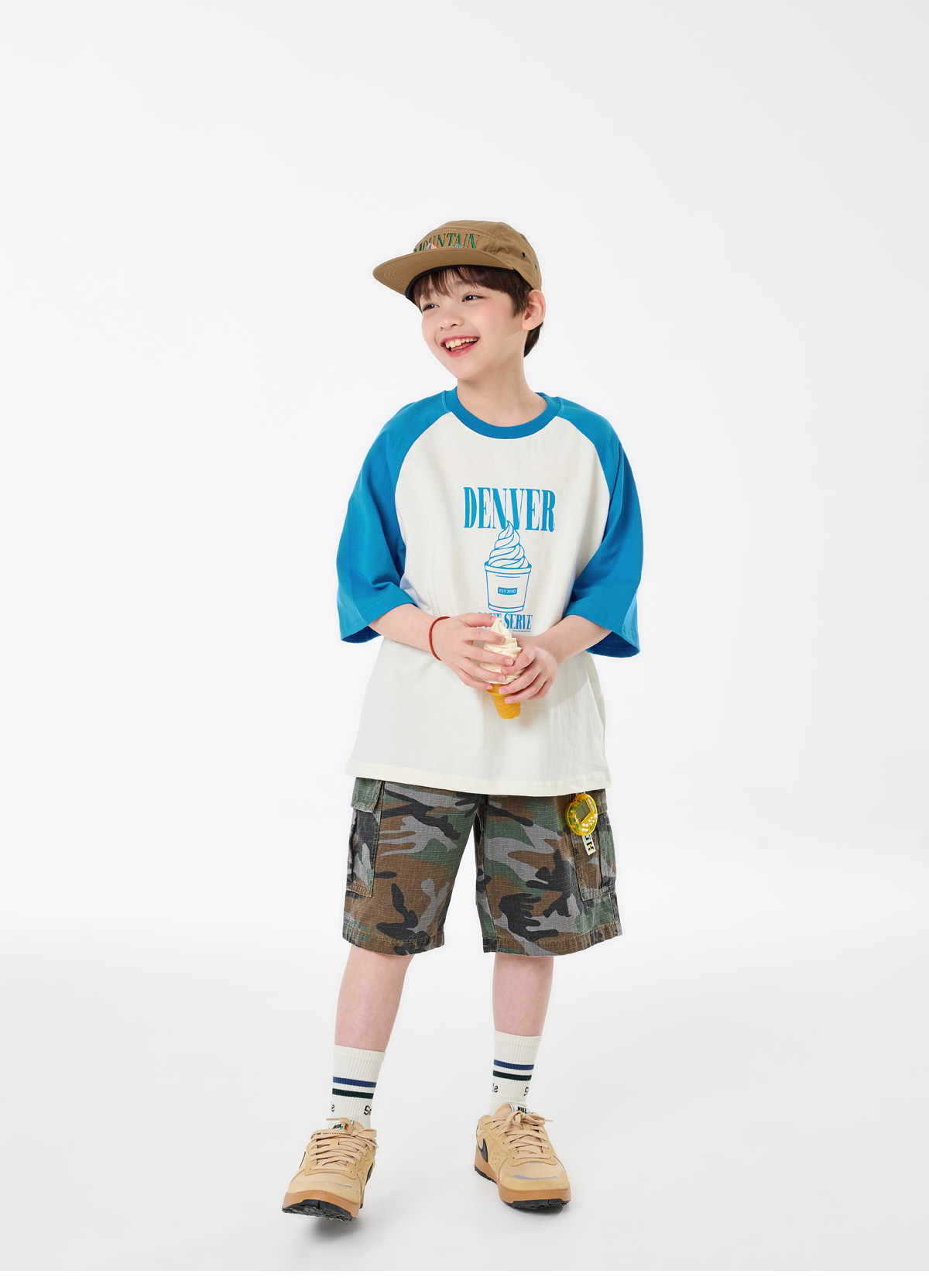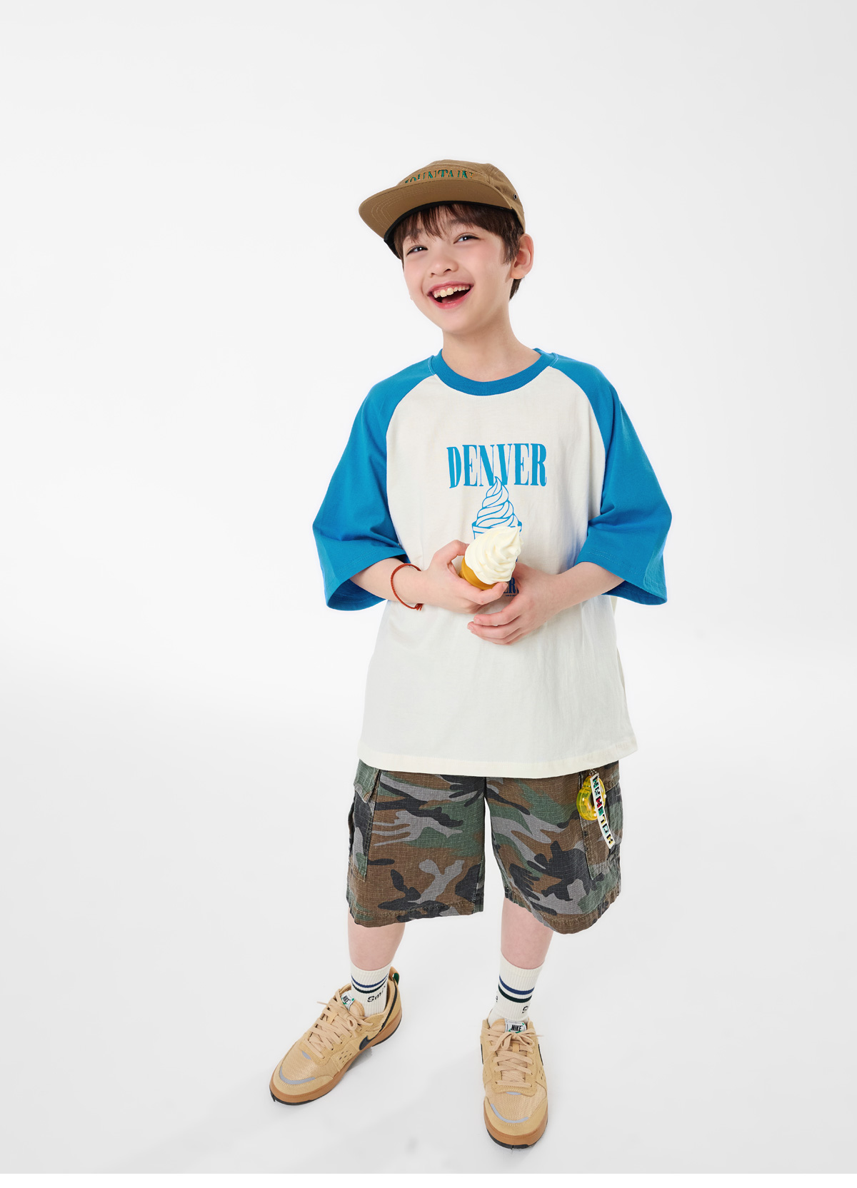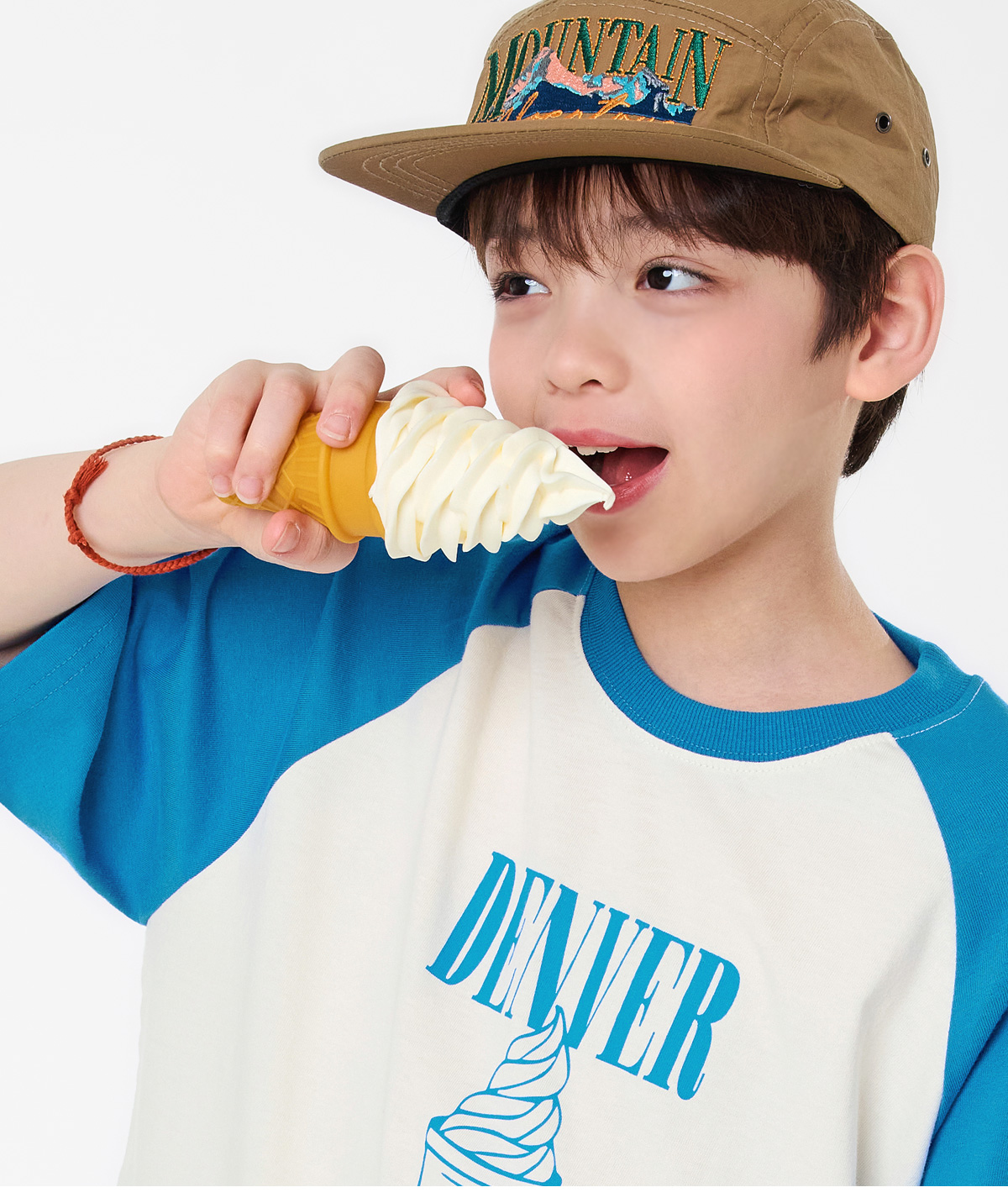 배색 소매가 포인트인 크림 컬러 티셔츠예요.
