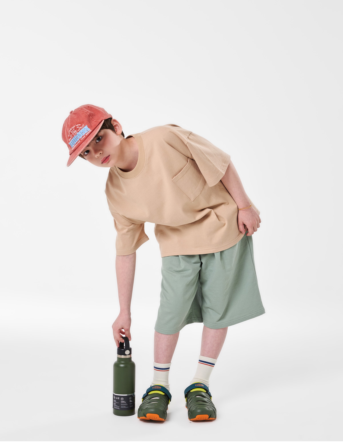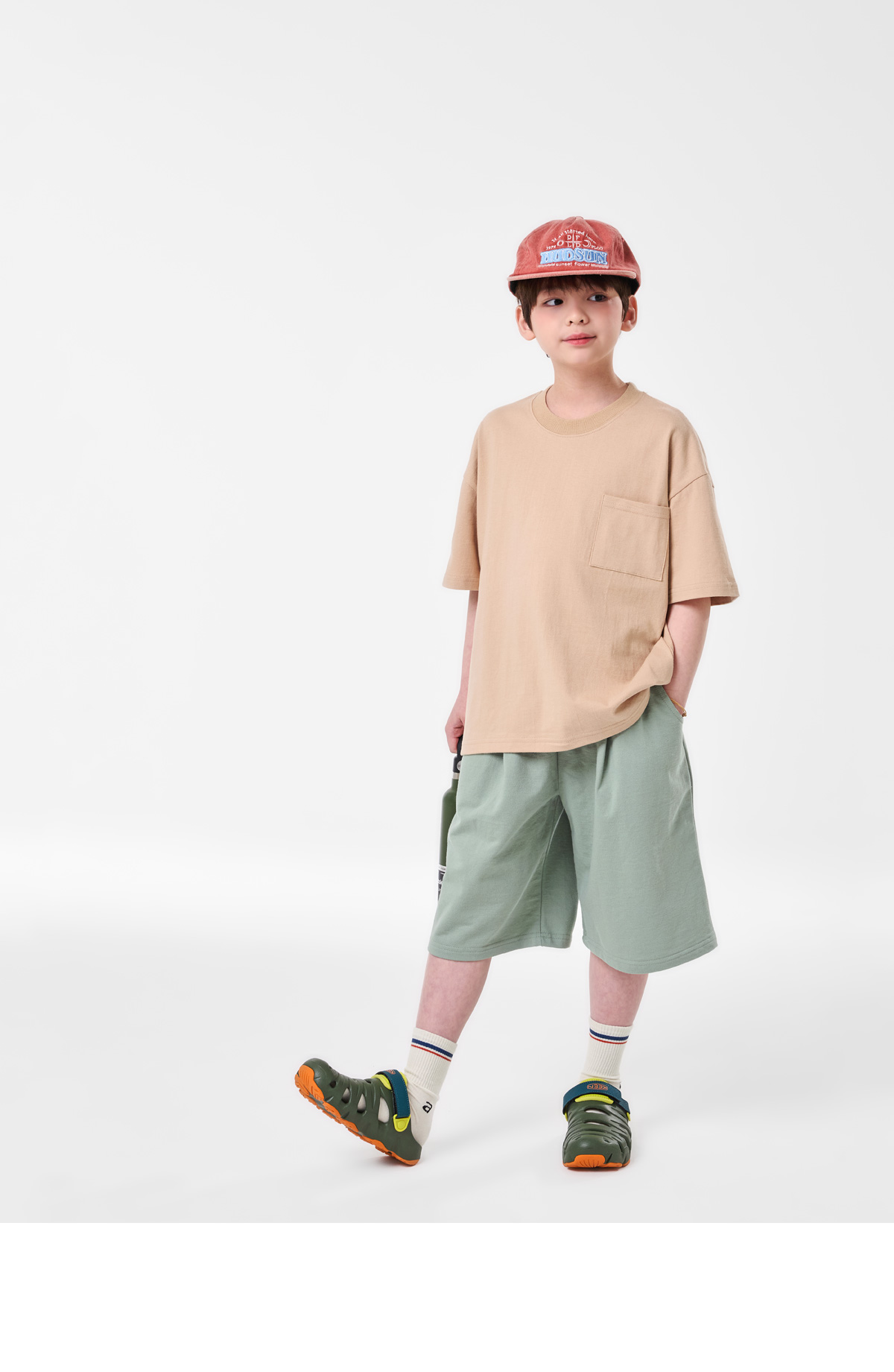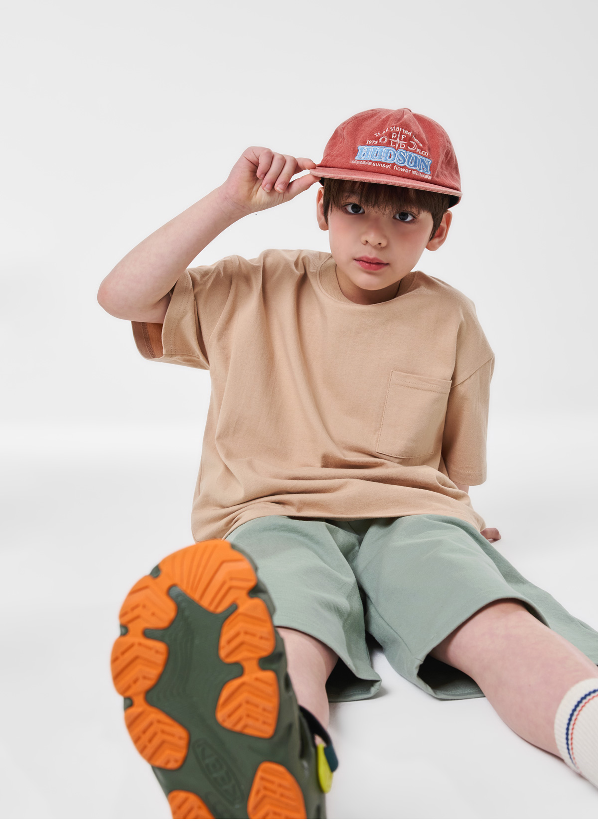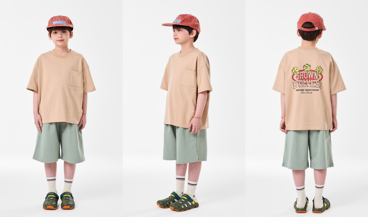 심플한 포켓 디테일과 뒷면 프린팅이 포인트인 베이지 상하세트예요.