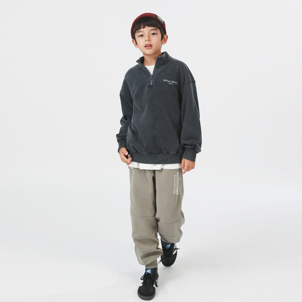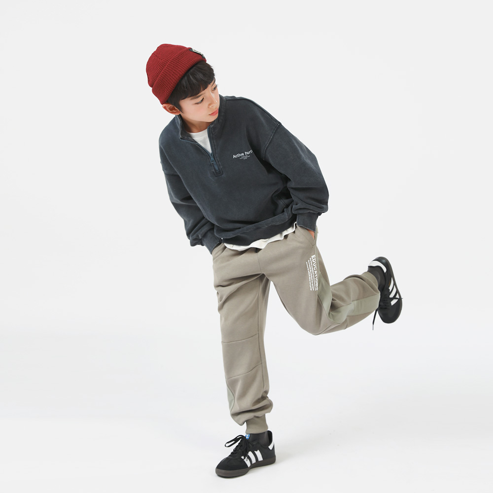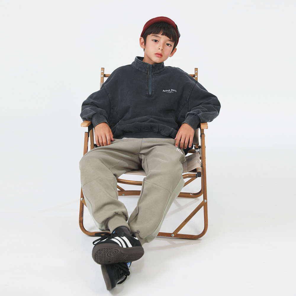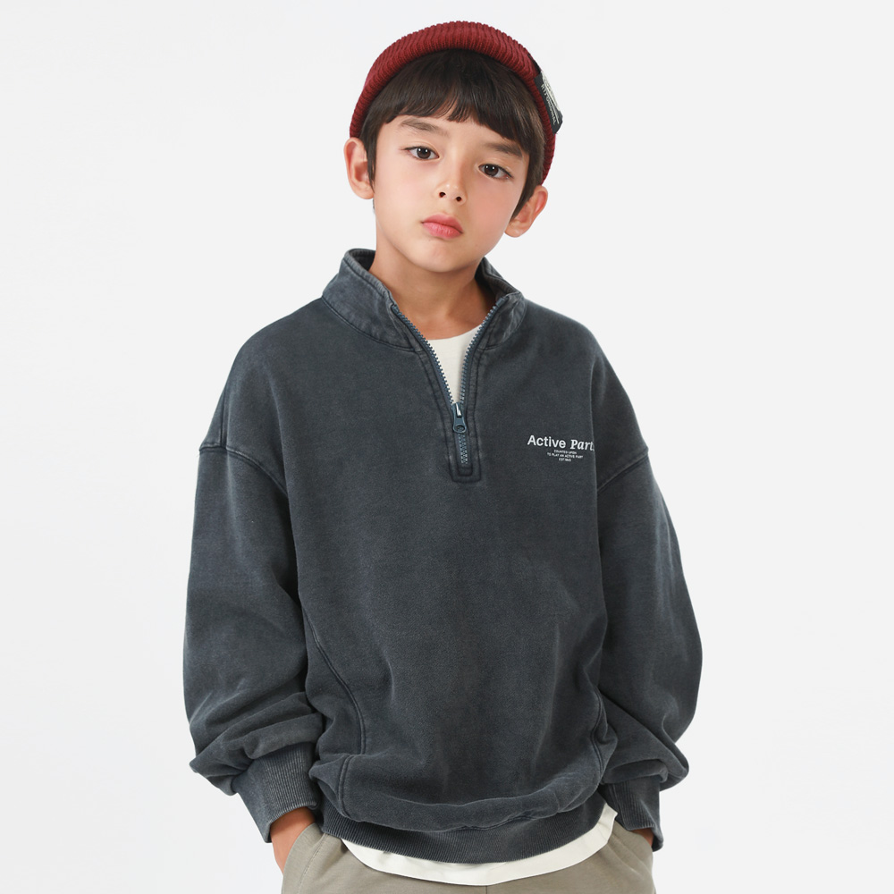 후면 영문 레터링이 돋보이는 반집업 맨투맨이에요 피그먼트 원단으로 내츄럴한 분위기를 연출해준답니다 데일리하게 다양한 하의와 연출하기 좋아요