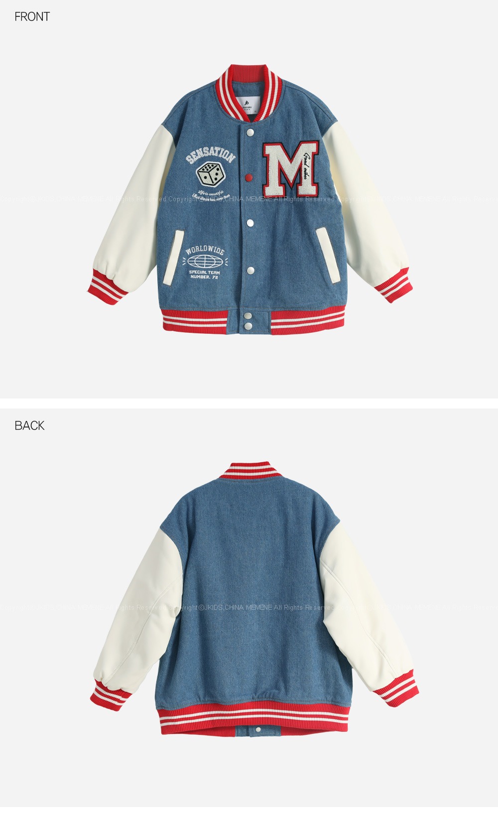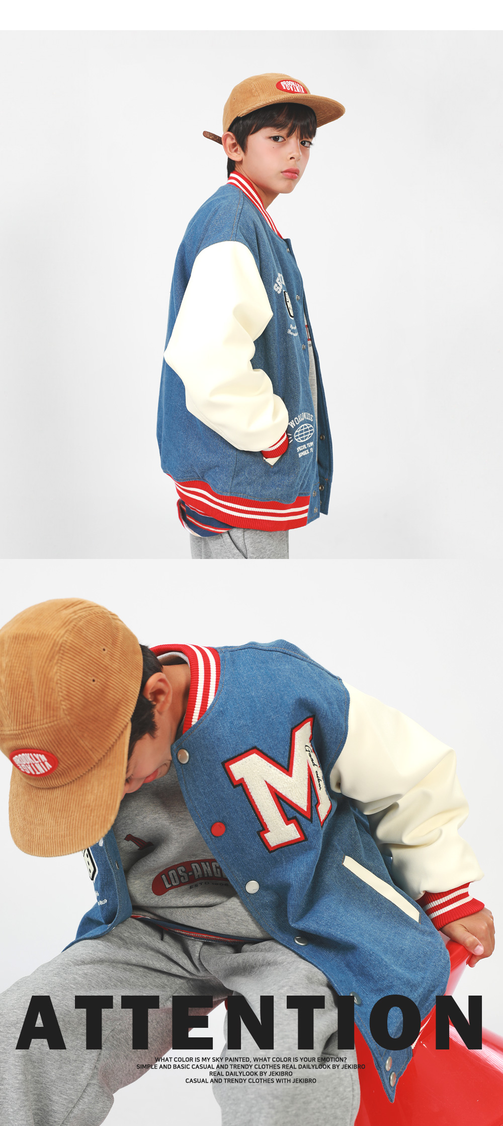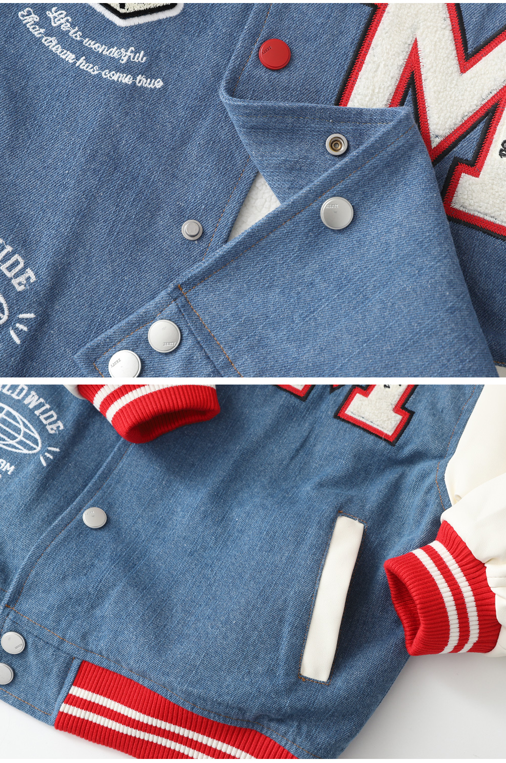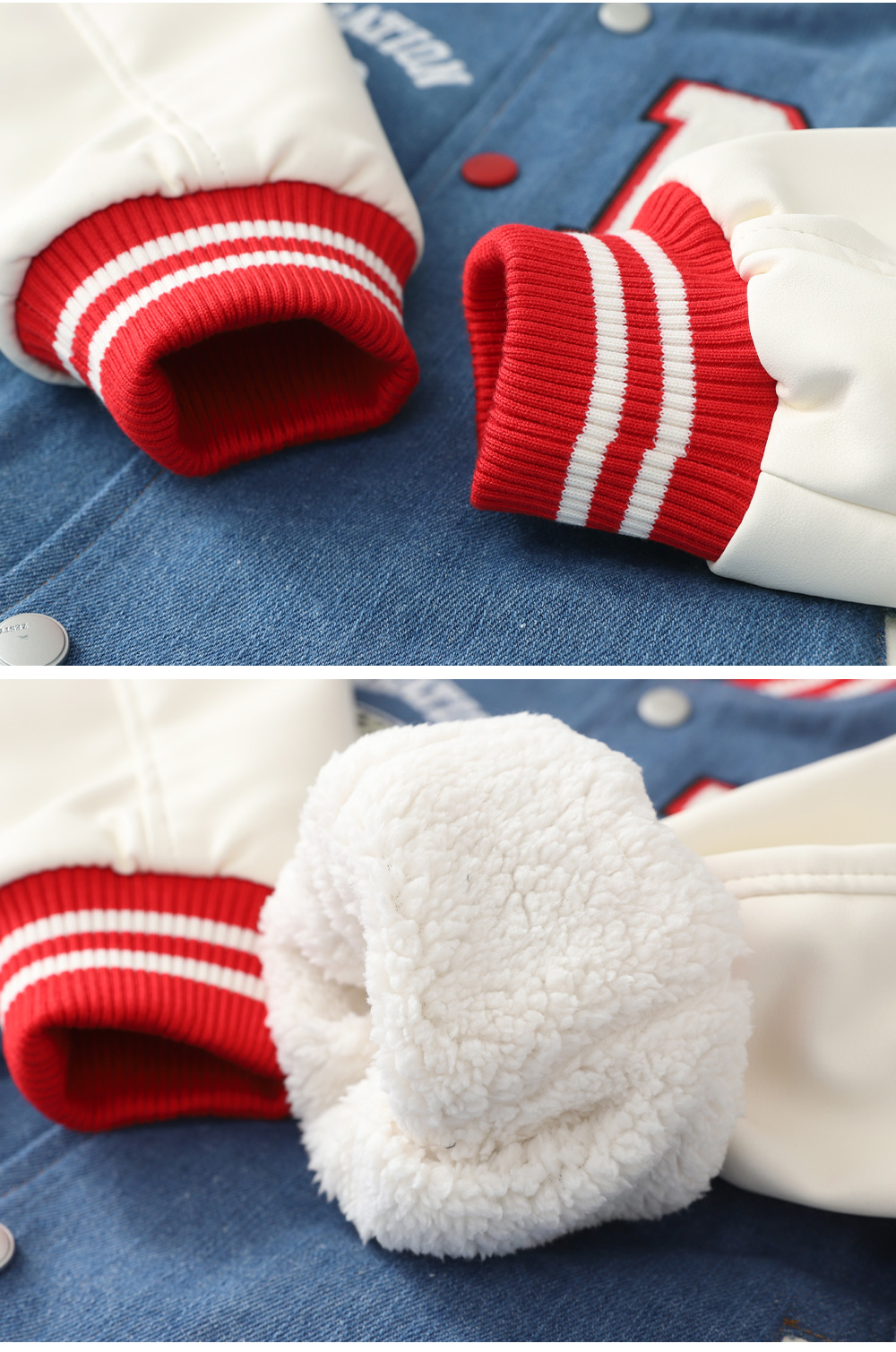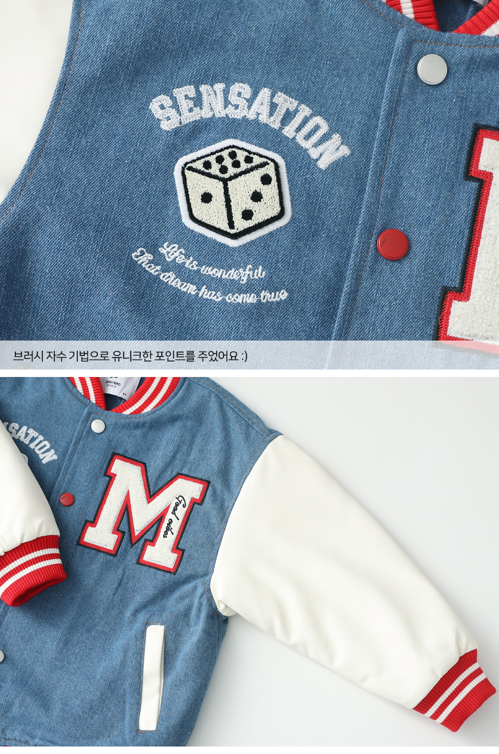 겨울에도 즐기기 좋은 기모 바시티자켓이에요 데님과 페이크레더 조합으로 캐주얼무드의 세련된 스타일을 완성해준답니다 폭신한 퍼기모 안감으로 든든하게 착용할 수 있어요