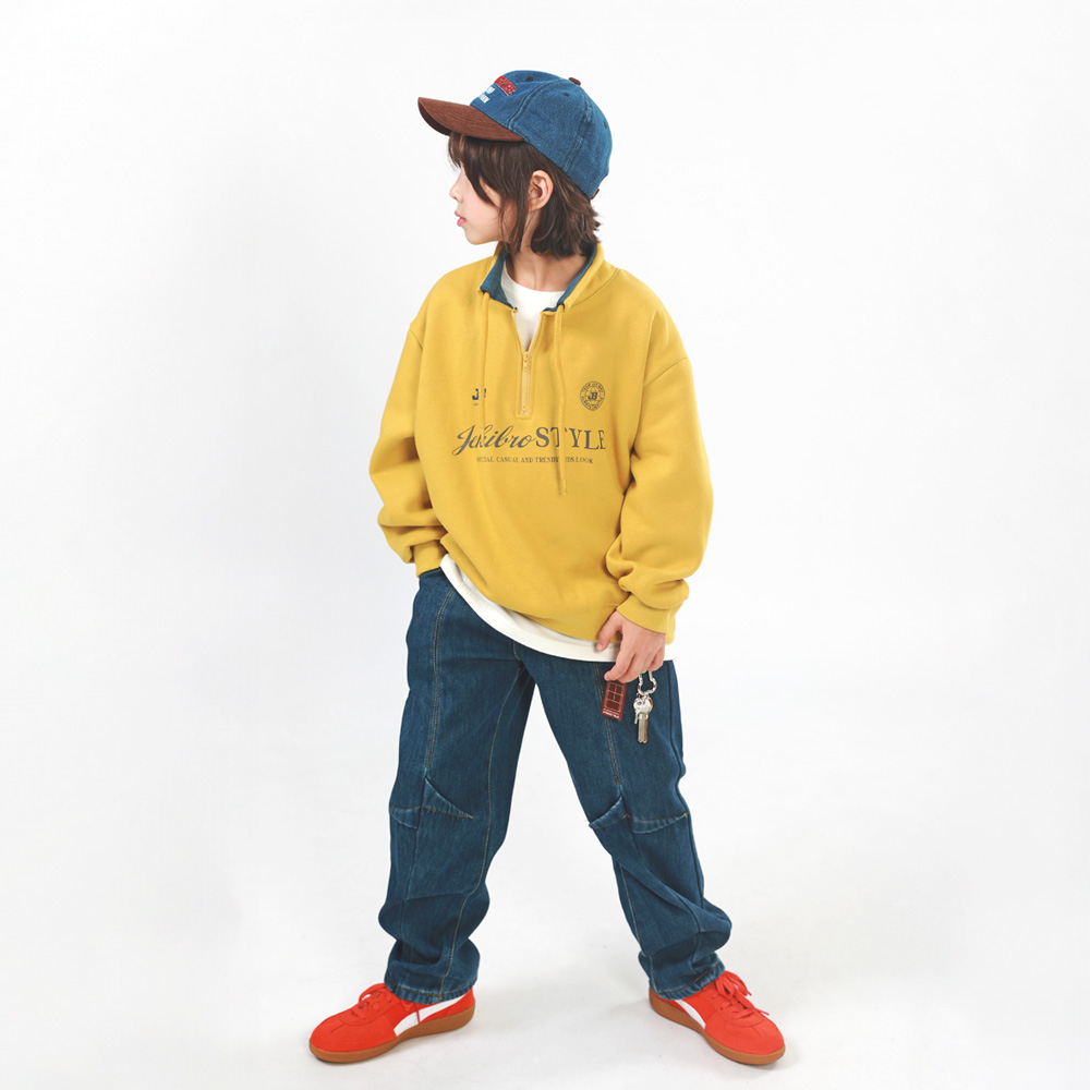 비비드한 머스타드 컬러의 반집업 맨투맨이에요 카라를 따라 스트링이 더해서 캐주얼한 매력을 UP해주었답니다 부드러운 기모 안감으로 따뜻하게 착용하기 좋아요
