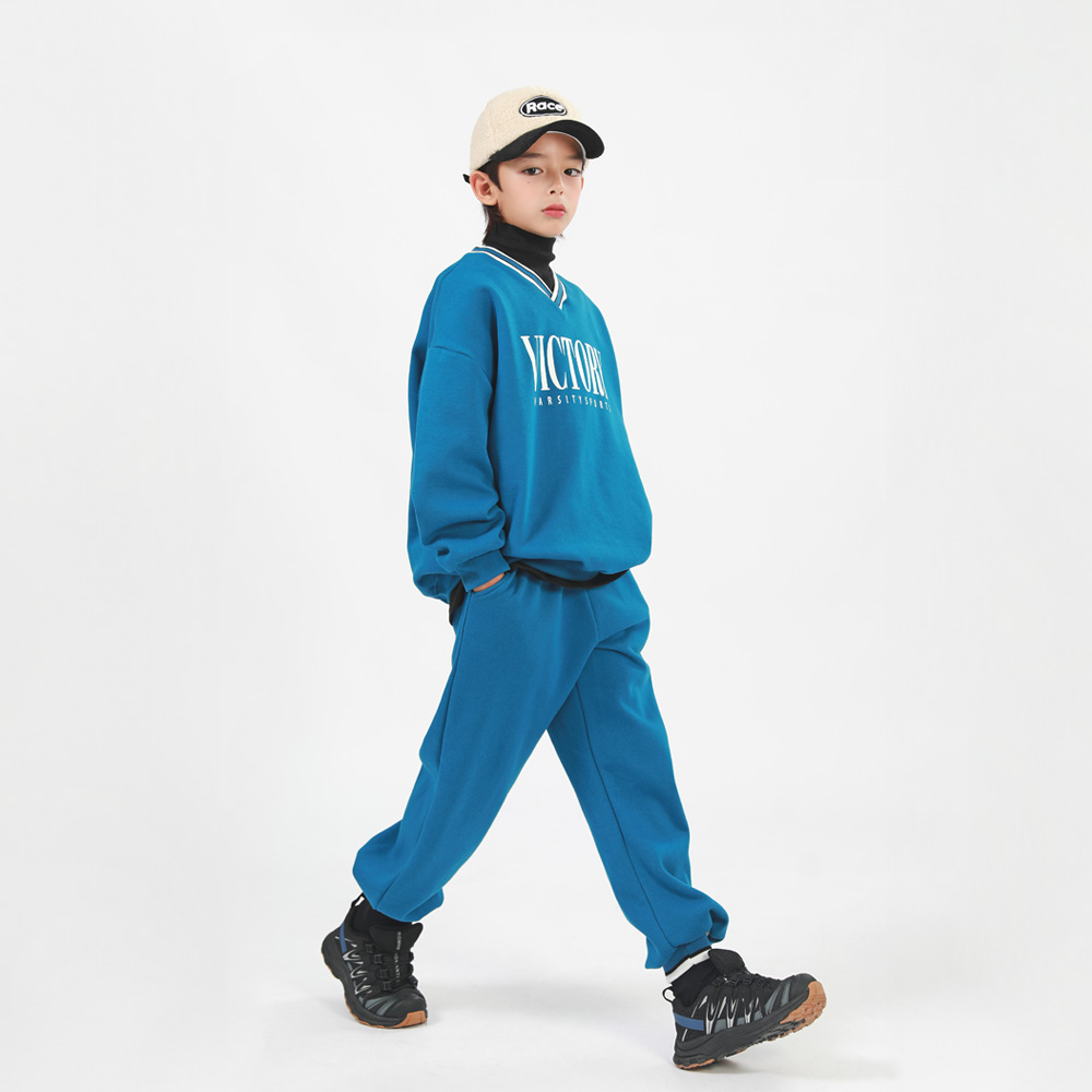 화사하게 입기 좋은 컬러의 기모상하셋업이에요 이너티와 함께해도 답답해보이지 않는 브이넥 맨투맨으로 목이 짧은 아이들도 예쁘게 입기 좋답니다 시보리 마감 조거팬츠는 든든하게 핏을 잡아줄 거에요 :)