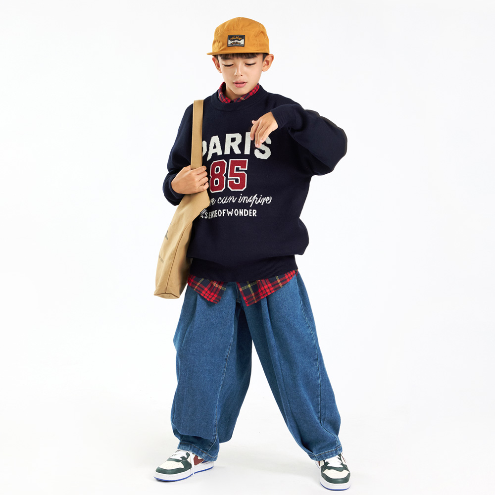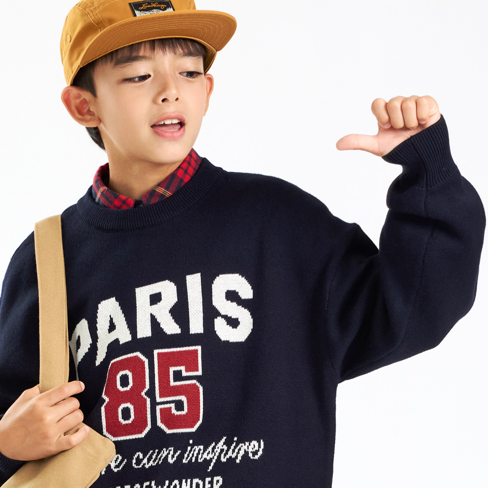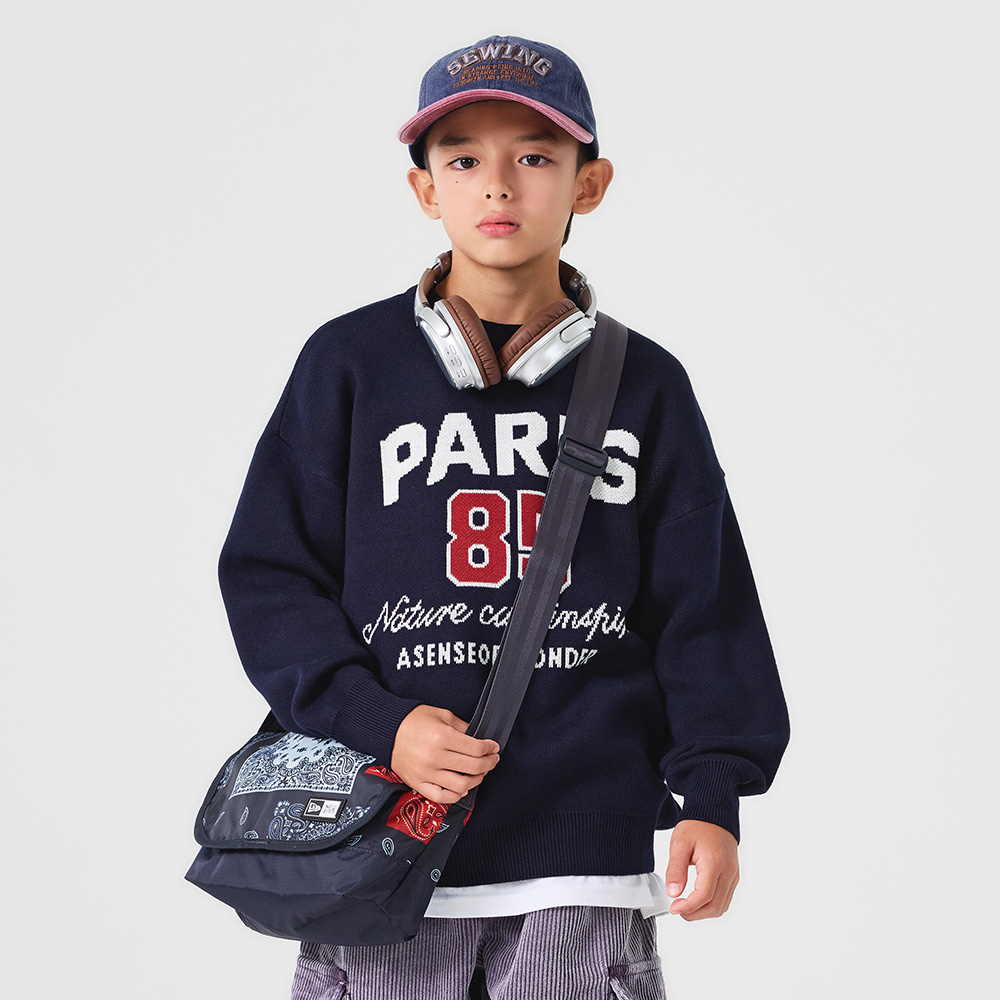 전면 영문과 넘버 디테일이 돋보이는 라운드넥니트