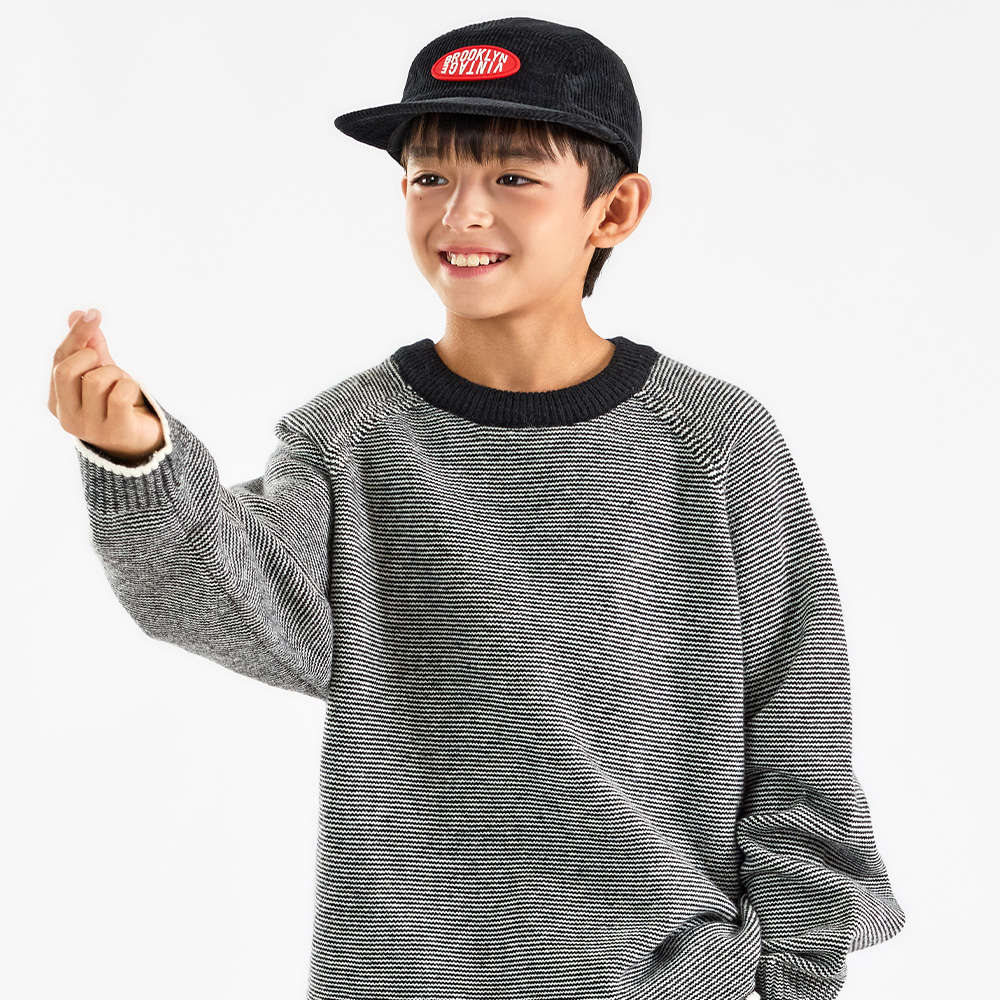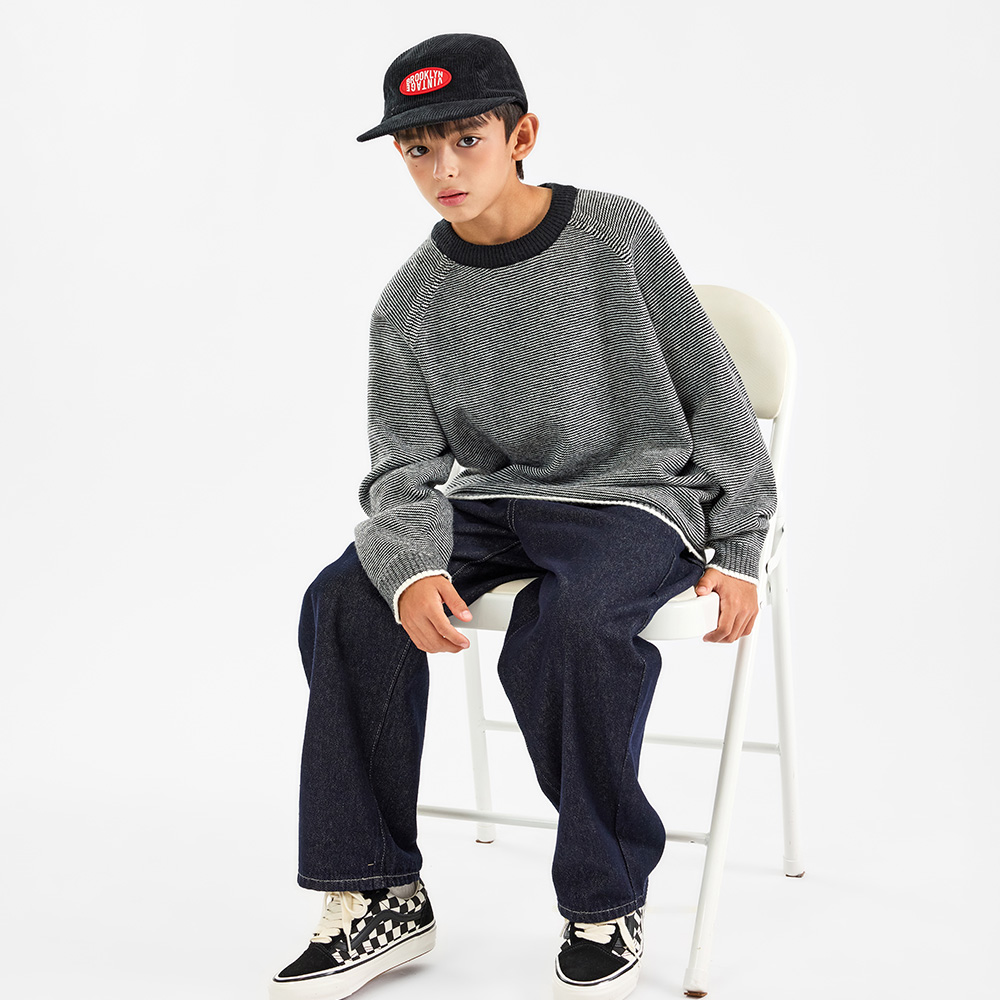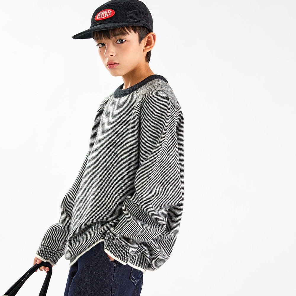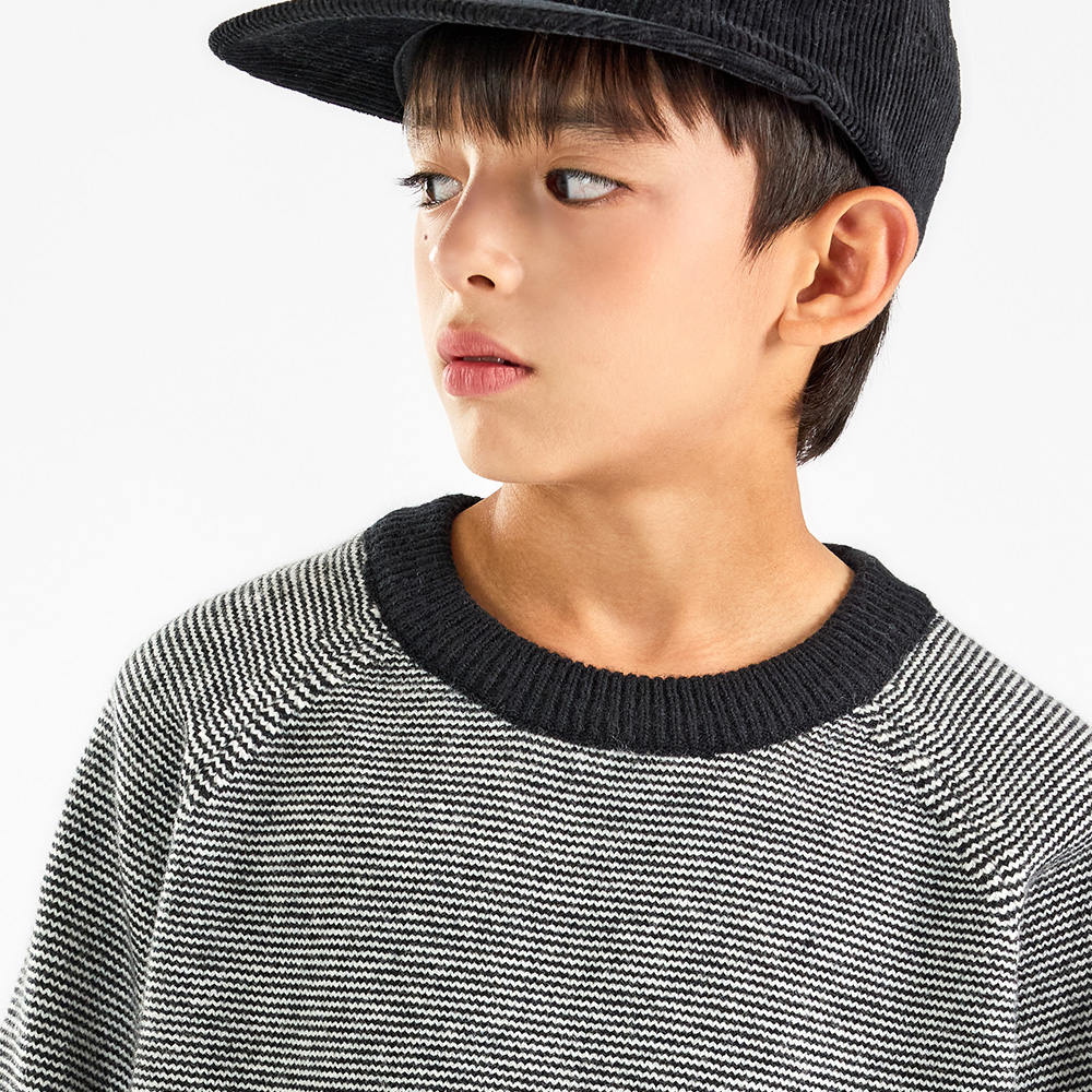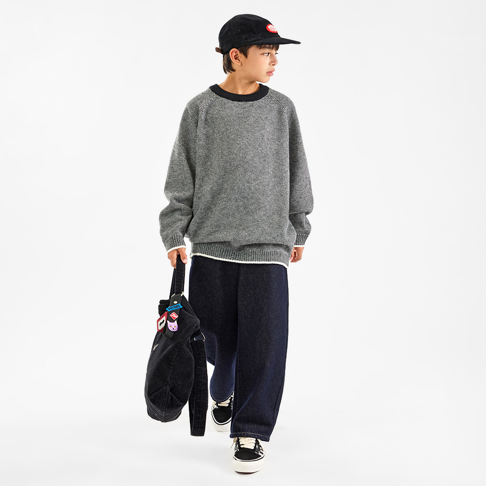 넥라인과 소매단, 밑단은 도톰한 시보리 짜임으로 안정감 있게 마무리되며,