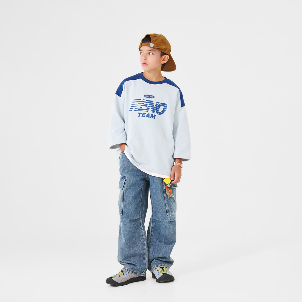 프론트 레터링 프린팅이 더해진 스카이 컬러 티셔츠예요.