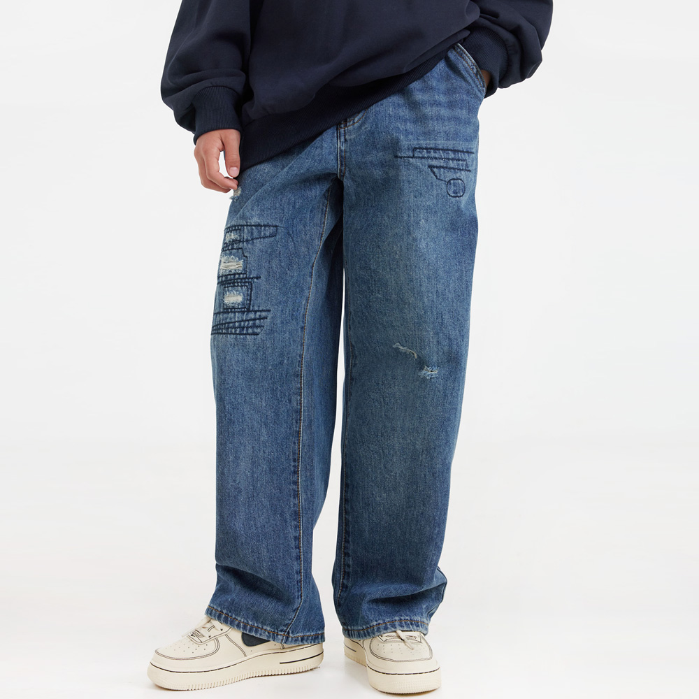 전면 데미지와 스티치 디테일이 돋보이는 데님 팬츠예요