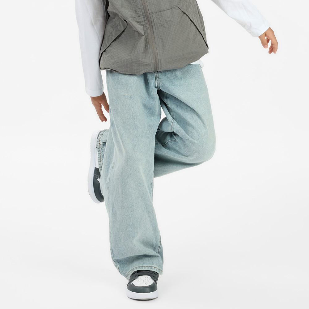 와이드 실루엣으로 편안하게 떨어지는 연청 데님 팬츠예요.