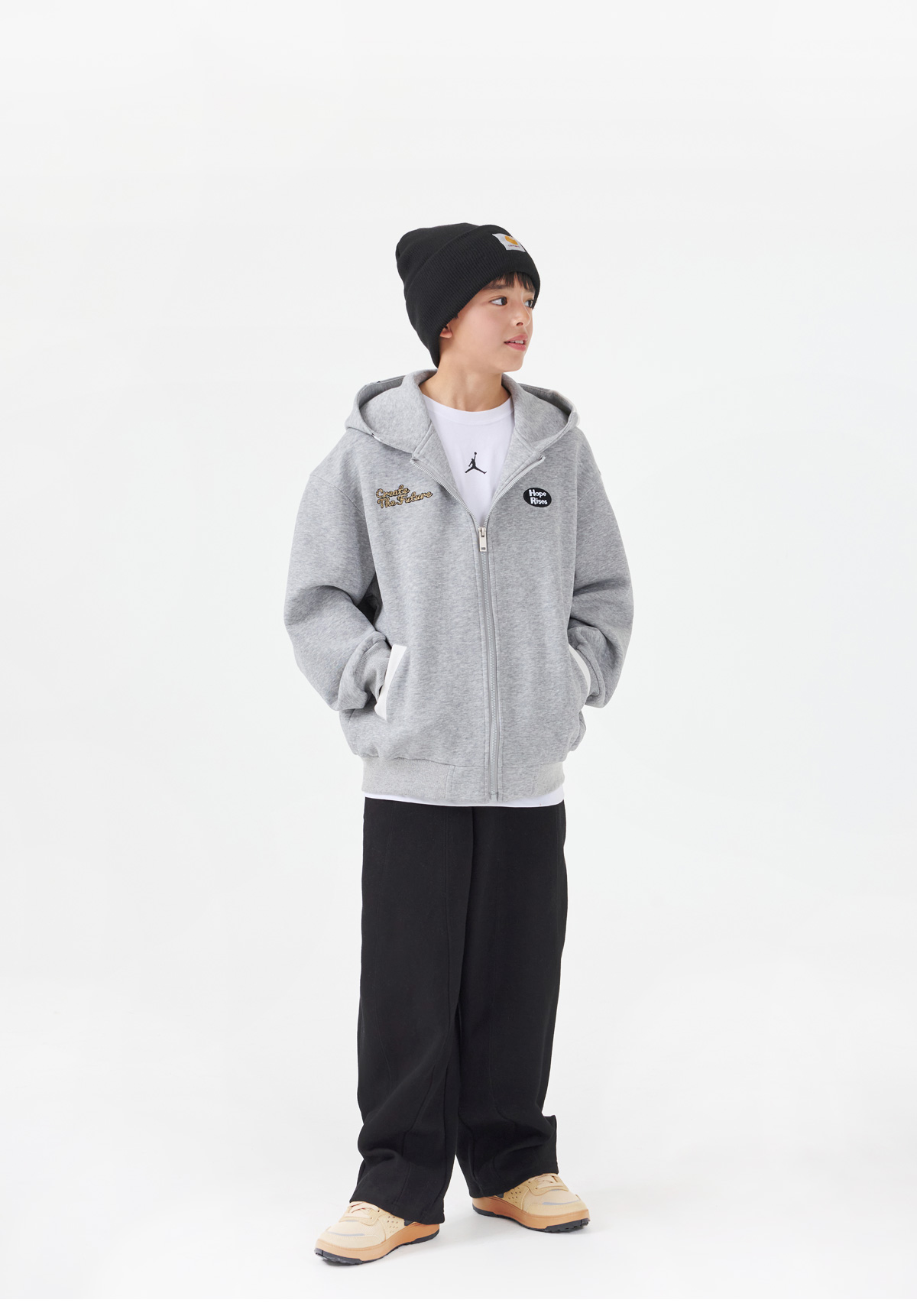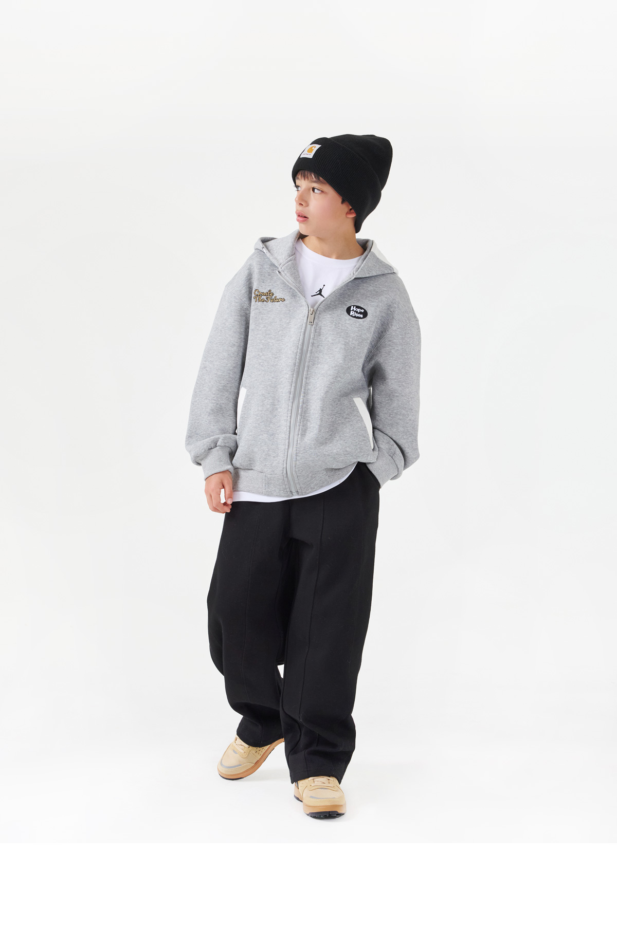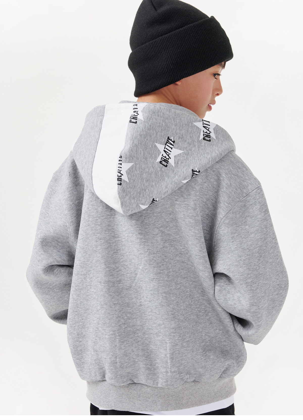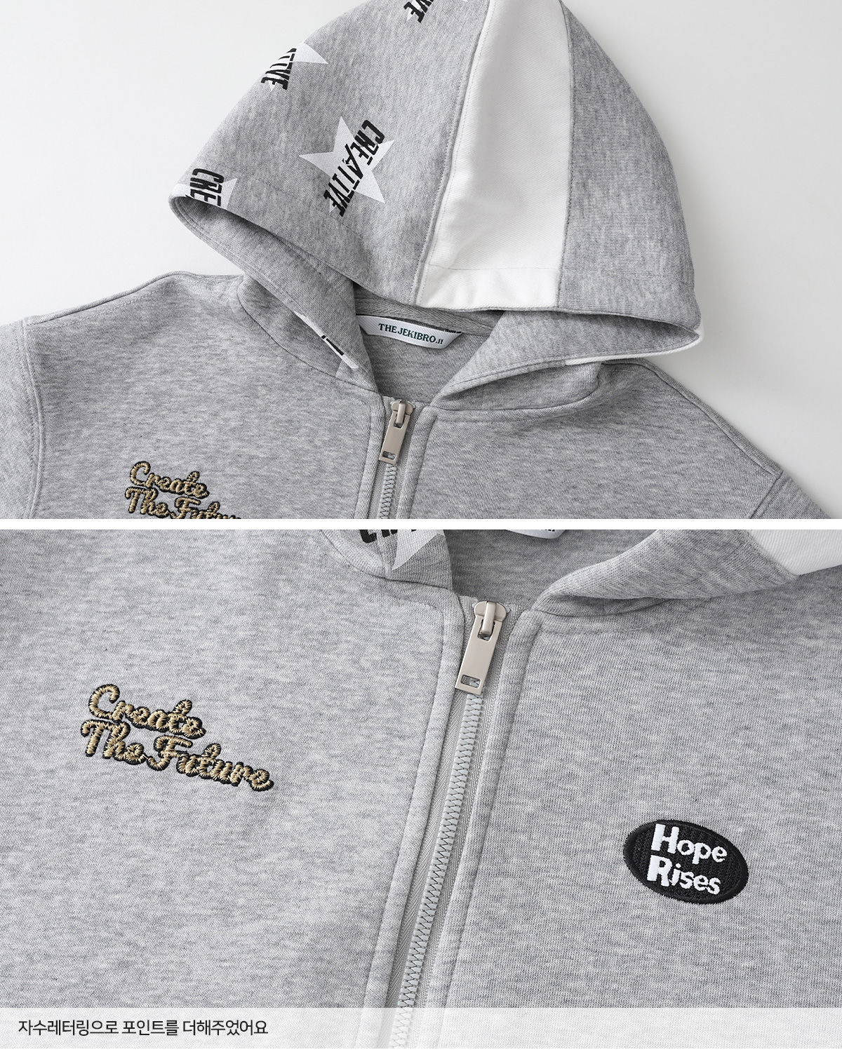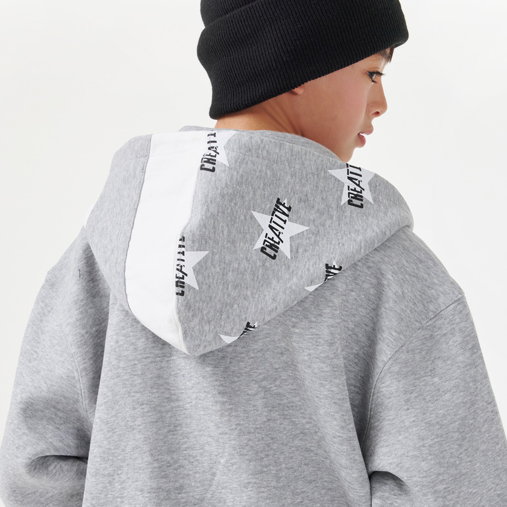 영문 자수 로고와 배색된 후드부분 별나염이 돋보이는 후드 집업이예요