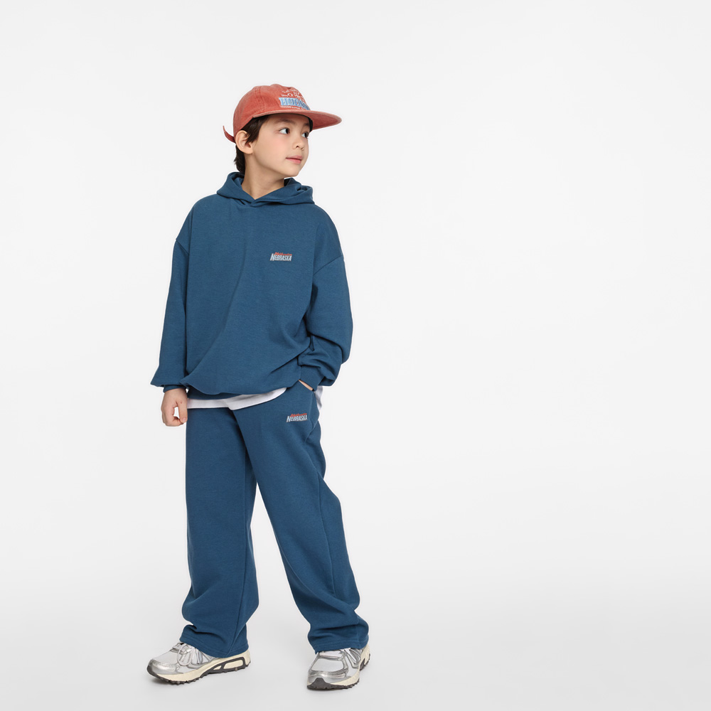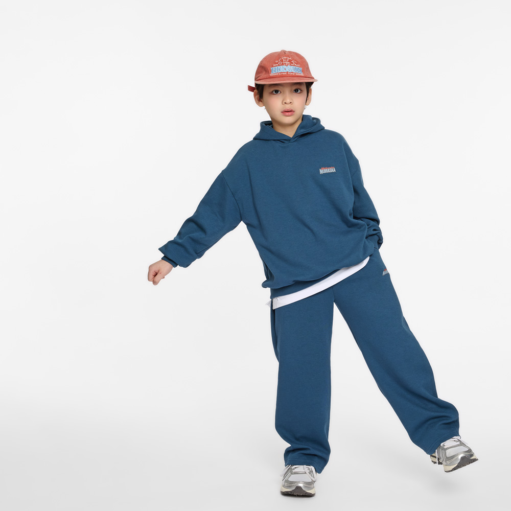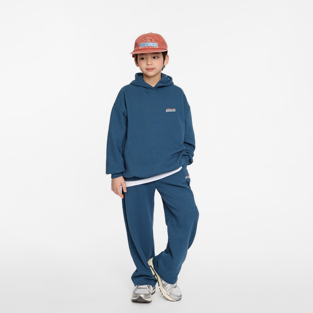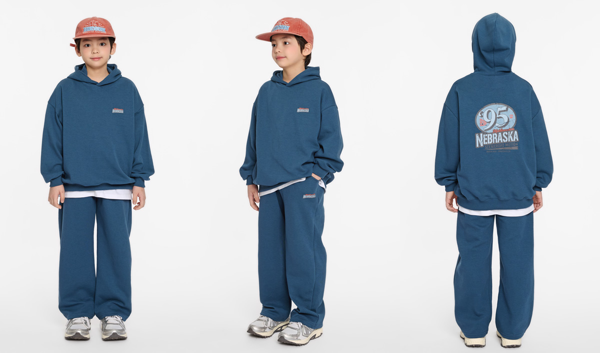 전면 미니 레터링과 백 프린팅이 포인트가 되는 후드 상하세트예요.