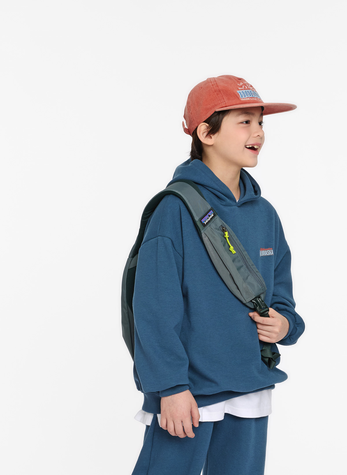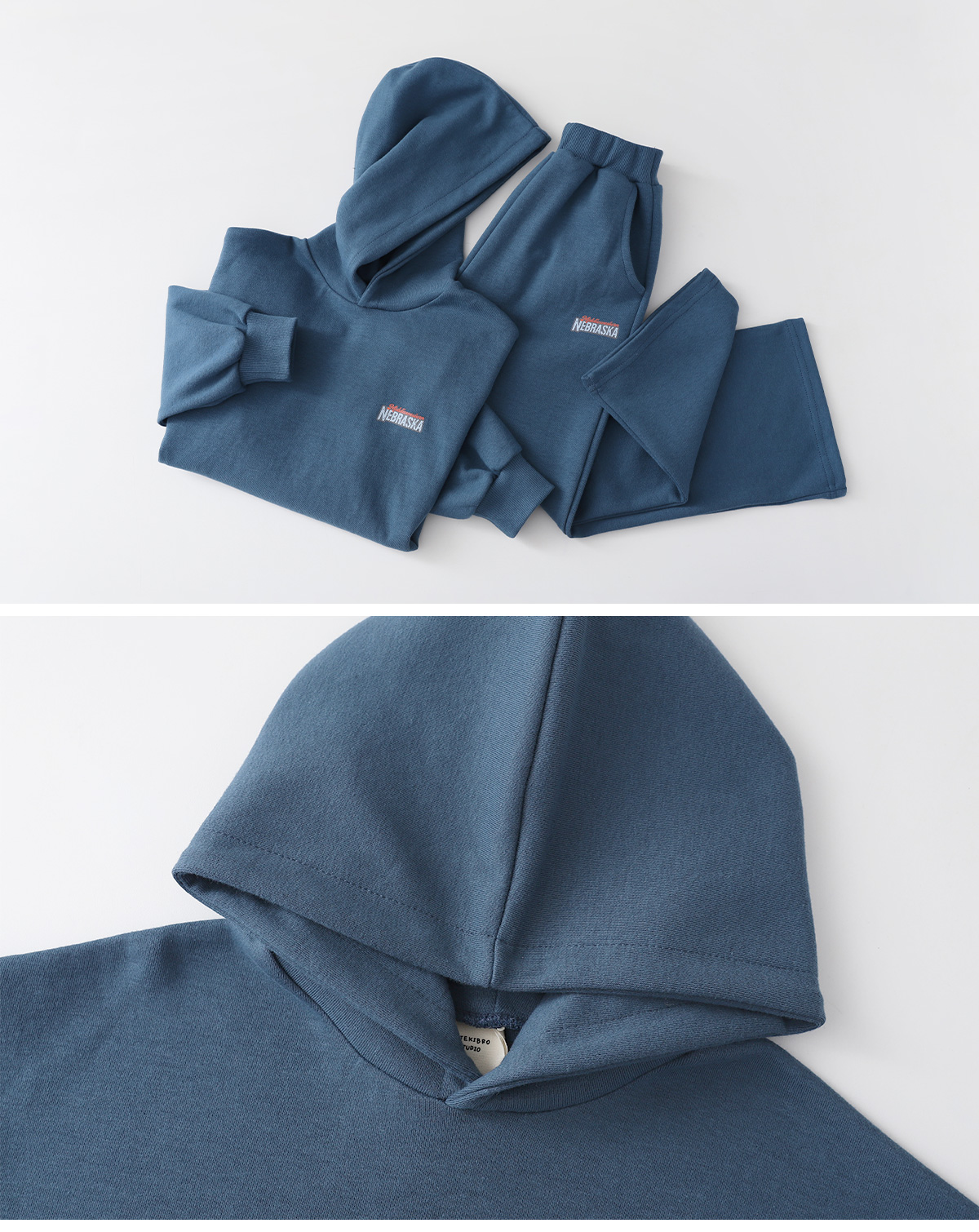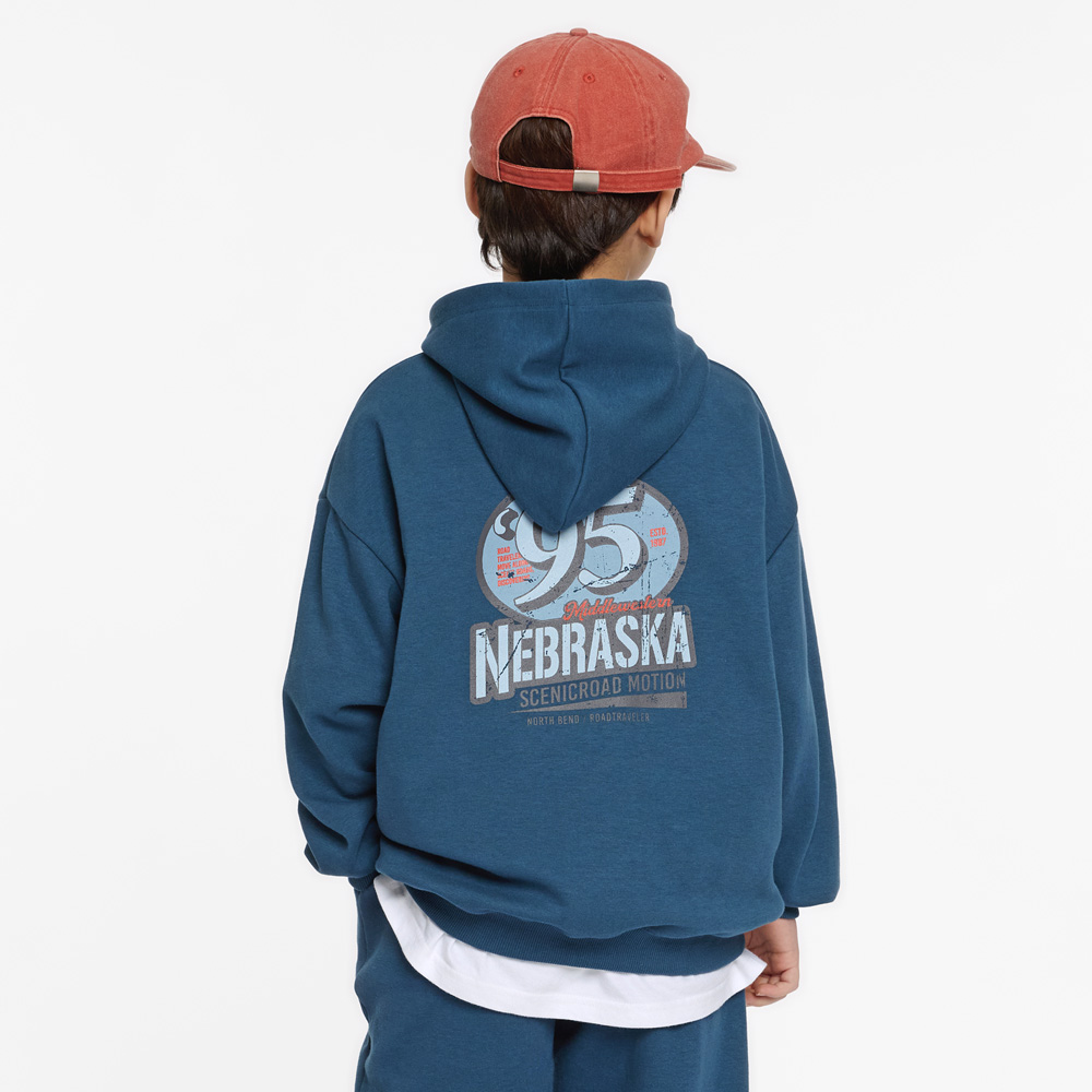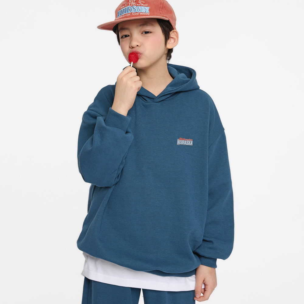 전면 미니 레터링과 백 프린팅이 포인트가 되는 후드 상하세트예요.