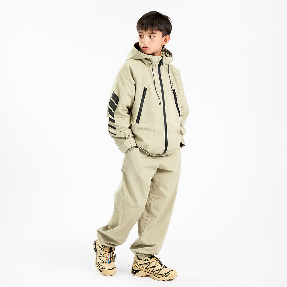 아노락 느낌의 후드 집업과 일자핏 팬츠 구성으로