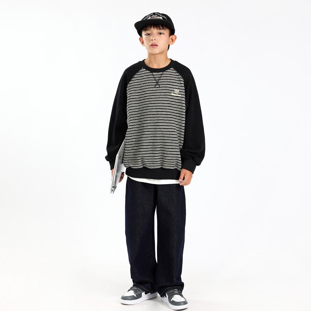 스트라이프 원단과 배색 소매가 조화를 이루는 맨투맨이에요.