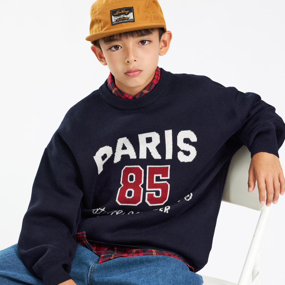 전면 영문과 넘버 디테일이 돋보이는 라운드넥니트