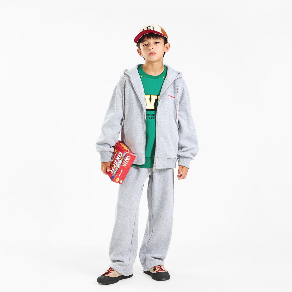 하의는 밑단 시보리 없이 떨어지는 와이드 실루엣으로 활동성이 좋아요.
