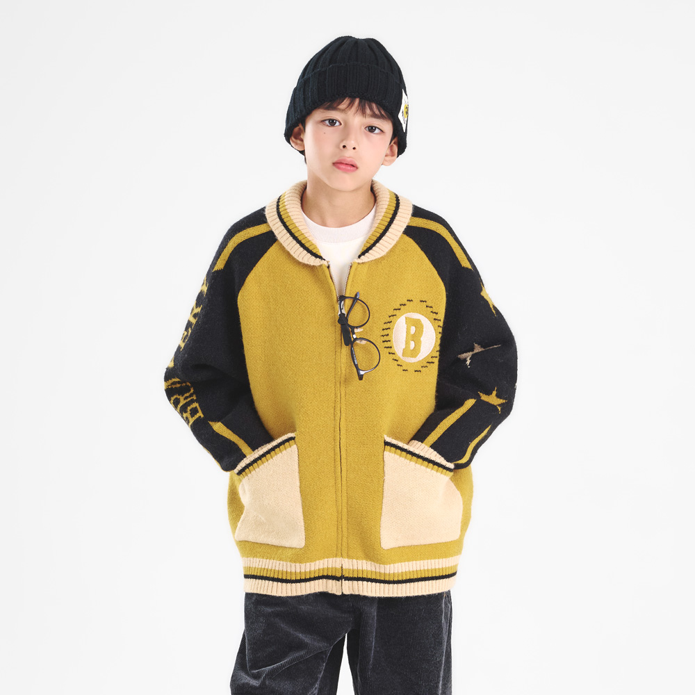 스타 그래픽과 배색 포인트가 돋보이는 머스타드 컬러 니트 집업이에요.