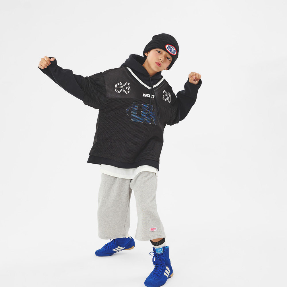 스포티한 메시 티셔츠 위로 후디를 더한 유니크한 레이어드 디자인이에요.