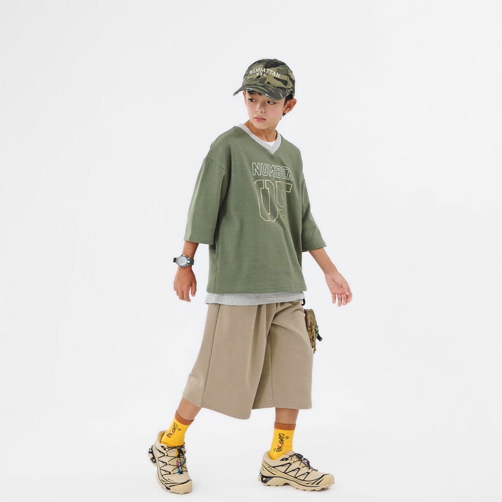 브이넥 라인이 포인트인 카키 컬러의 반팔 티셔츠예요.