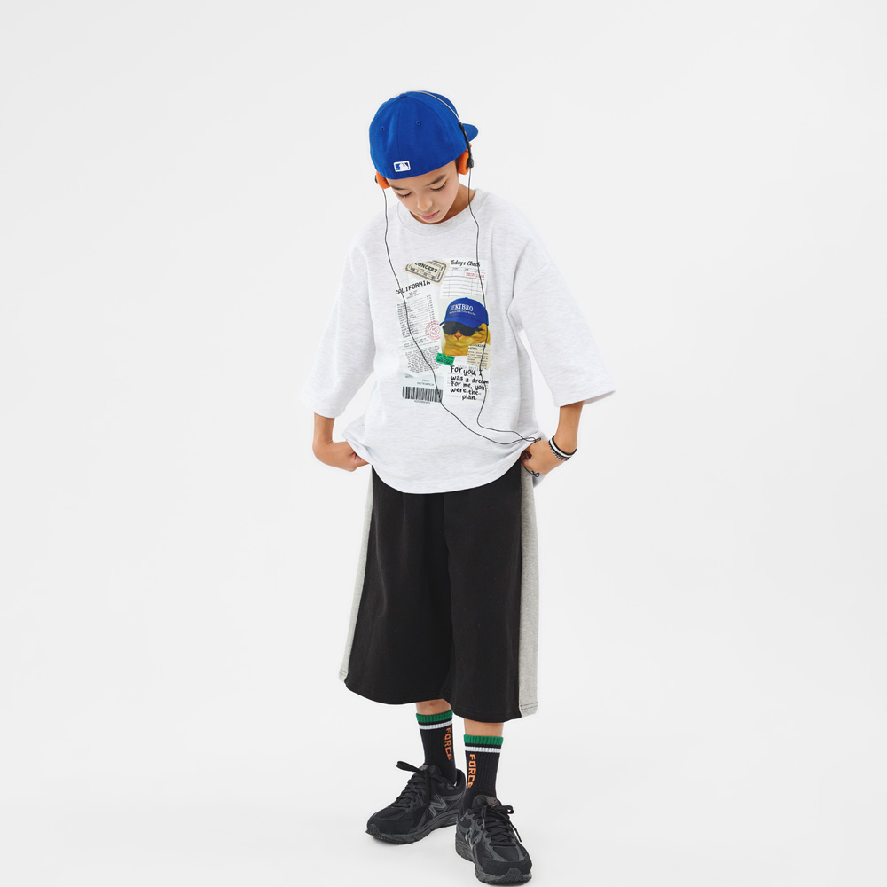 화이트 멜란지 컬러에 감각적인 프린팅이 돋보이는 반팔 티셔츠예요.