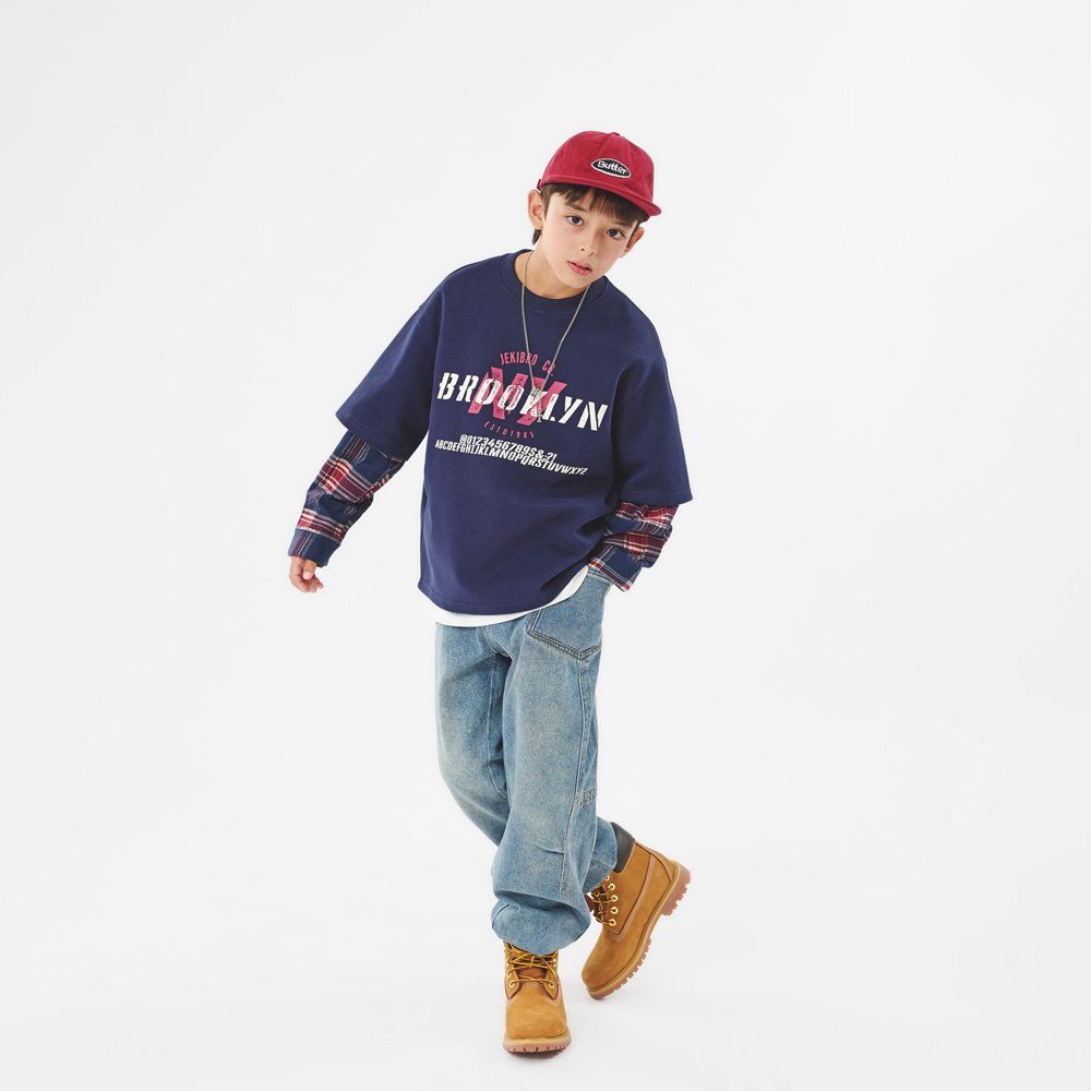 네이비 컬러에 체크 셔츠 소매가 더해진 레이어드 티셔츠예요.