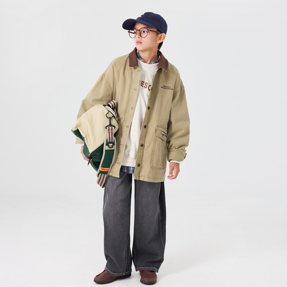 코듀로이 배색 카라와 전면 레터링 자수가 포인트인 코튼 자켓이에요.