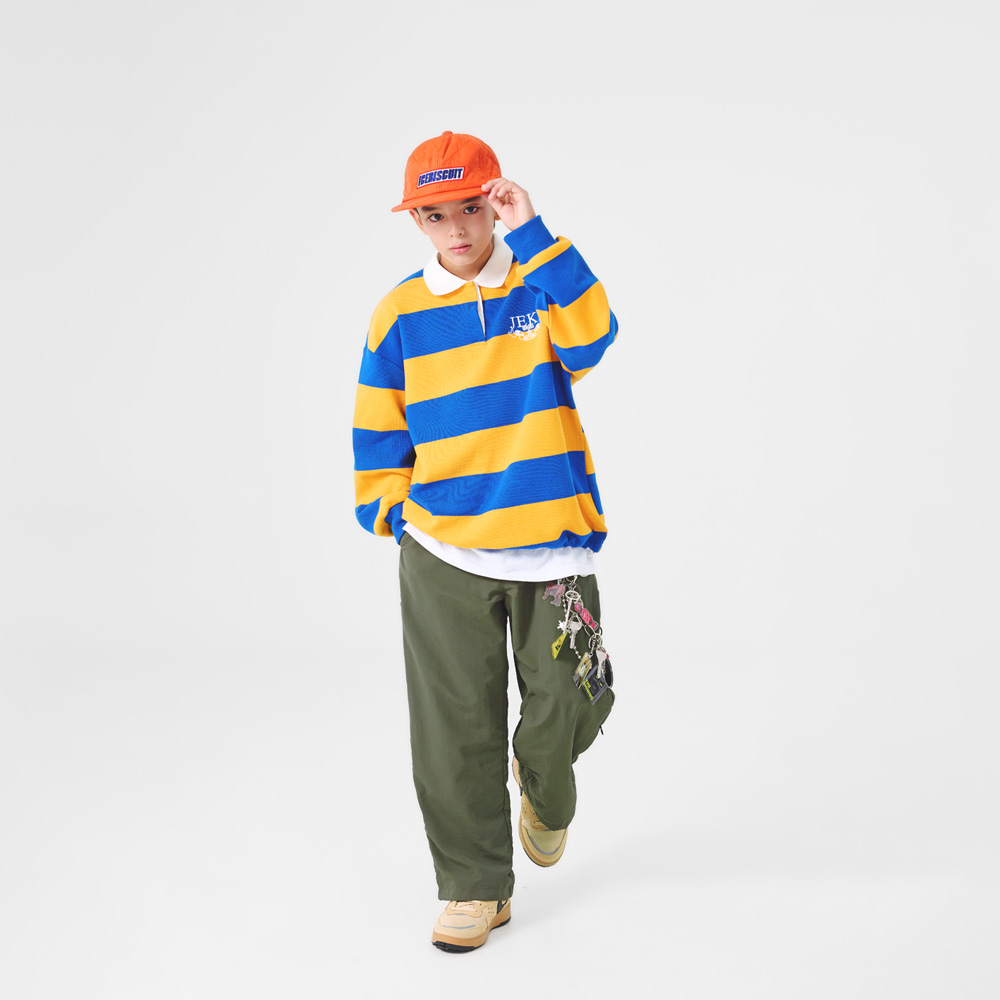 비비드한 블루와 옐로우 스트라이프가 시선을 끄는 카라 티셔츠예요.